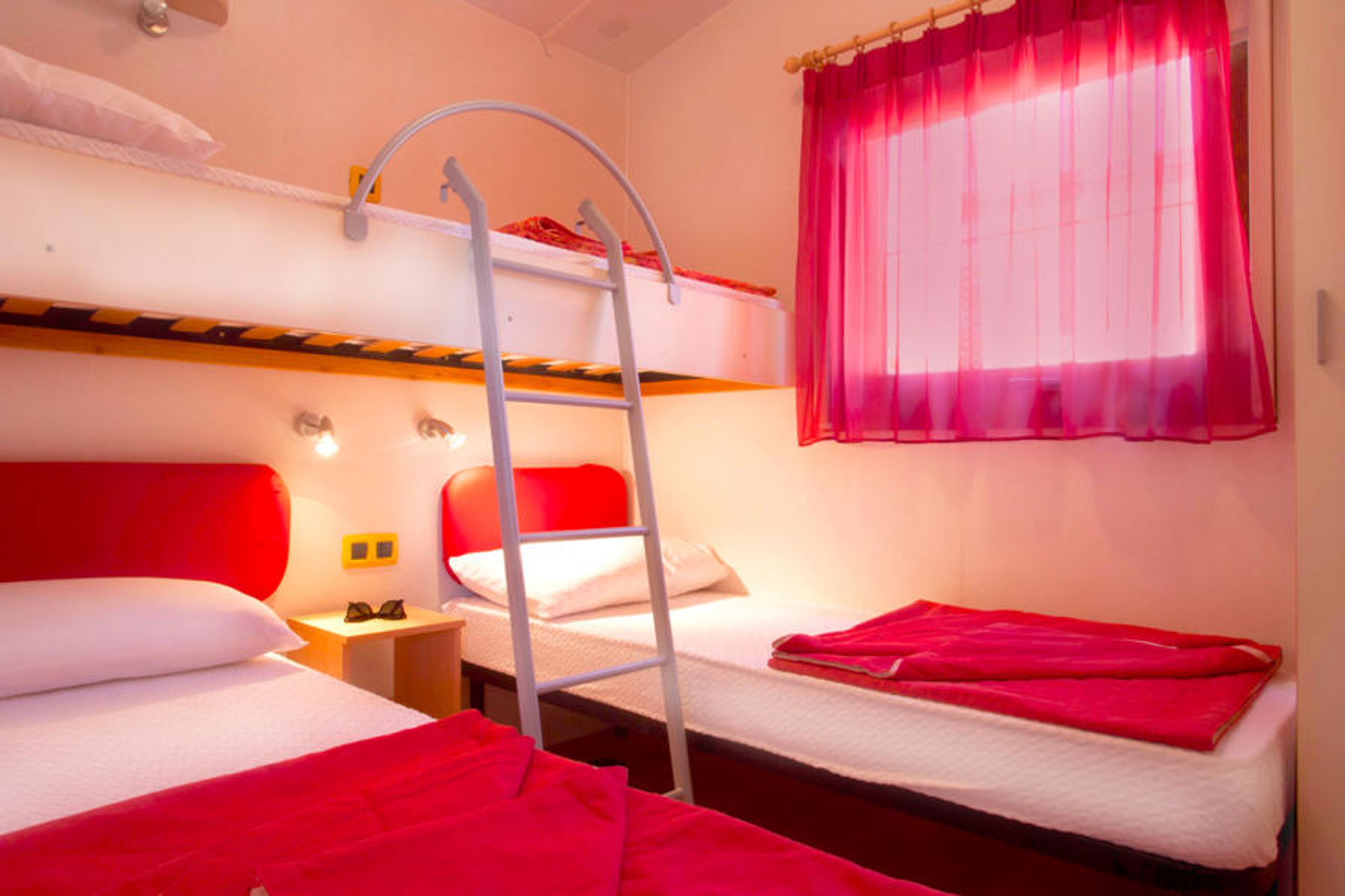 "Baia Lux", 3-room mobile home 31 m2. Practical furnishings: living/dining room with dining table and digital TV. 1 room with 1 french bed (140 cm). 1 room with 2 beds (70 cm), 1 x 1 bunk beds (65 cm, length 180 cm). Kitchenette (4 gas rings, freezer). Shower/bidet/WC. Air-conditioning, forced-air heating (extra). Patio partly roofed. Parking (1 car). Please note: non-smokers only. Maximum 2 small pets/ dogs allowed. IT090054B1XZPBSXF7