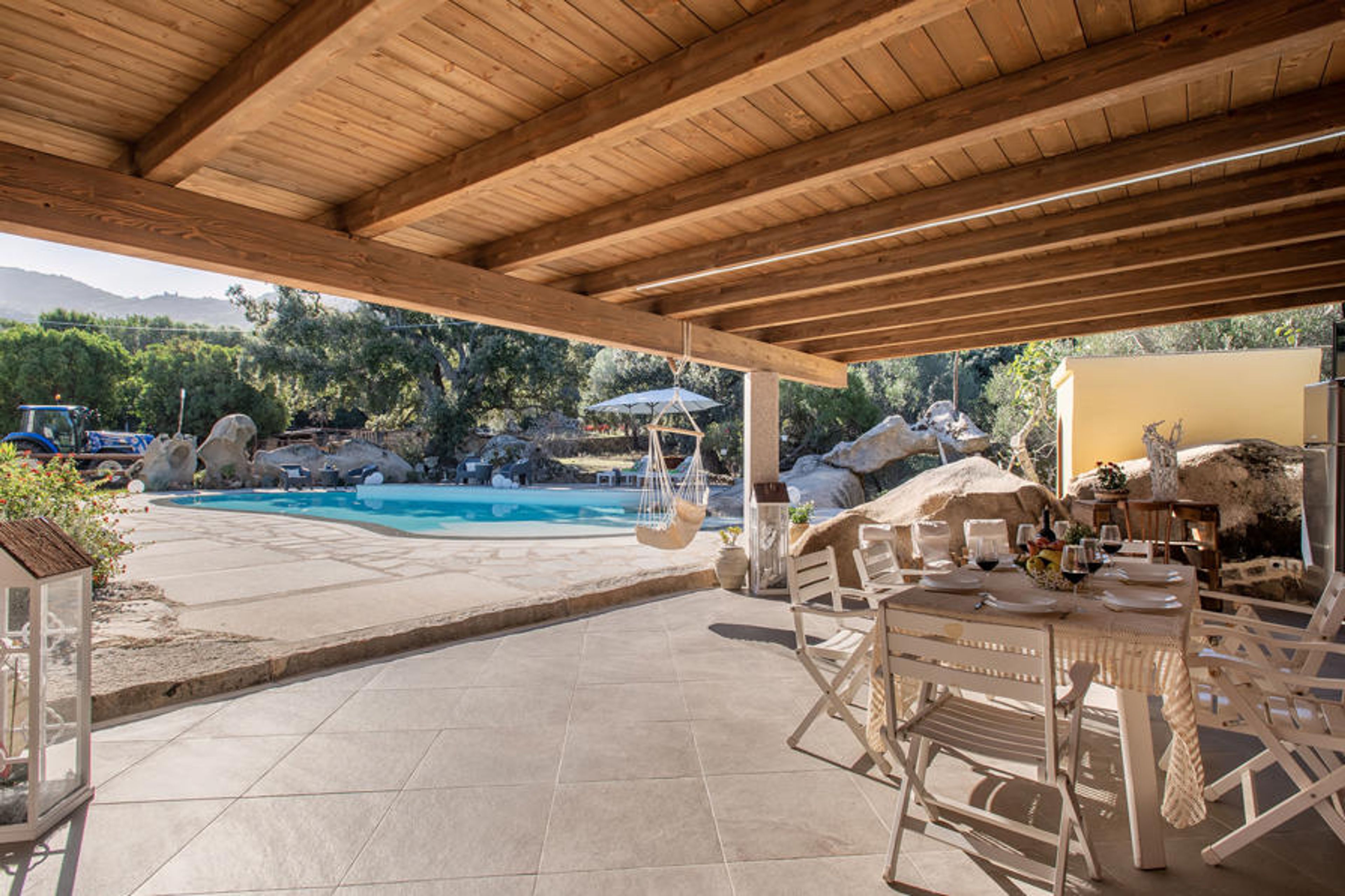 Large, beautiful, comfortable working farm. In the resort 9 km from the centre of Arzachena, in a quiet, sunny position, 15 km from the sea, in the countryside. Private: property, large garden with lawn and trees, swimming pool round (15 x 7 m, seasonal availability: 01.Apr. - 31.Oct.). Shower/WC in the pool area, patio, garden furniture, barbecue (swing). Motor access to the house. Parking at the house. Supermarket 9 km, restaurant 11 km, bar 11 km, bus stop "Suldarana" 1.1 km, sandy beach "Tanca manna" 17.5 km. Nearby attractions: baia sardinia 23 km, porto cervo 26 km, olbia 27 km, arzachena 9 km, cannigione 15 km, palau 23 km. Please note: car recommended. On the estate animal husbandry.