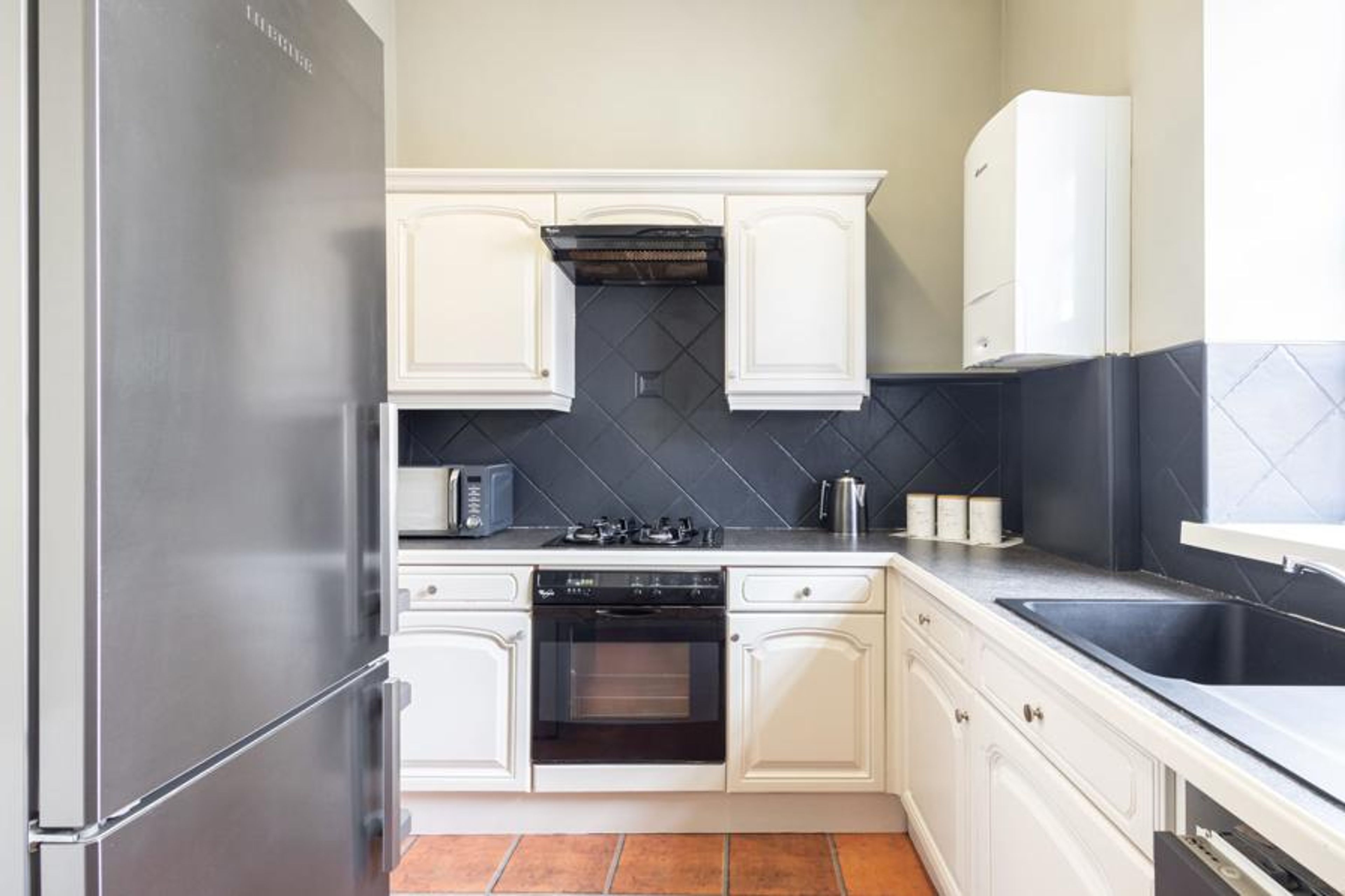 The kitchen features pops of a navy-blue shade, along with white cupboards. You’ll also find modern appliances so you can prepare meals easily.