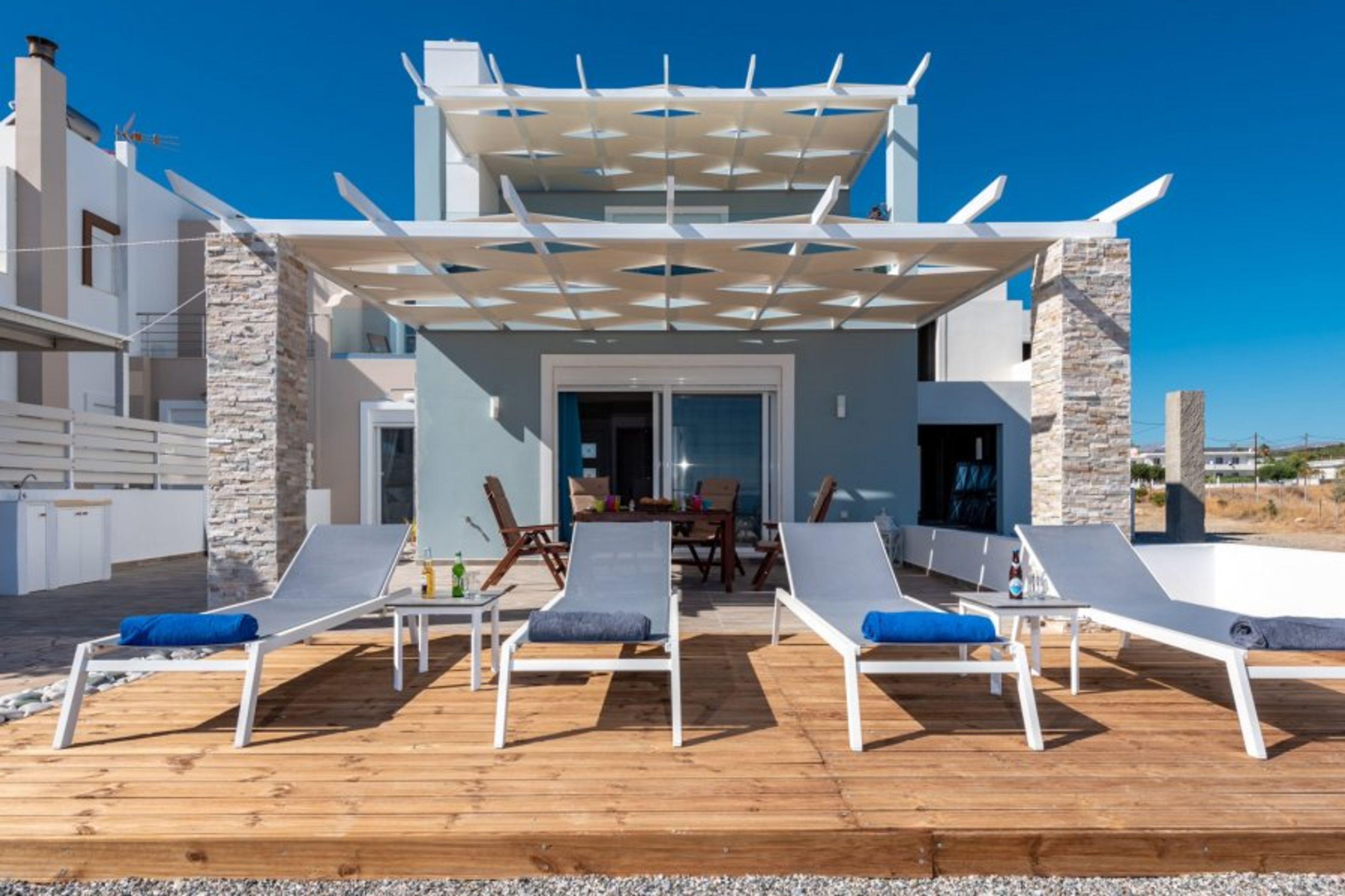 Villa Mary is a two-storey villa with 3 bedrooms with queen size beds ideal for families, couples and friends. It has 1.5 bathrooms, 2 showers, 2 large pergolas with stunning sea views, where you can enjoy your breakfast, food, or tea.