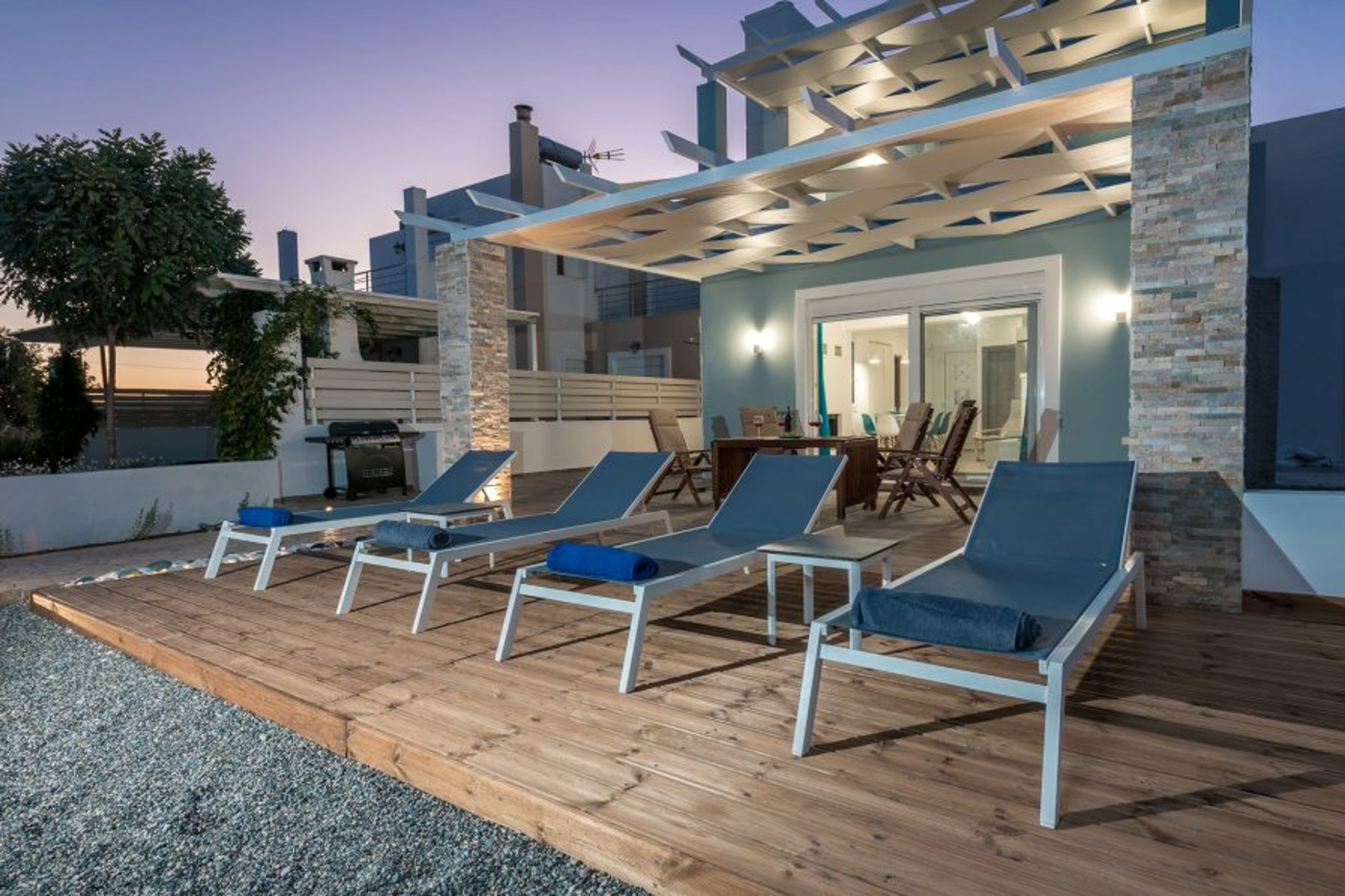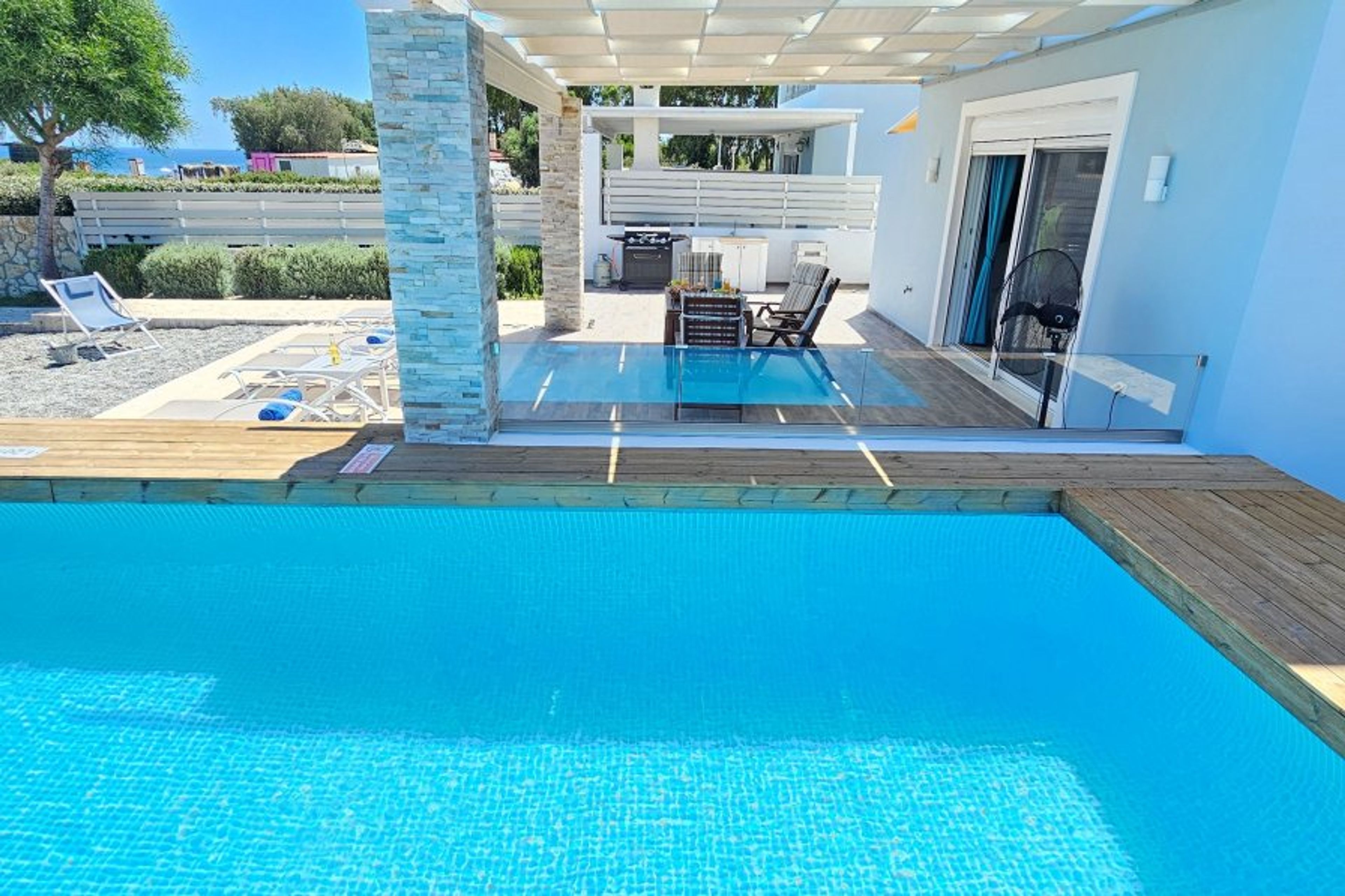 The villa has the exclusive use of 600sqm of outdoor space, specially designed to meet all your needs. A terrace with a large wooden dining room, a deck with 4 sun loungers to enjoy the wonderful summer sun, outdoor shower, BBQ, and a 2.7m x 5.5m pool with a depth of 1.2m, that will delight children, but will also cool the grown-ups.