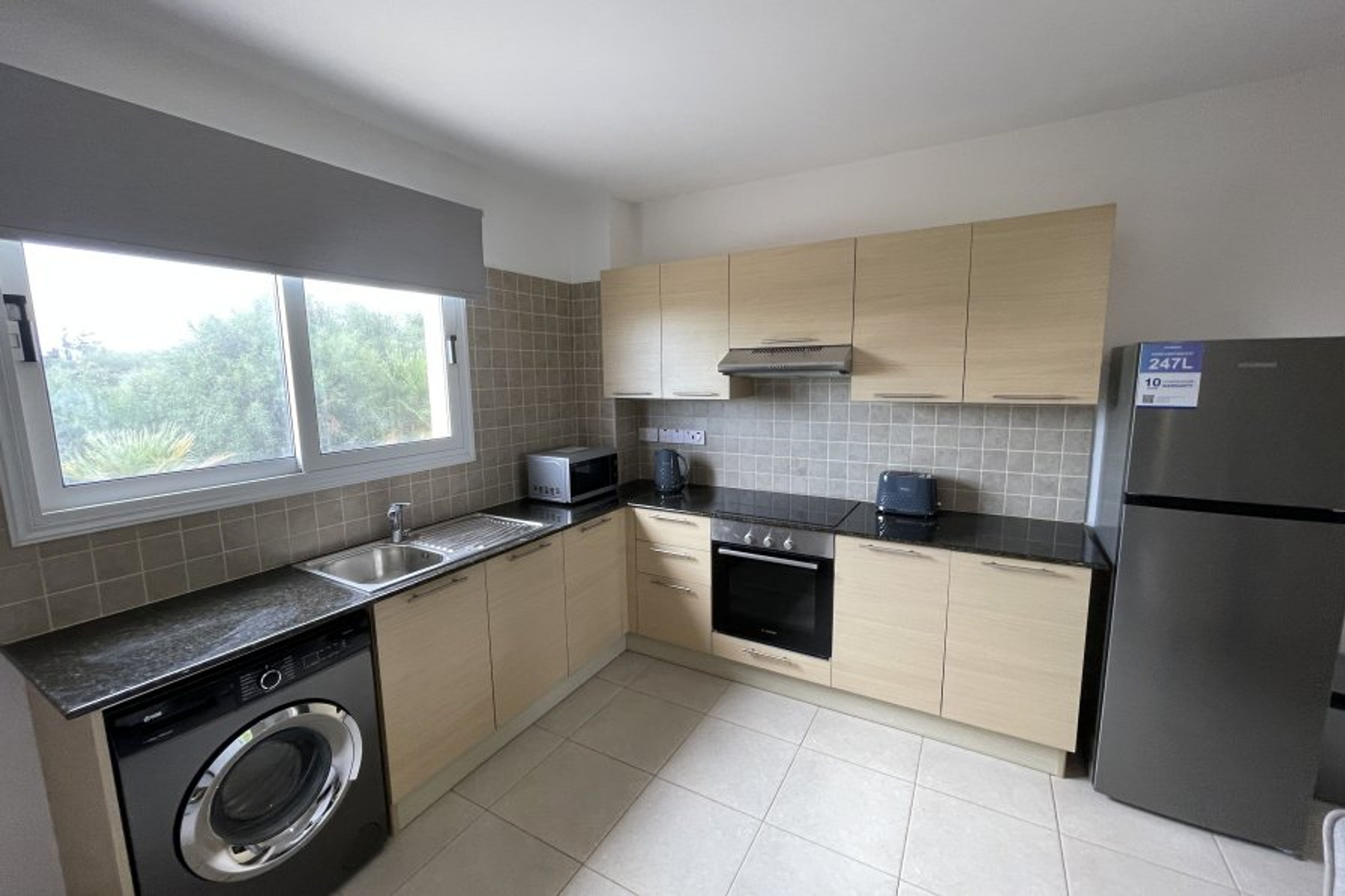 There is an open plan fitted kitchen which is fully equipped with everything you will need for a self catering holiday in Cyprus - microwave, oven, hob, fridge freezer, Nepresso coffee machine