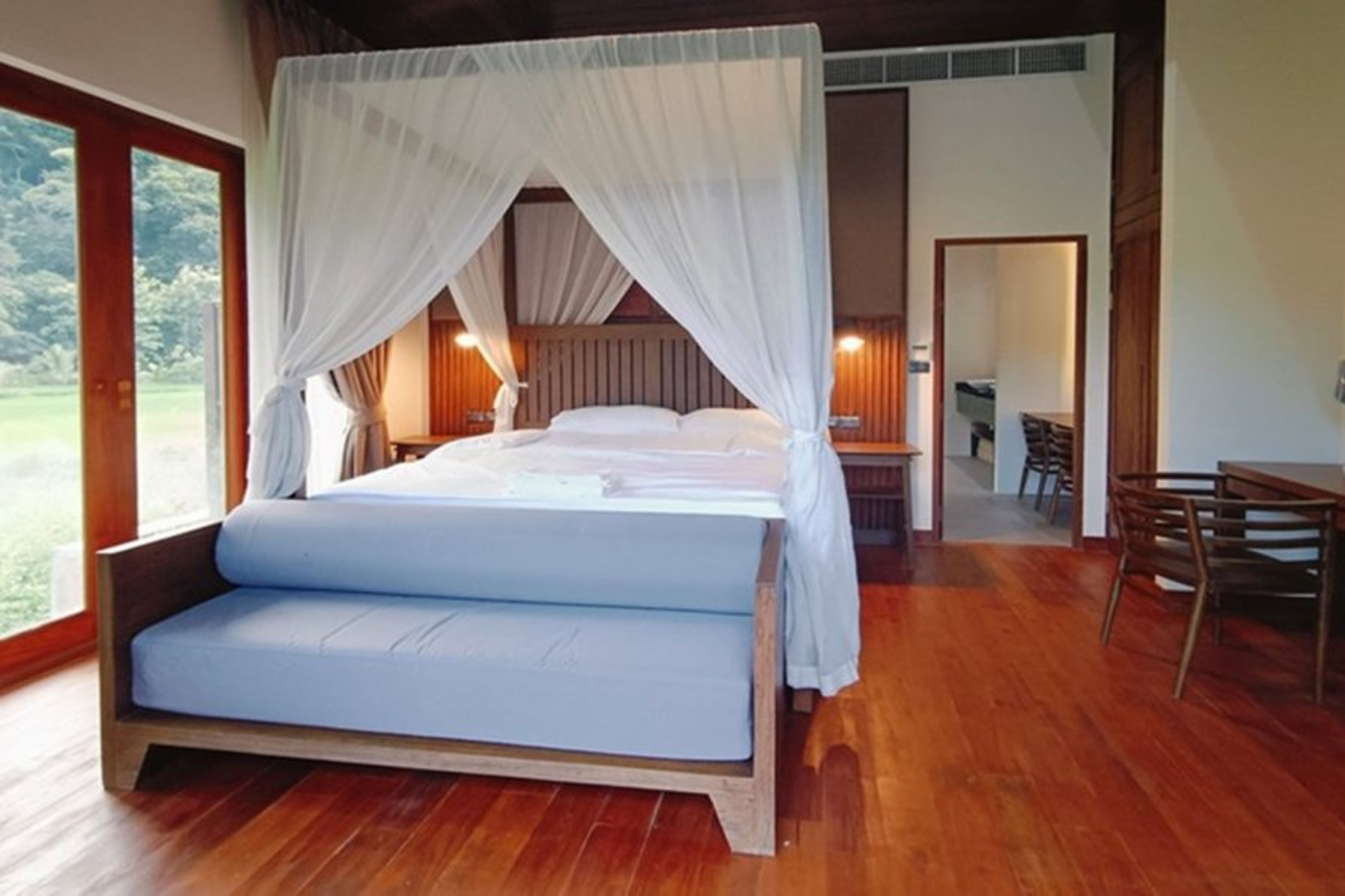 Accessed via a private suspension bridge, guests cross the river to the private pool villa that nestles between the mountains and the river, surrounded by working rice fields.