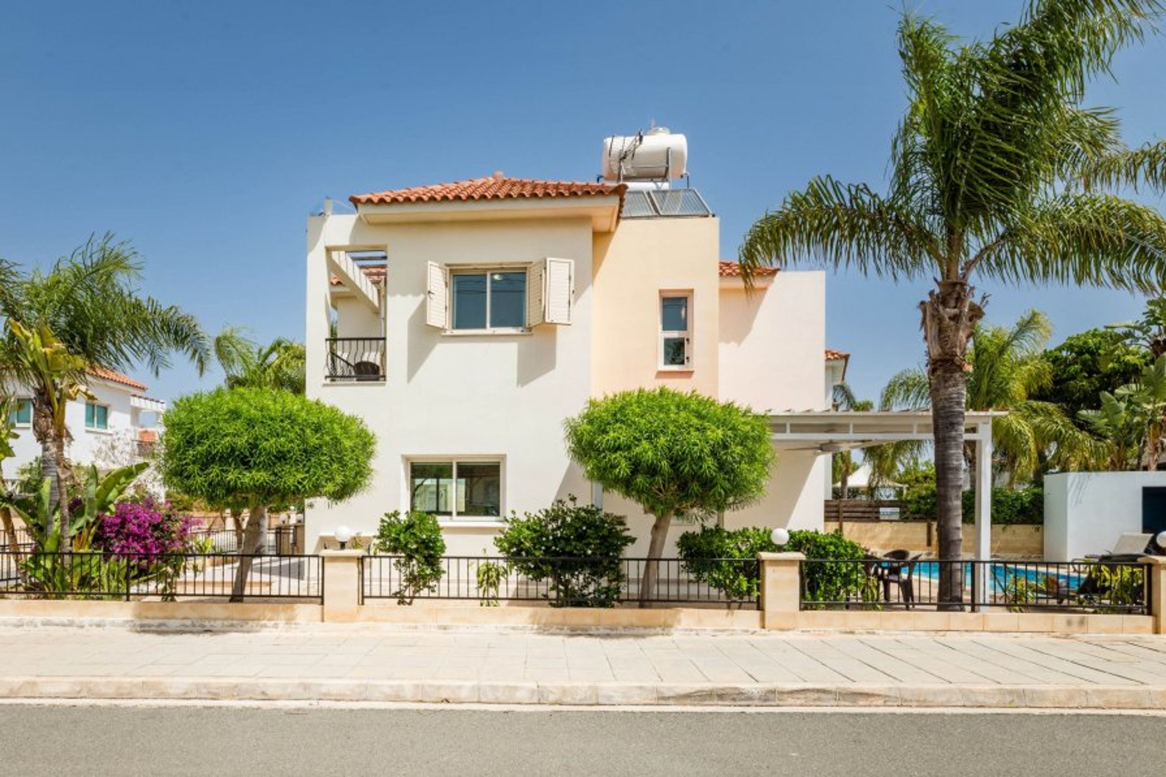 The villa itself features a private pool where you can enjoy lazy days soaking up the Cyprus sun. The pool area is complemented by sunbeds and a covered dining area, perfect for enjoying meals outdoors or simply relaxing in the shade. Privacy is guaranteed thanks to a surrounding fence that secures the property.