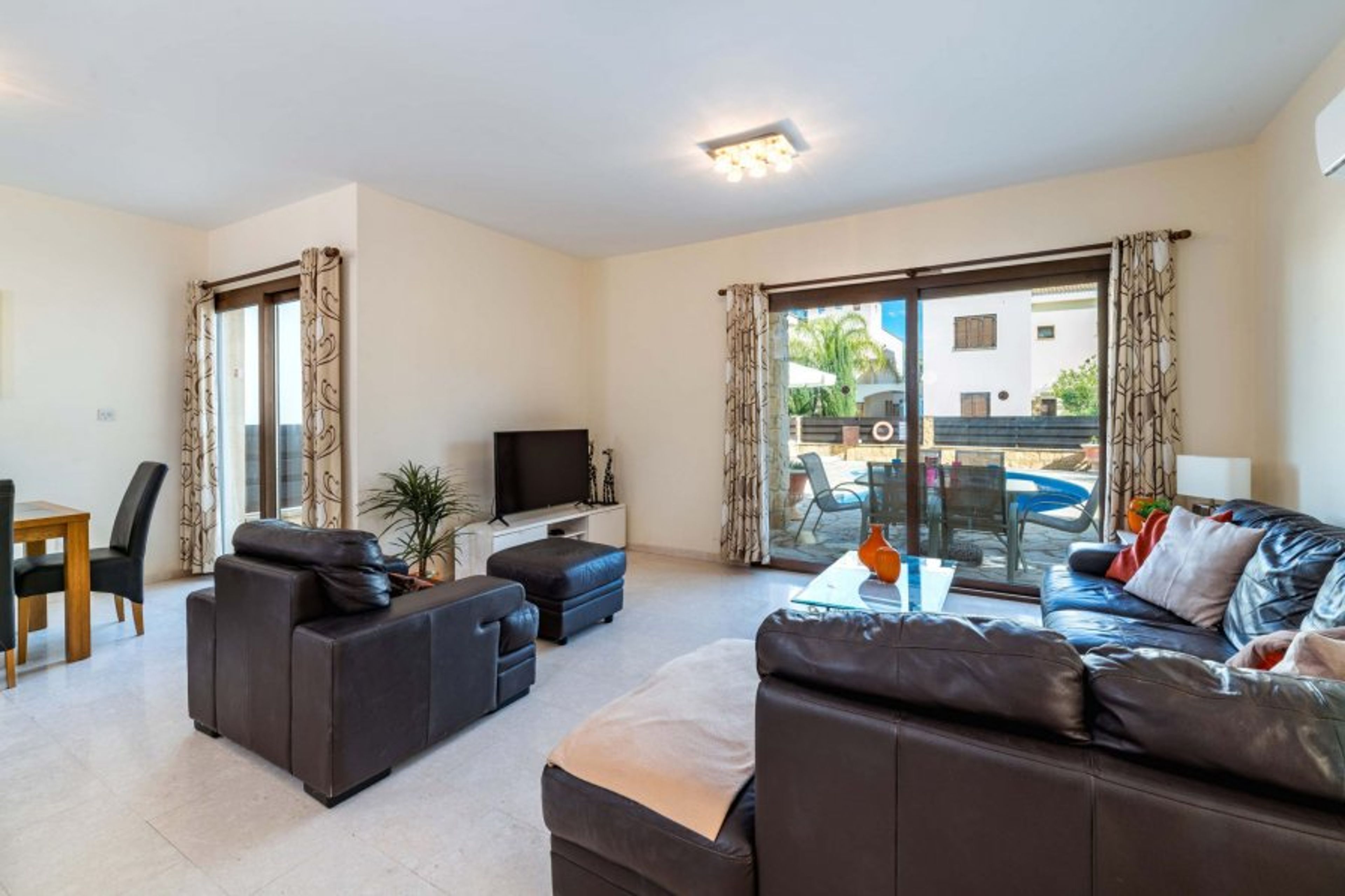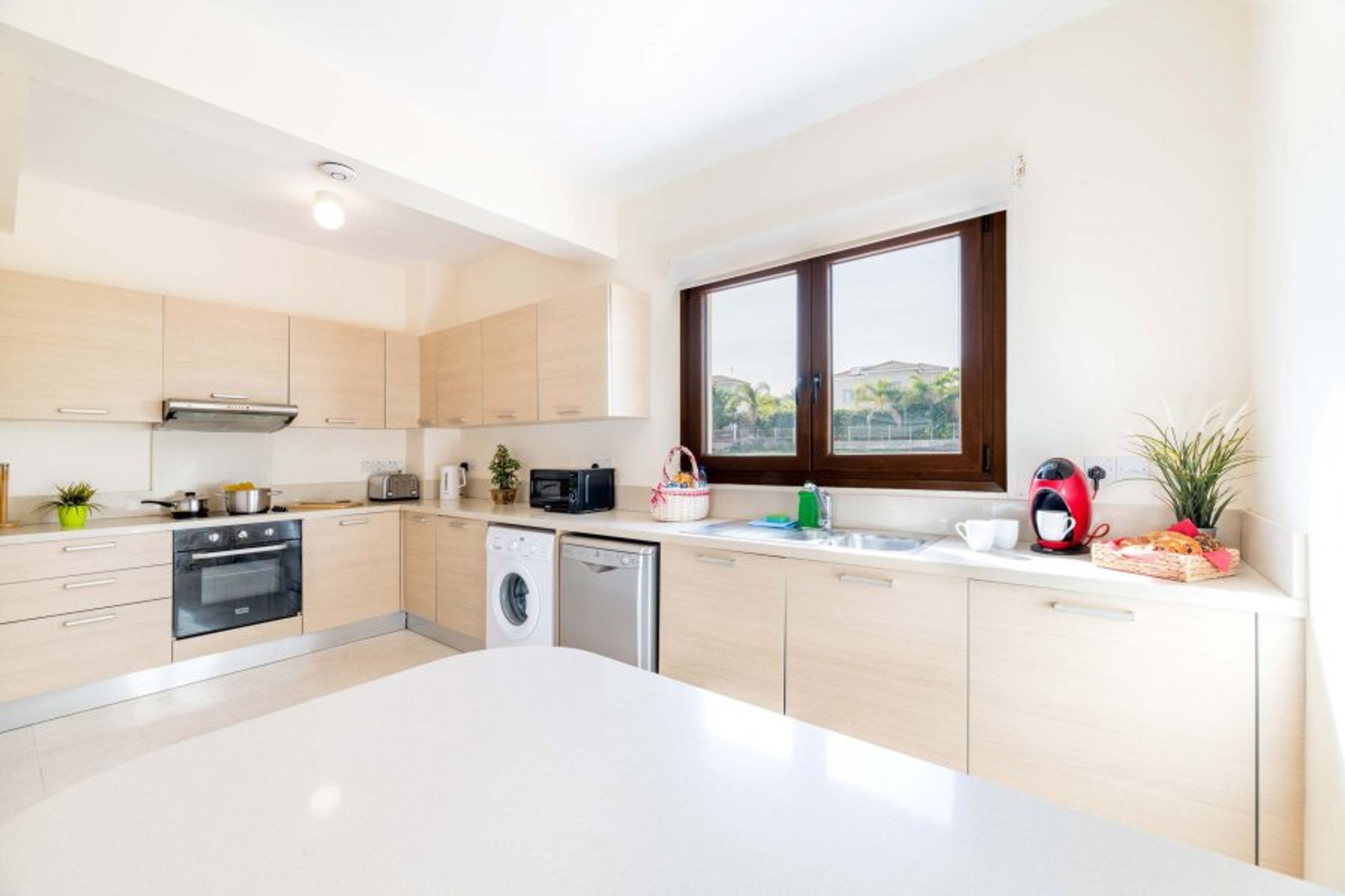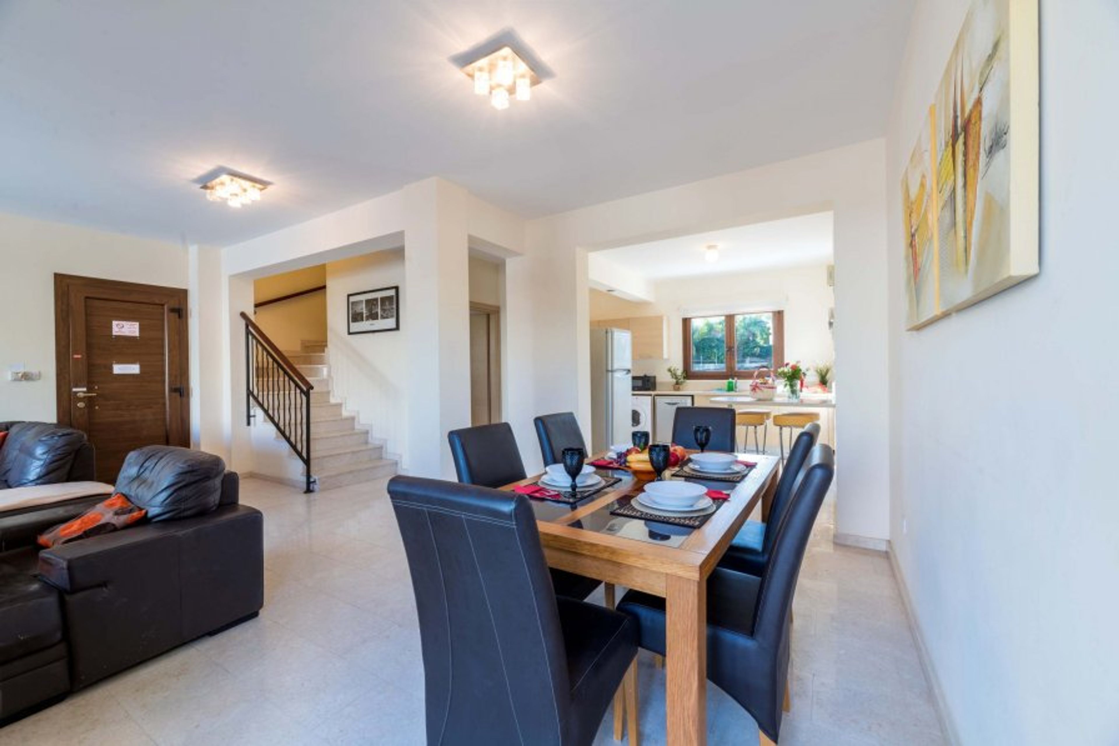 Villa Greco Mare #21 is a marvel of design, blending modern amenities with traditional Cypriot aesthetics. The interior is a haven of comfort, featuring a spacious living and dining area that flows seamlessly into a well-appointed kitchen, complete with a downstairs guest WC. A large flat-screen TV and a Satellite TV Box with over 1000 international channels ensure endless entertainment.