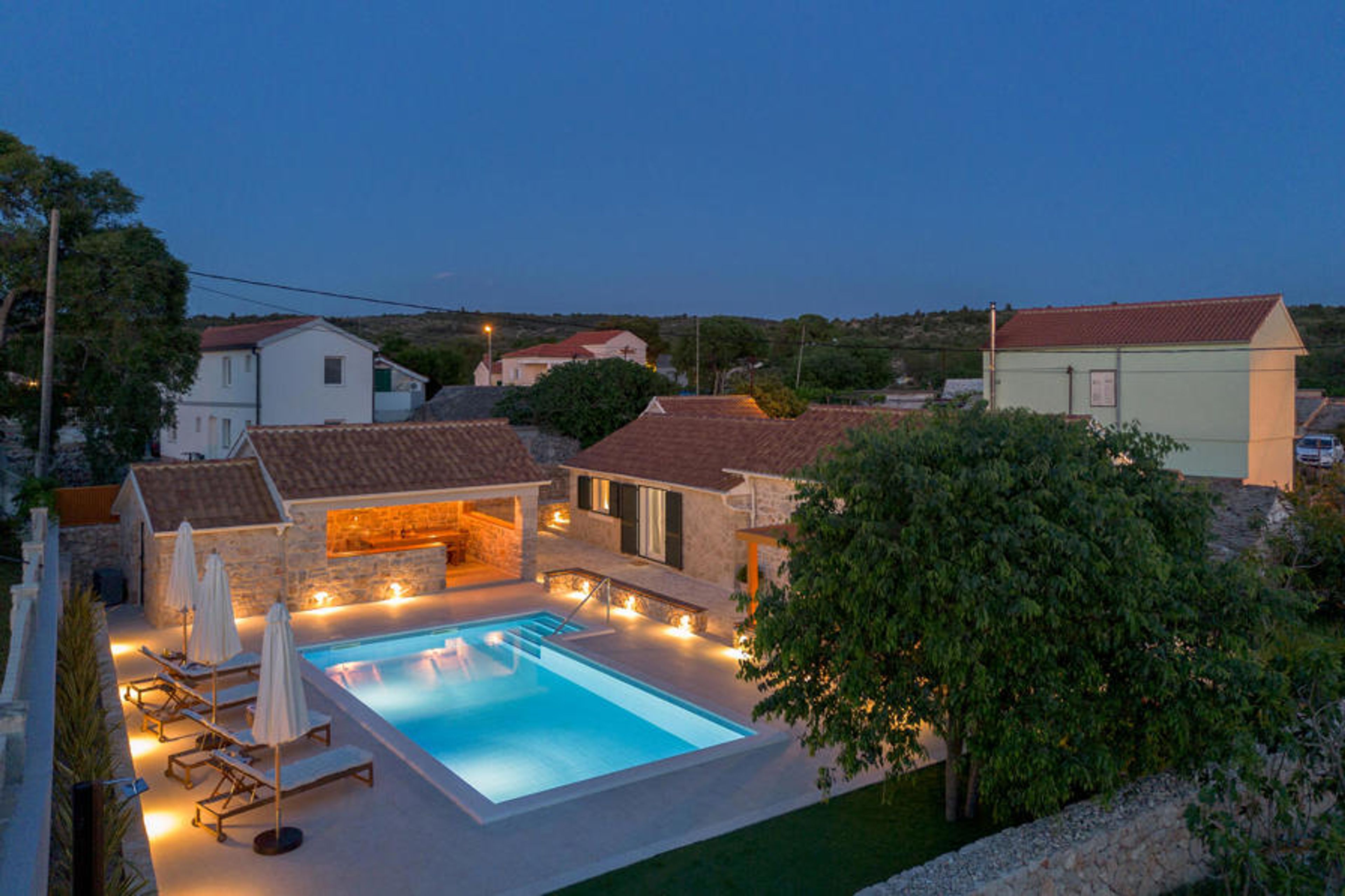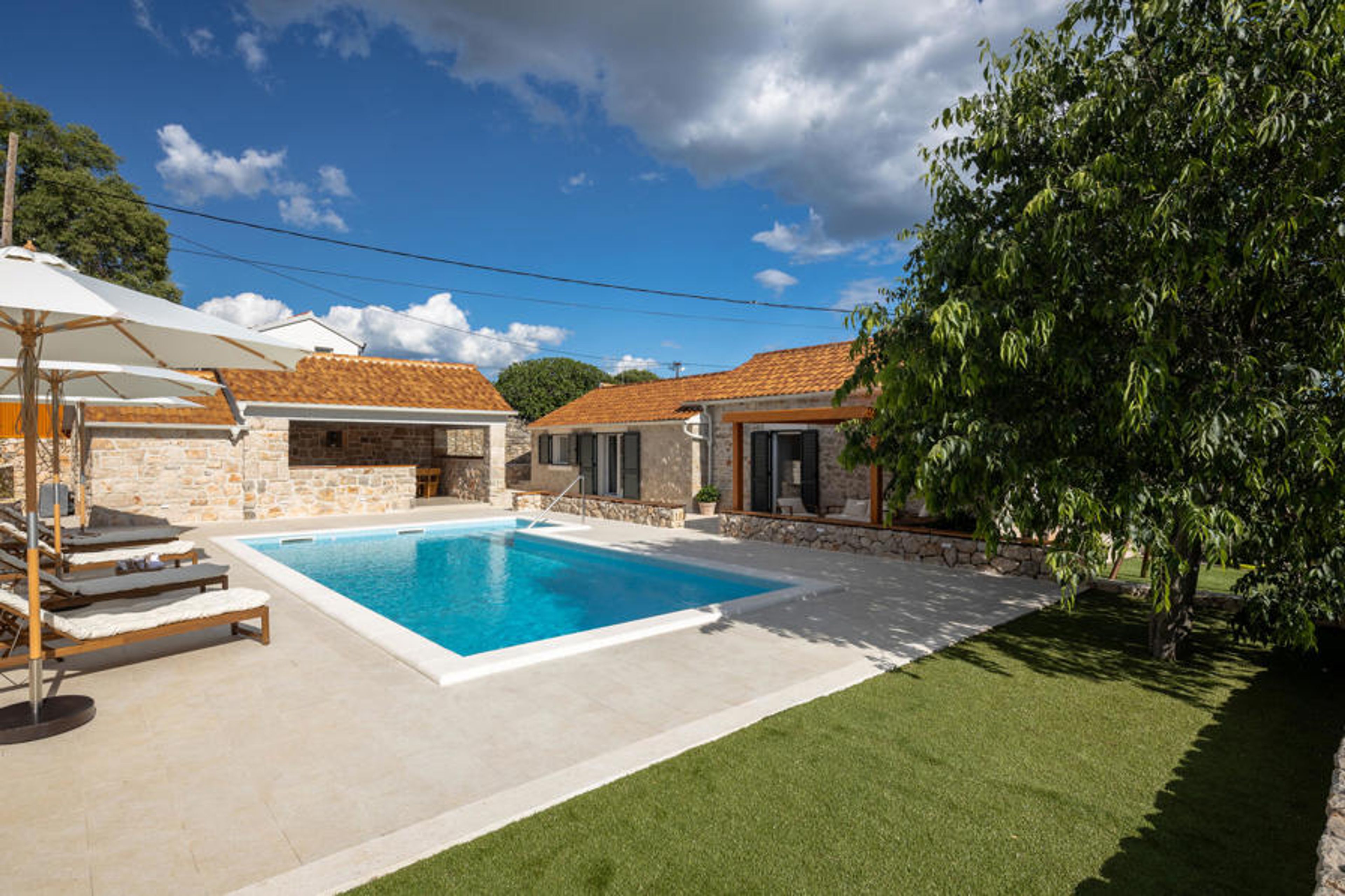 Your holiday home near Primosten consists of three separate houses, which offer you and your fellow travellers both privacy and sociable get-togethers. Each house has its own bedroom and bathroom so that all guests can feel at home. Start the day with a refreshing dip in the saltwater pool and let the sun warm your skin on the comfortable loungers on the terrace. Enjoy the peaceful atmosphere in the shaded lounge area or take a refreshing dip in the outdoor shower. The little ones can let off steam in the children's playground while you make yourself comfortable on the terrace.