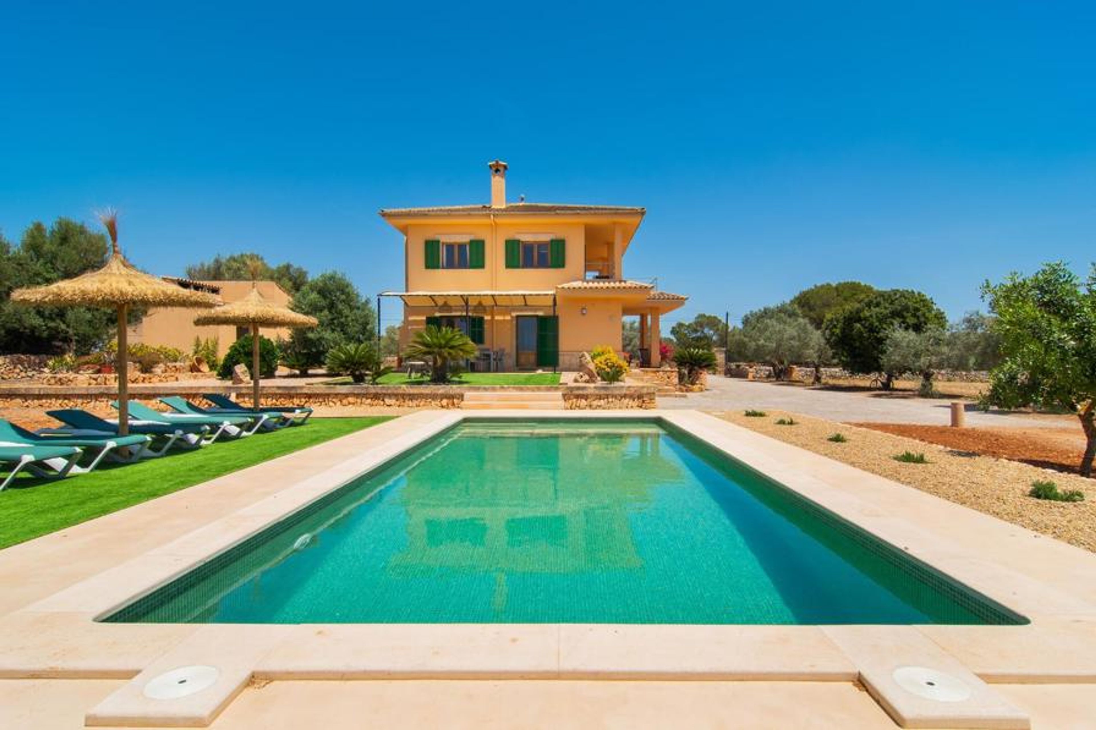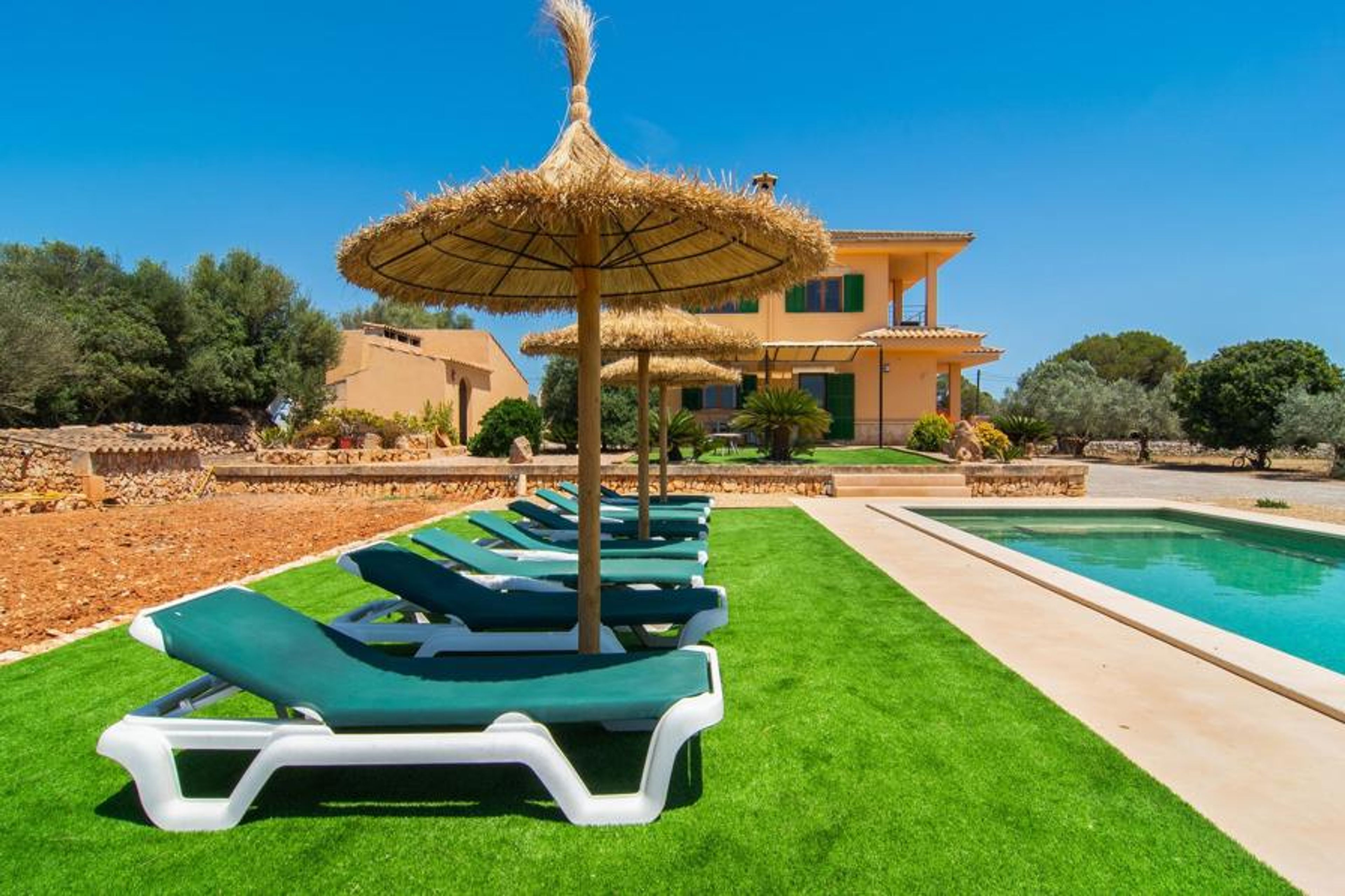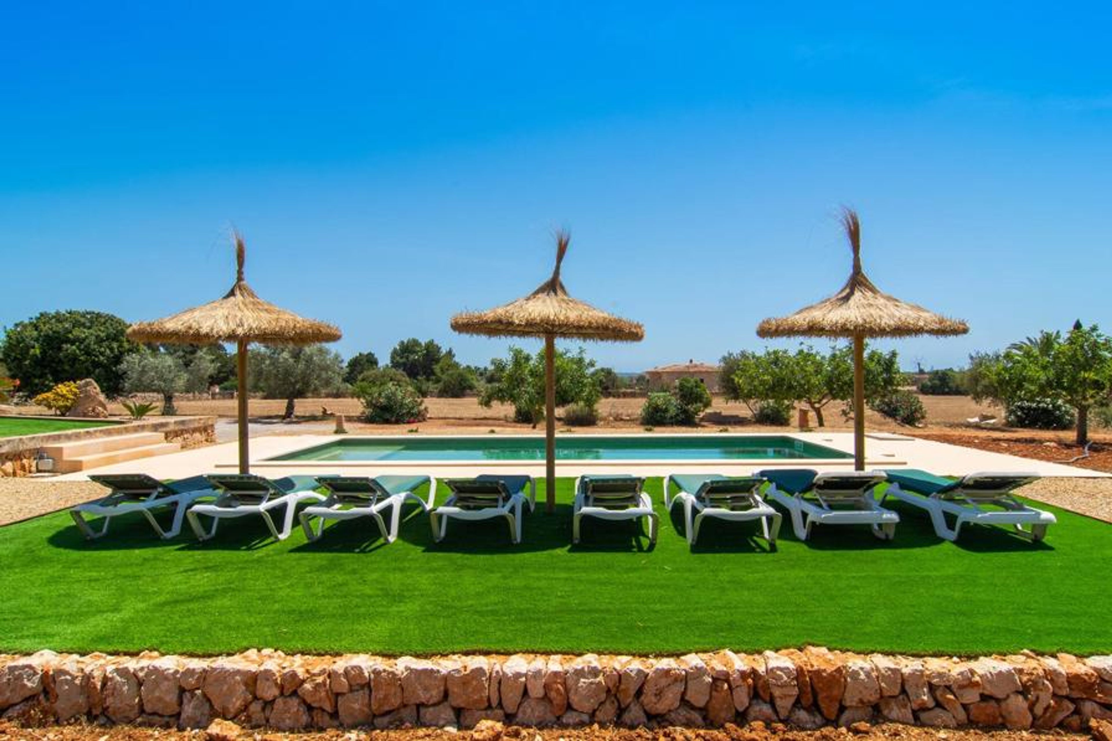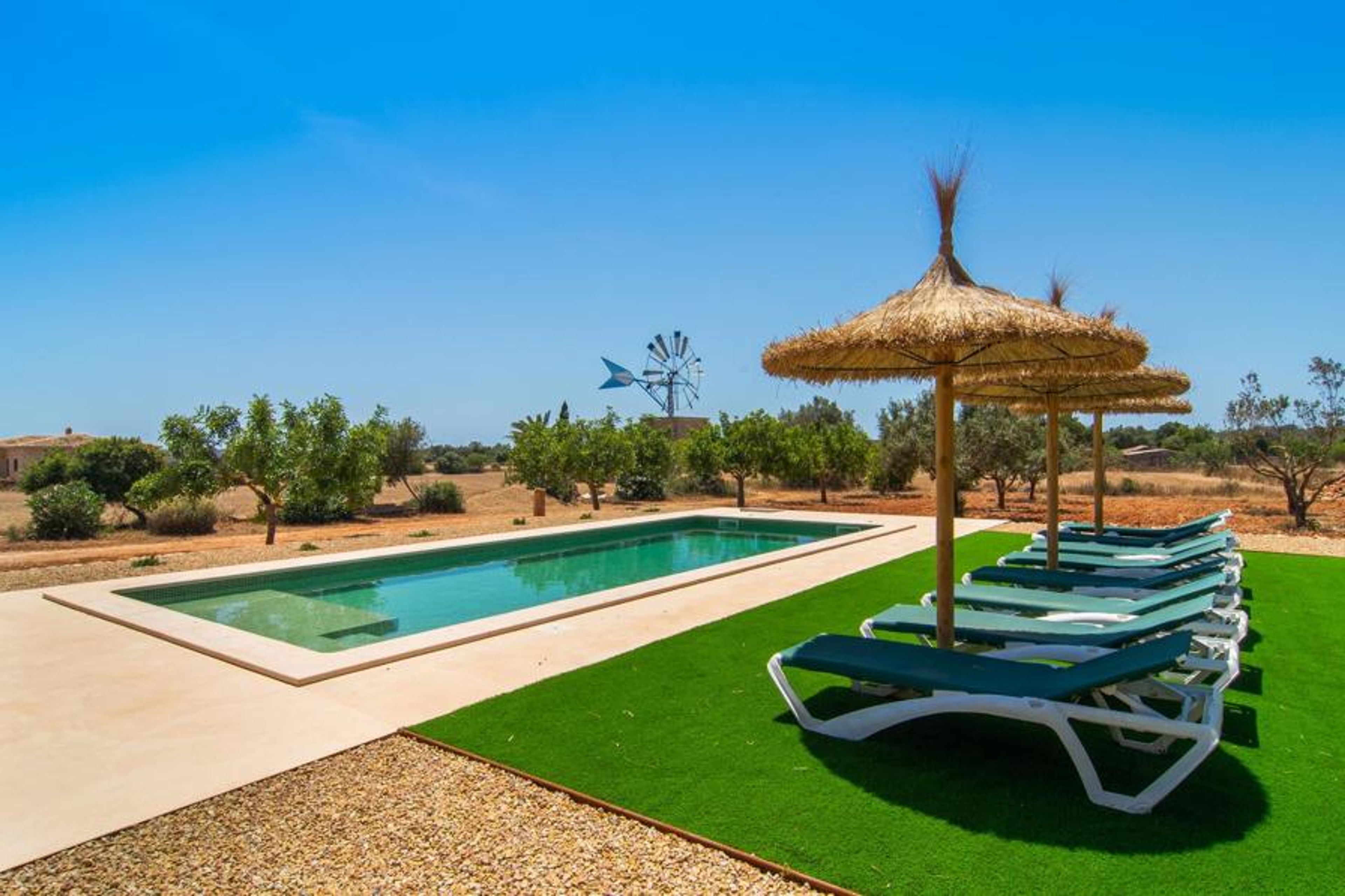 This relaxation can also be found inside the majestic holiday farmhouse. The combination of Mallorcan country house style with modern furnishing details can be described as extremely successful. A spacious entrance area with a Mediterranean character invites you to explore the house. On the ground floor, you will find the cosy TV living room, the wonderfully large eat-in kitchen with a sociable dining area and one of the air-conditioned relaxation rooms. A trendy bathroom with a walk-in shower rounds off this floor. Attractive country-style living accessories also skilfully accentuate the upper floor. The other three bedrooms, two of which have direct access to sun-drenched balconies with enchanting views, also bear witness to this. Two further comfortable bathrooms (with shower or bathtub) are part of the pampering basic equipment of this beautifully situated holiday home. The interior layout of the spacious holiday home is ideal for several constellations of up to eight travellers, i.e. two families or several couples of friends. Everyone is welcome at Hort de Can Rafalet! The inviting pool farmhouse Hort de Can Rafalet impresses with its rural tranquillity between olive trees and a historic windmill, paired with the most modern comforts. The property is in a prime location in the south of Mallorca between the small town of Ses Salines and the coastal town of Colònia de Sant Jordi. In addition to natural wonders such as the salt fields, the town's appeal also lies in its proximity to the dream beach of Es Trenc. This is only 10 minutes away by car.