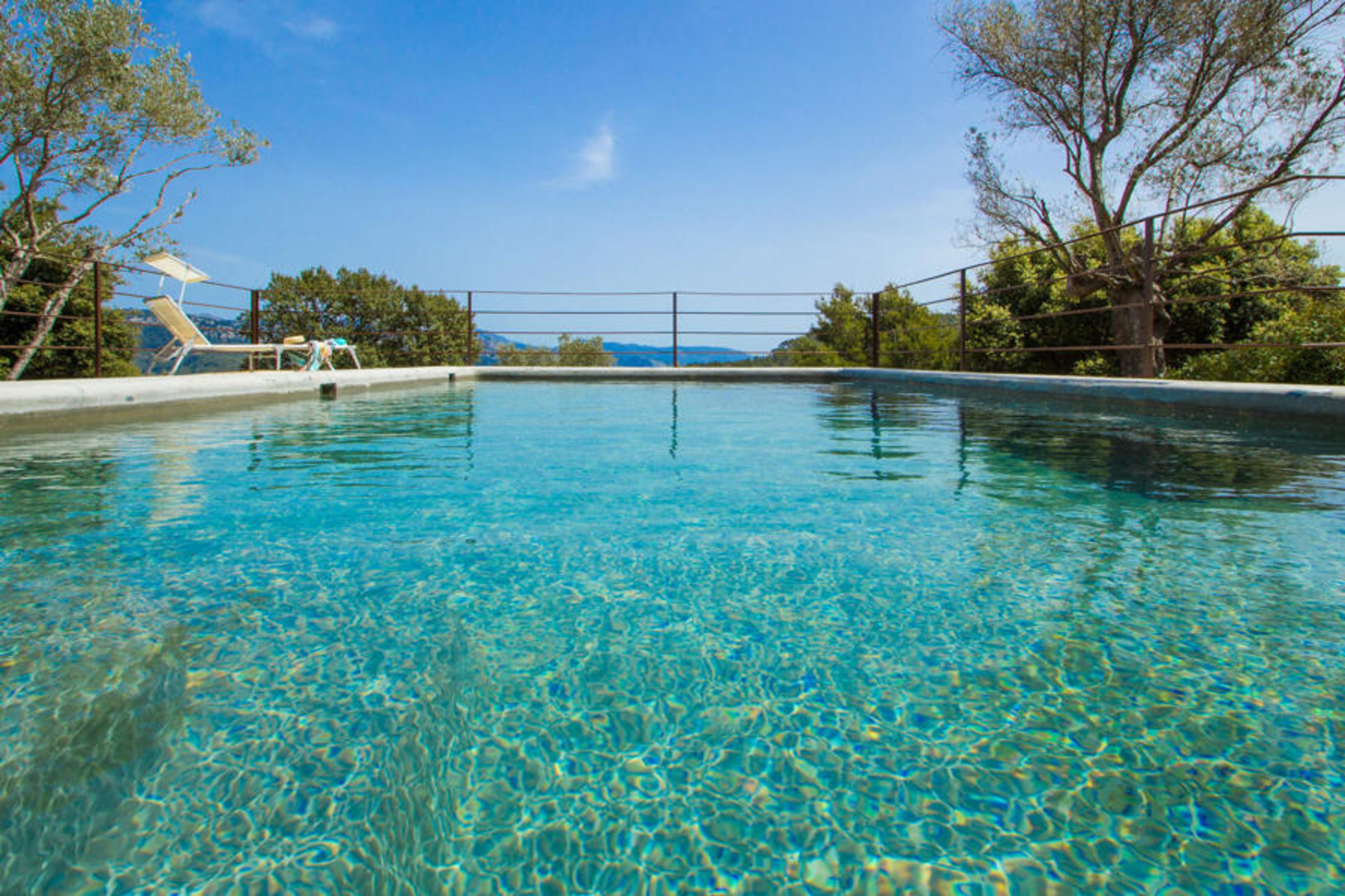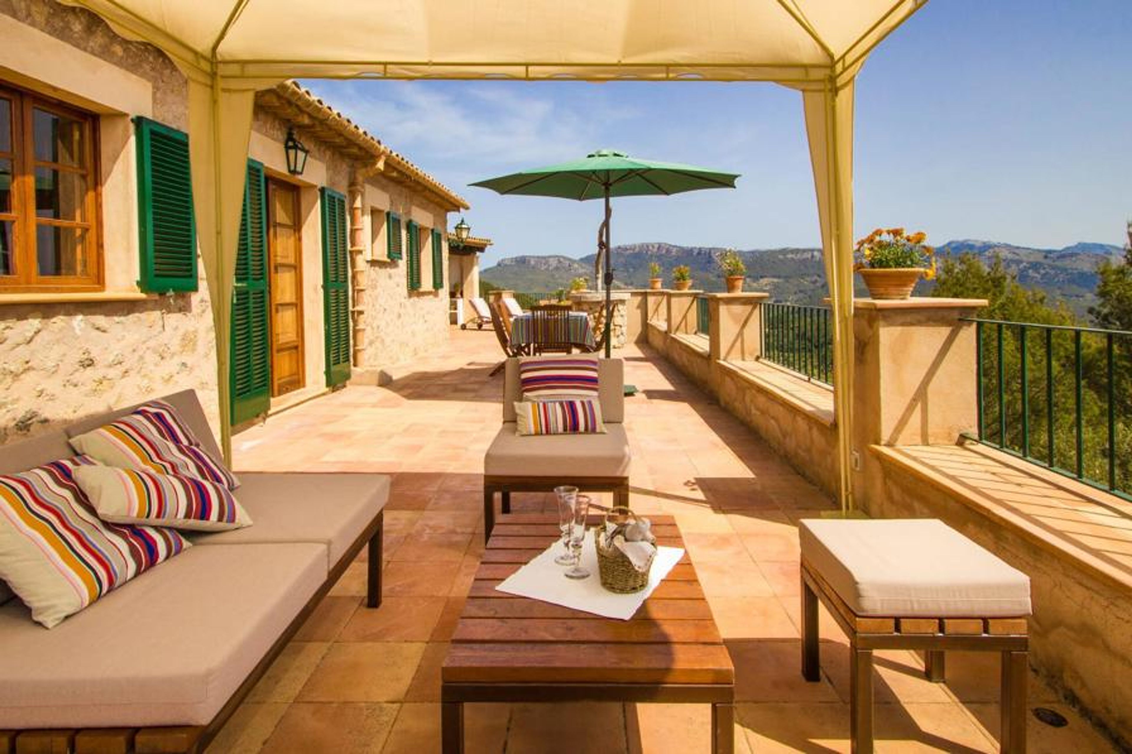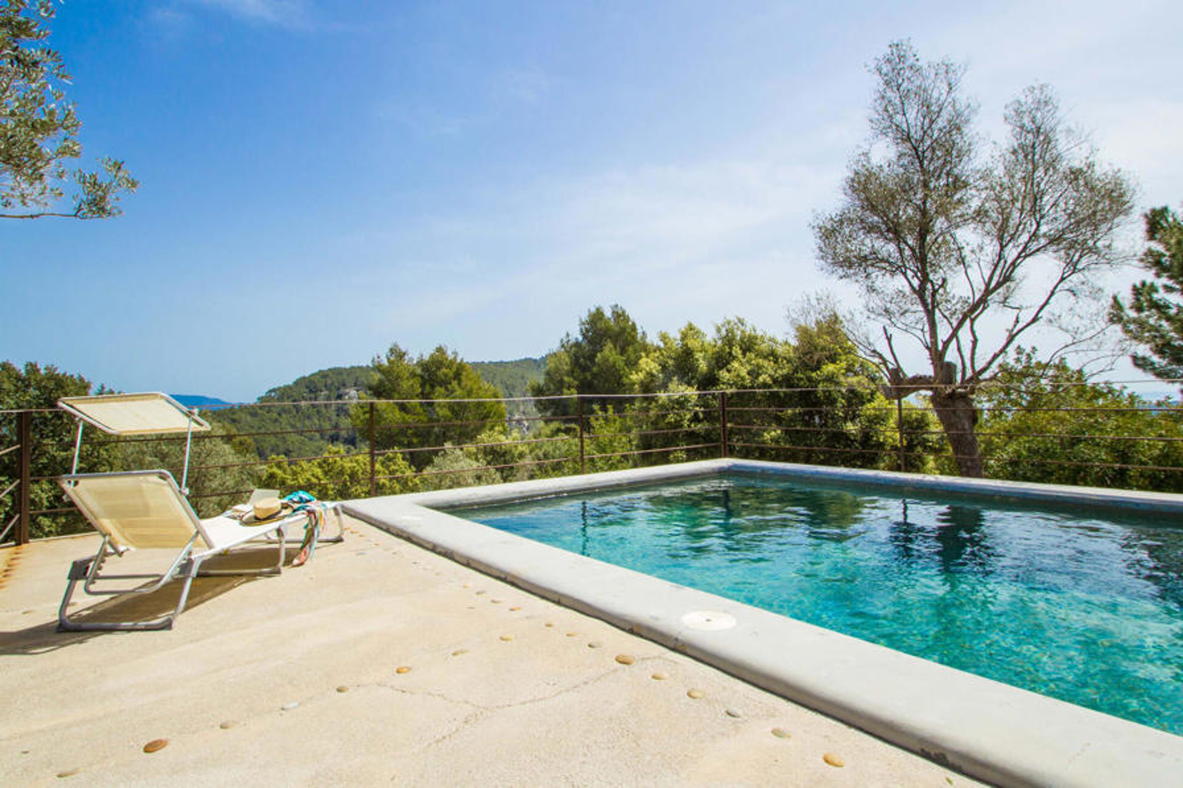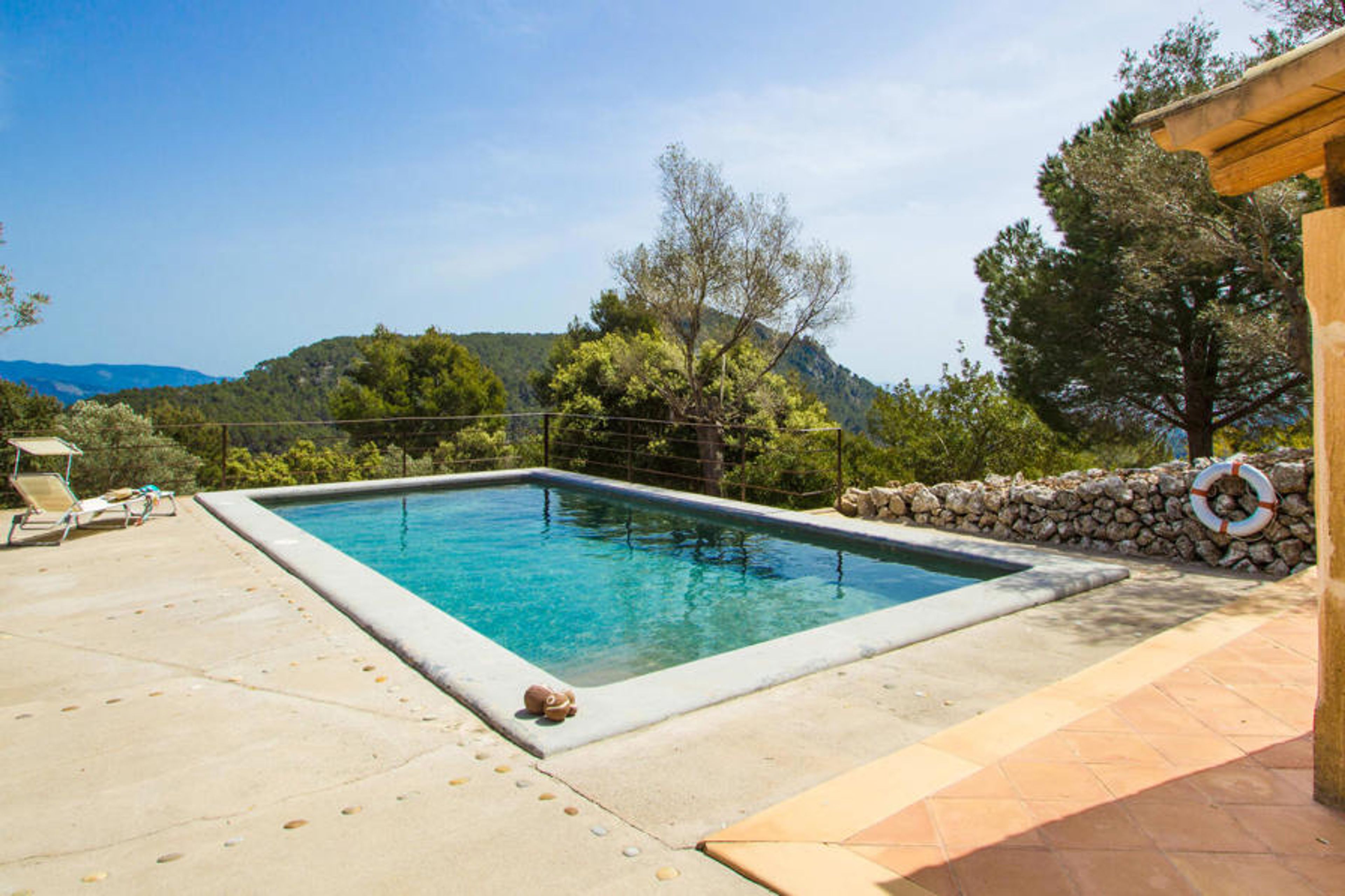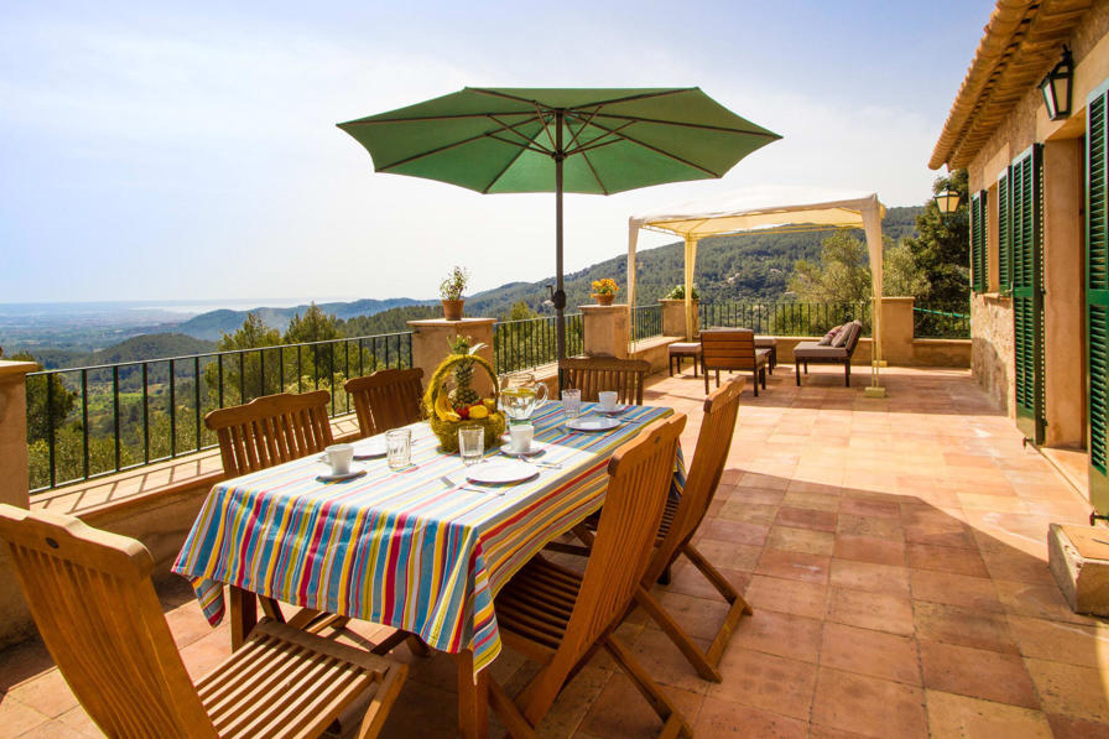 Villa Vistas de Serra sits enthroned high above the charming small town of Esporles in complete tranquillity. The typical Mallorcan stone house blends in perfectly with the green surroundings, which are partly woodland. It tempts you to stay a while and enjoy the view. The extensive outdoor area consists mainly of terraces, bordered by small stone walls and lined with Mediterranean flora, where you can spend your time in a varied and pleasant way. About 30 metres from the front of the house and slightly lower down is the inviting pool area, which is accessible via a stepped footpath and is blessed with breathtaking, unique views. The 9 metre long pool is easily accessible and has a depth of between 1.2 and 2.20 metres. On hot days, this is a wonderful place to cool off. For those who want to do nothing but relax and enjoy the sun all day long, comfortable deckchairs are available. Of course, if you want to protect yourself from excessive UV rays, you can simply sit under one of the parasols outside or find a spot in the covered part of this outdoor area. Here you will find the outdoor bathroom and a dining area, and there is also a fridge outside so that you always have a cool drink to hand. The long panoramic terrace right next to the house is a great place to sit together and enjoy the luxury of this breathtakingly beautiful location. You can even see a little of the sea in the distance. If you have some time to spare, just relax under the gazebo with a good drink and forget all your worries. The covered barbecue area with dining table, sink and wood-fired oven is also located on this level. It's the perfect place for long barbecues where you can grill all kinds of fresh local food. Right next to the house there are two shaded parking spaces for the hire car.