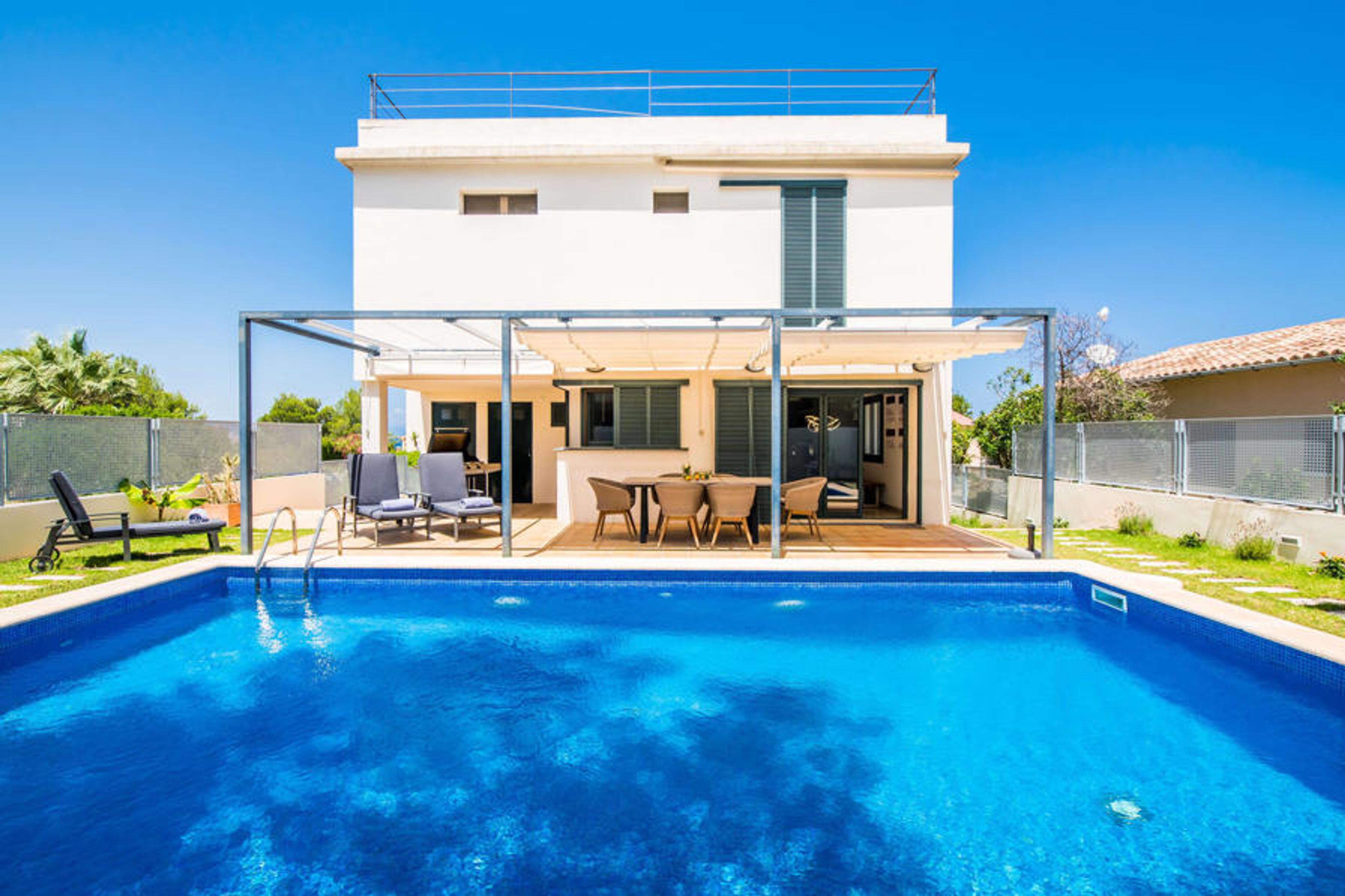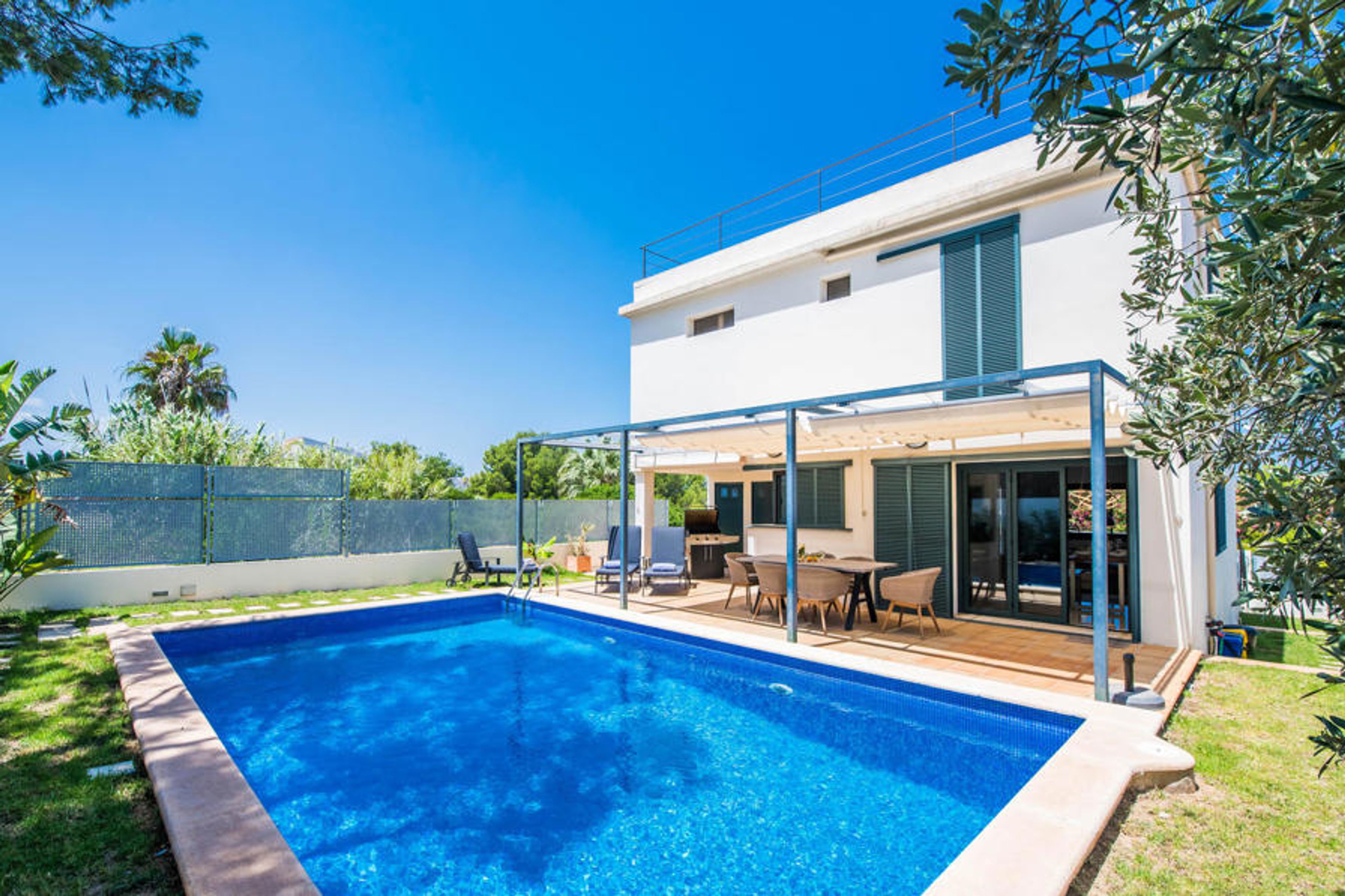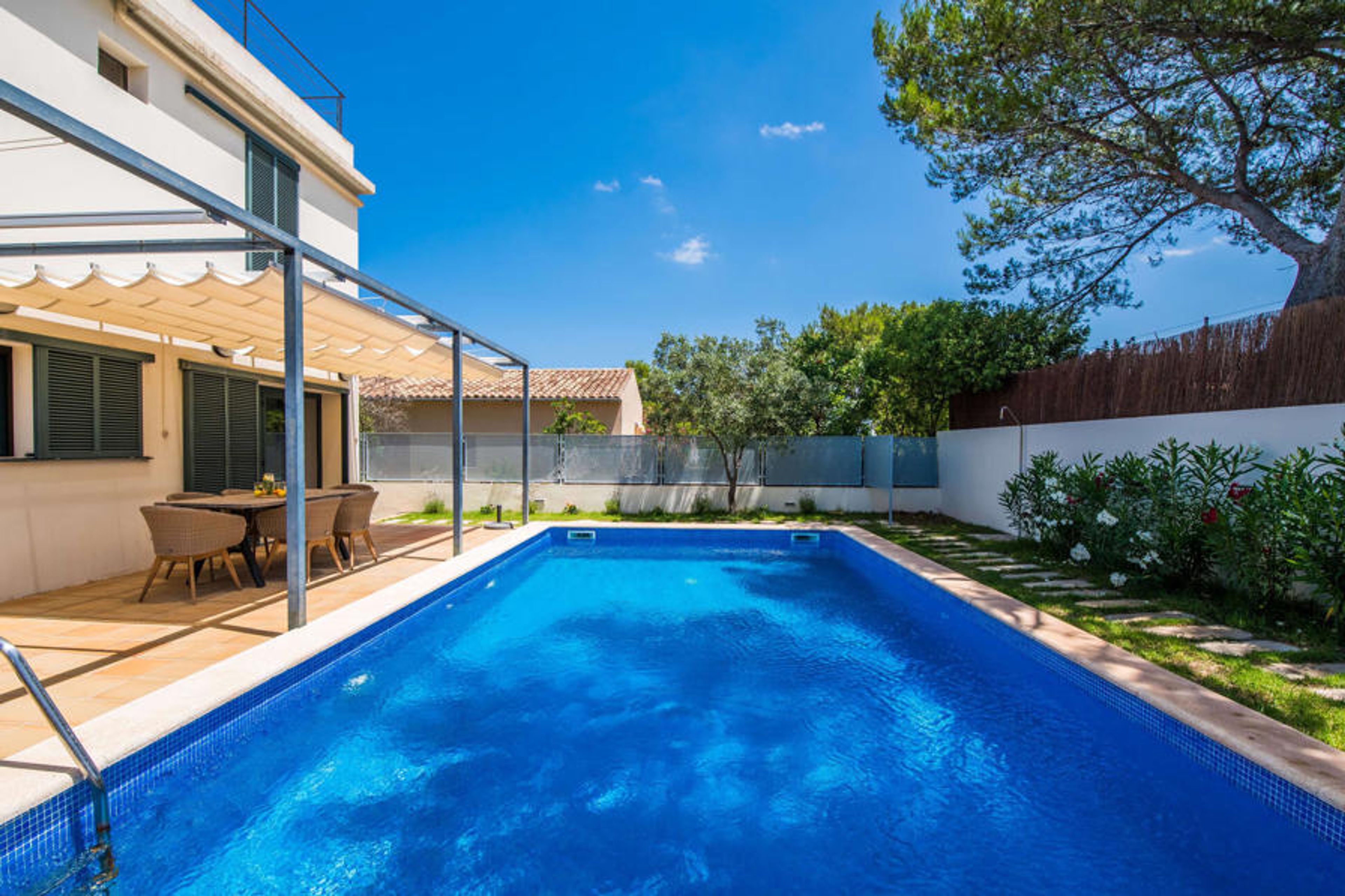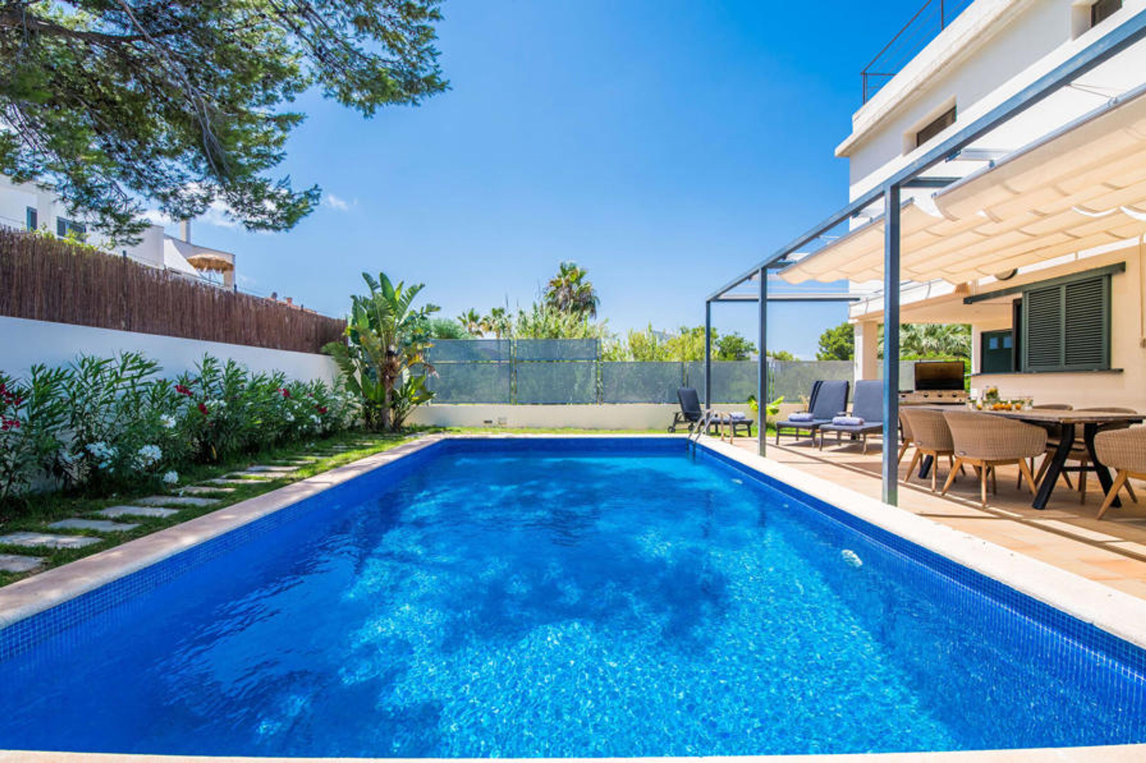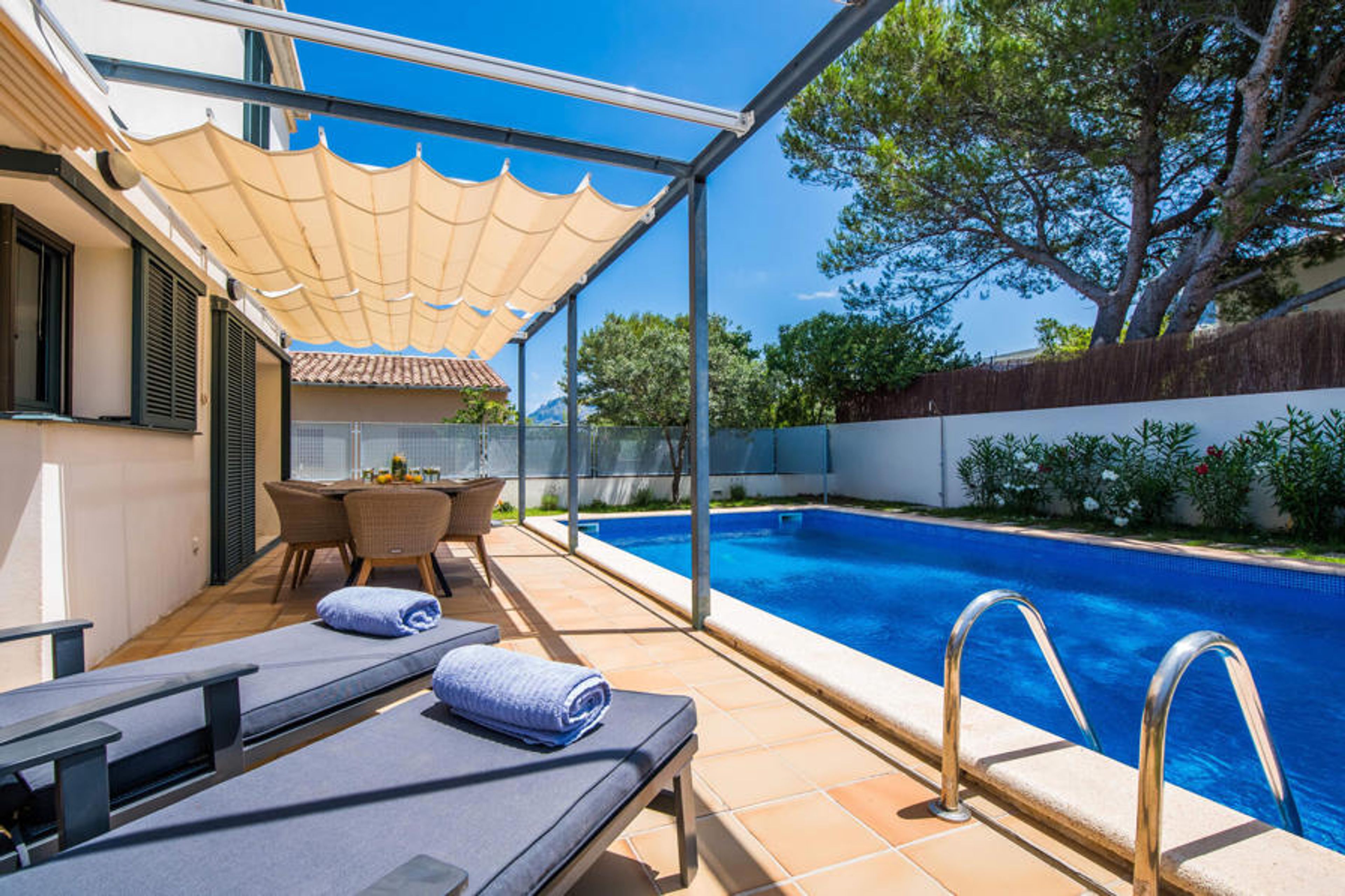 For those who want to relax, just a few steps from the house lead to the rear terrace with pool, perfect for a refreshing dip. Comfortable loungers and a modern gas barbecue await you, ideal for an afternoon of relaxation and al fresco dining. Enjoy your meals at the wooden table with rattan chairs and savour the tranquil surroundings. The villa also has a roof terrace with marvellous views over the bay of Alcudia and the mountains.