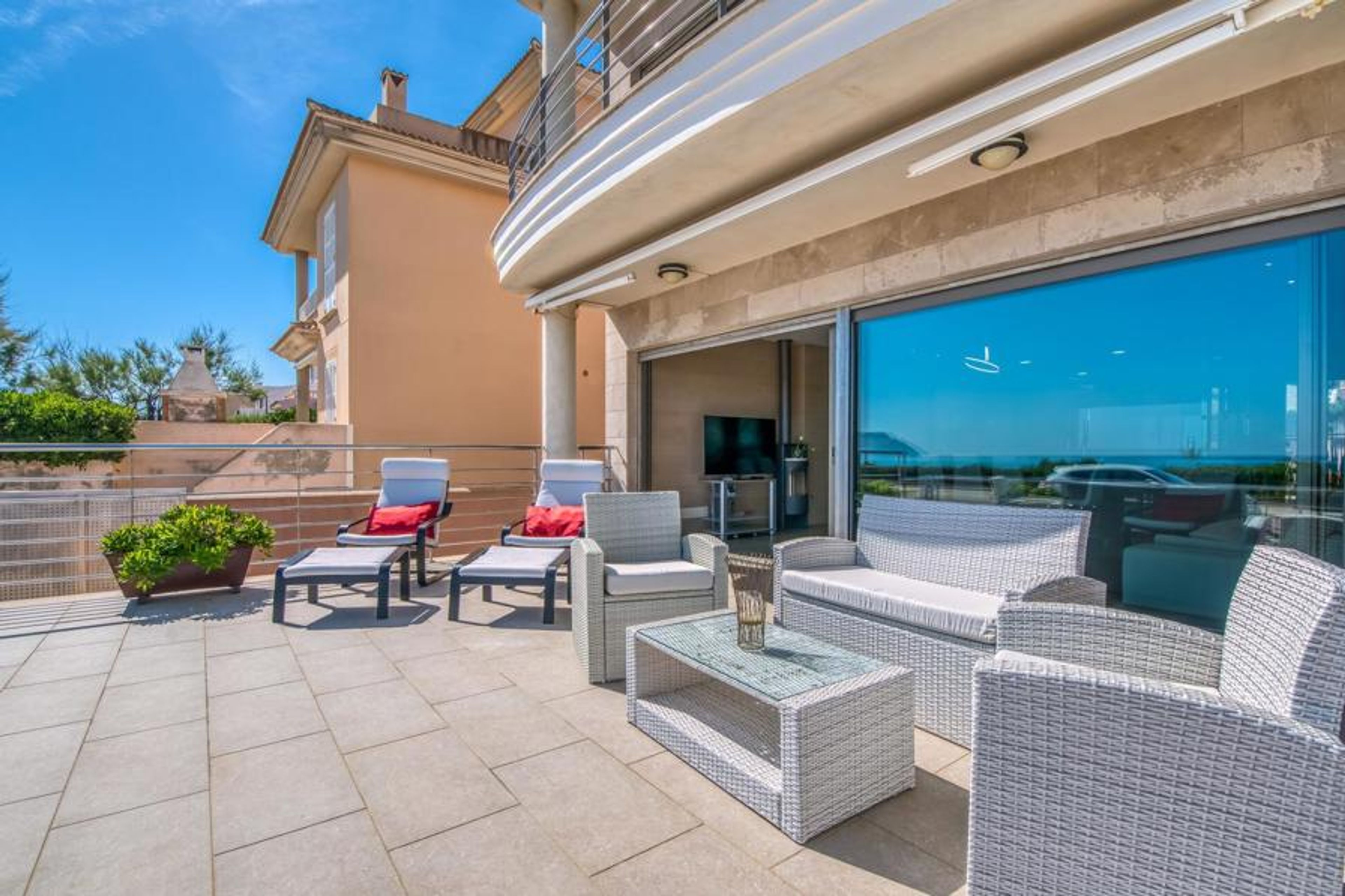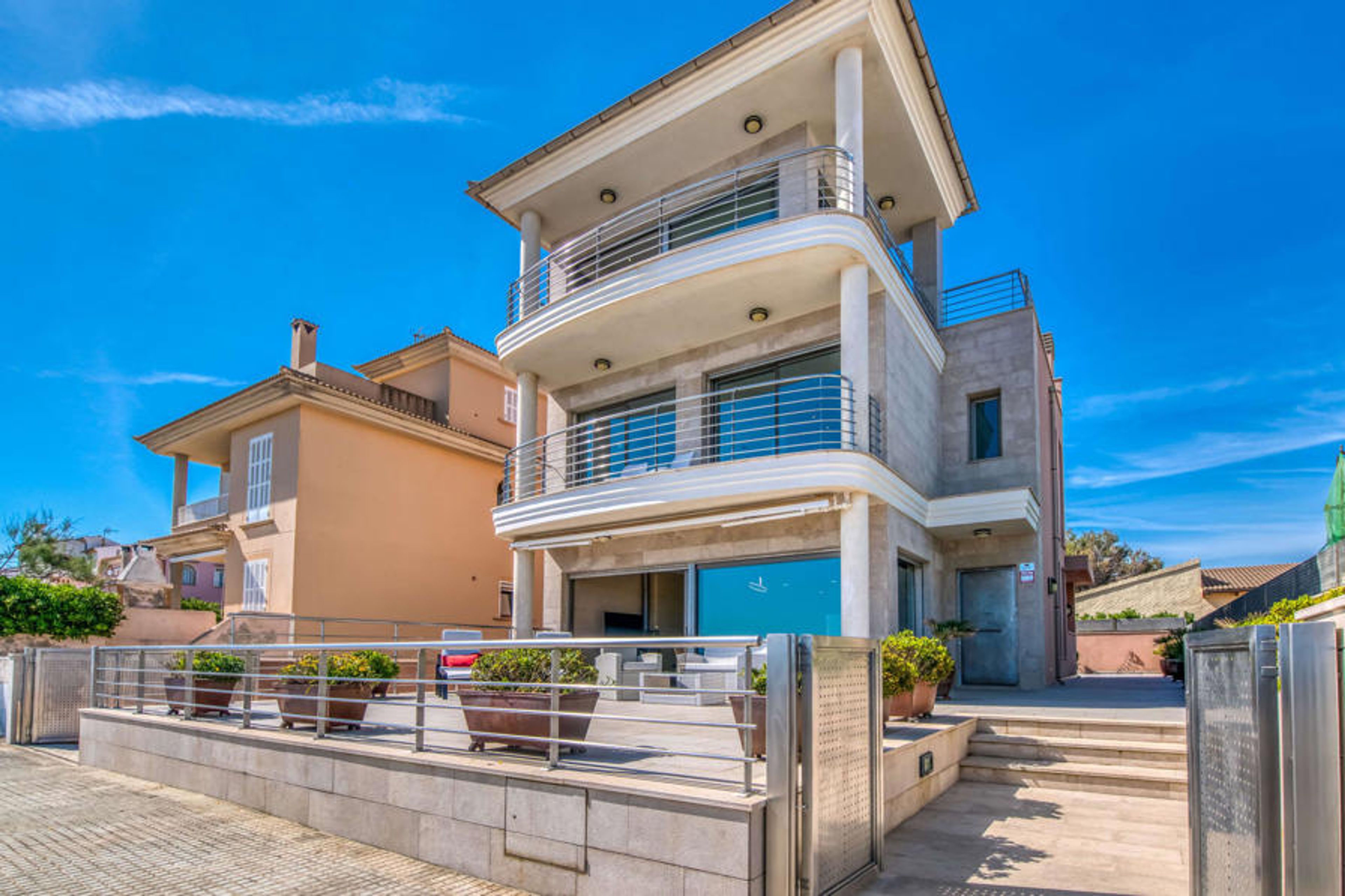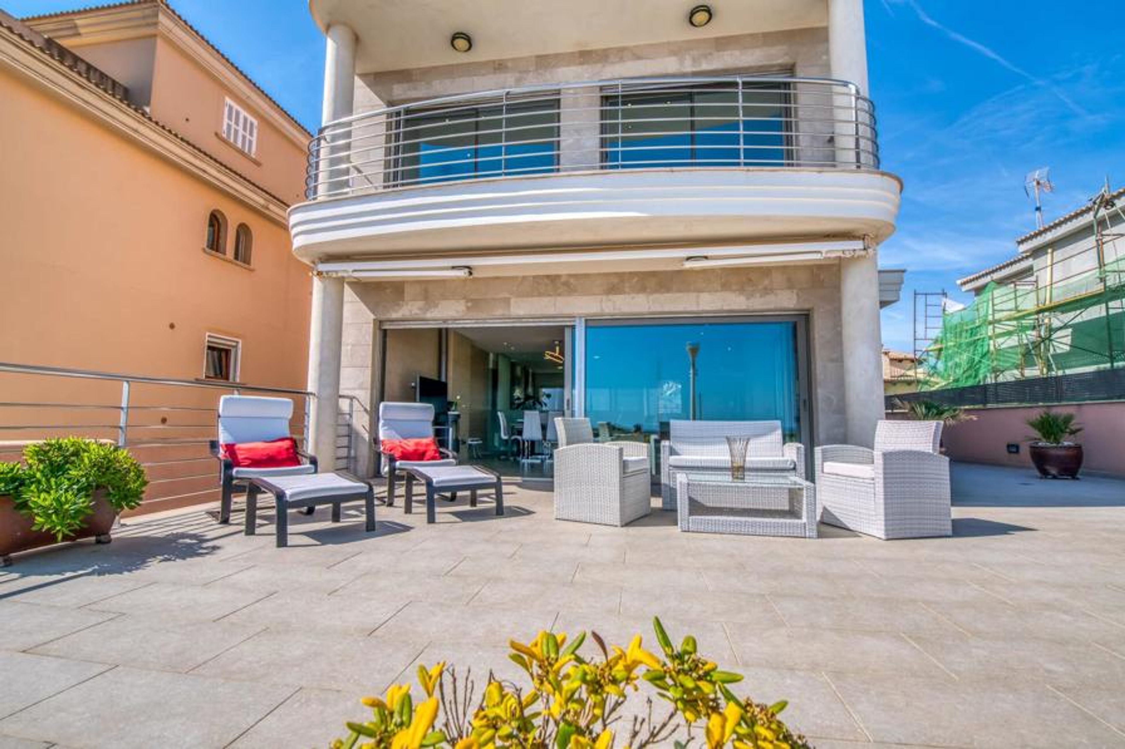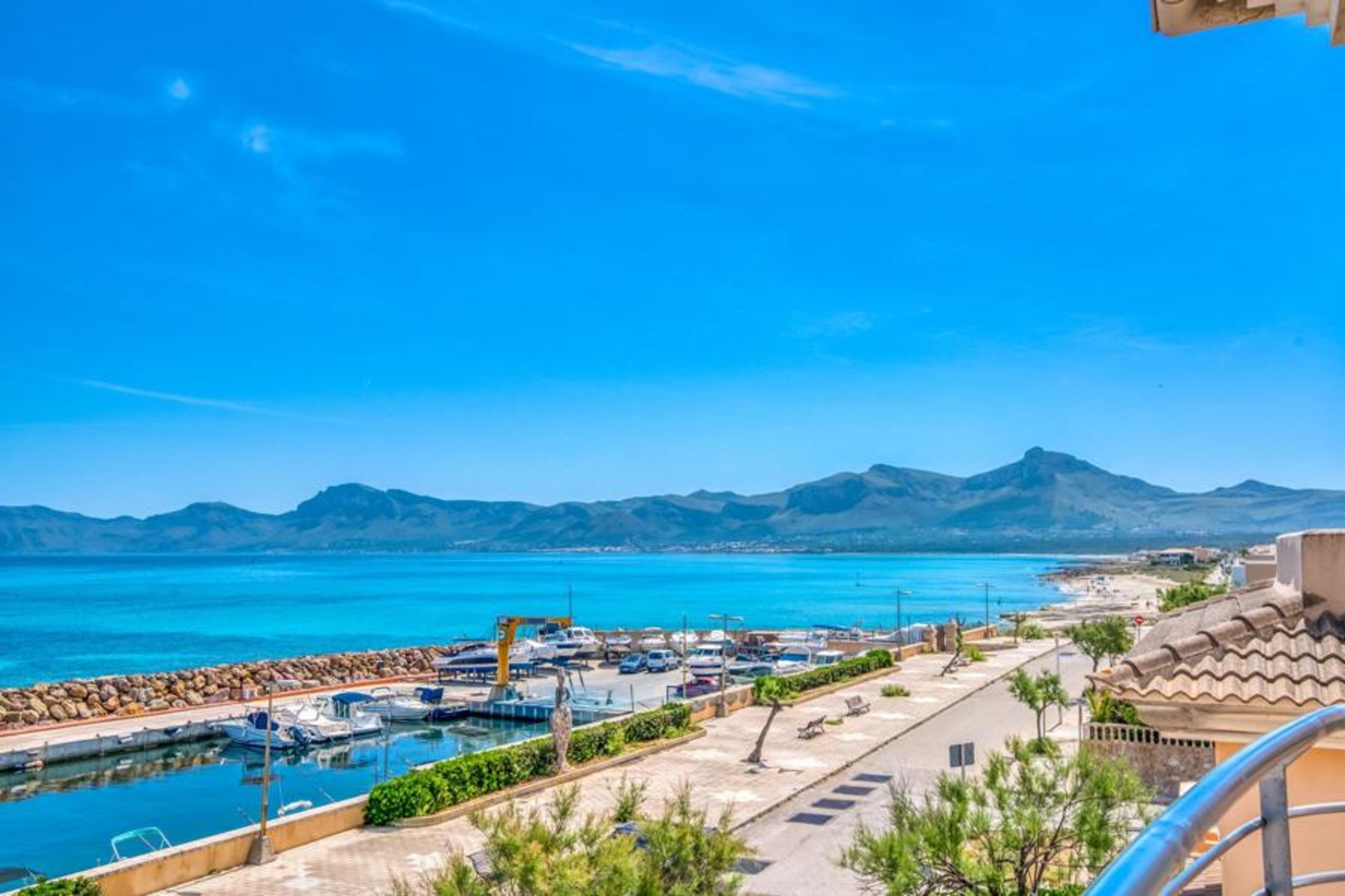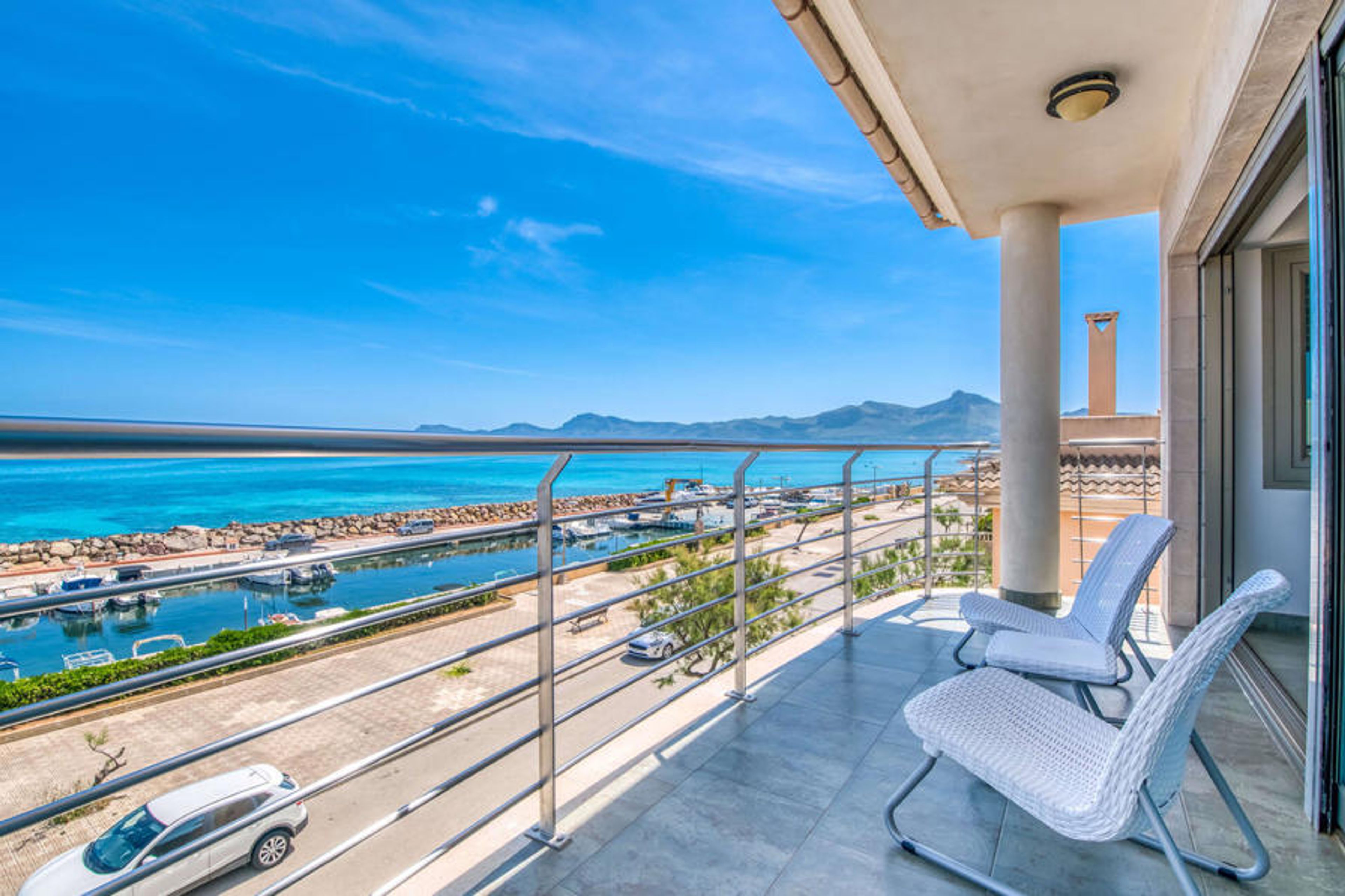 It doesn't get much closer to the sea than this villa on Mallorca! Only the small coastal road and the boat harbour separate you from the deep blue of the Mediterranean. From which floor you enjoy this marvellous view is entirely up to you. Large floor tiles adorn the outdoor area on the ground floor, which has a small lounge and loungers for all-round cosy relaxation. With the right drink within reach, nothing stands in the way of an extensive view. If you prefer to relax undisturbed, simply head to the spacious terrace behind the house, which also offers a dining table and barbecue in addition to other sunbathing options. The views can be topped off on the higher balconies on the first and second floors of the house.