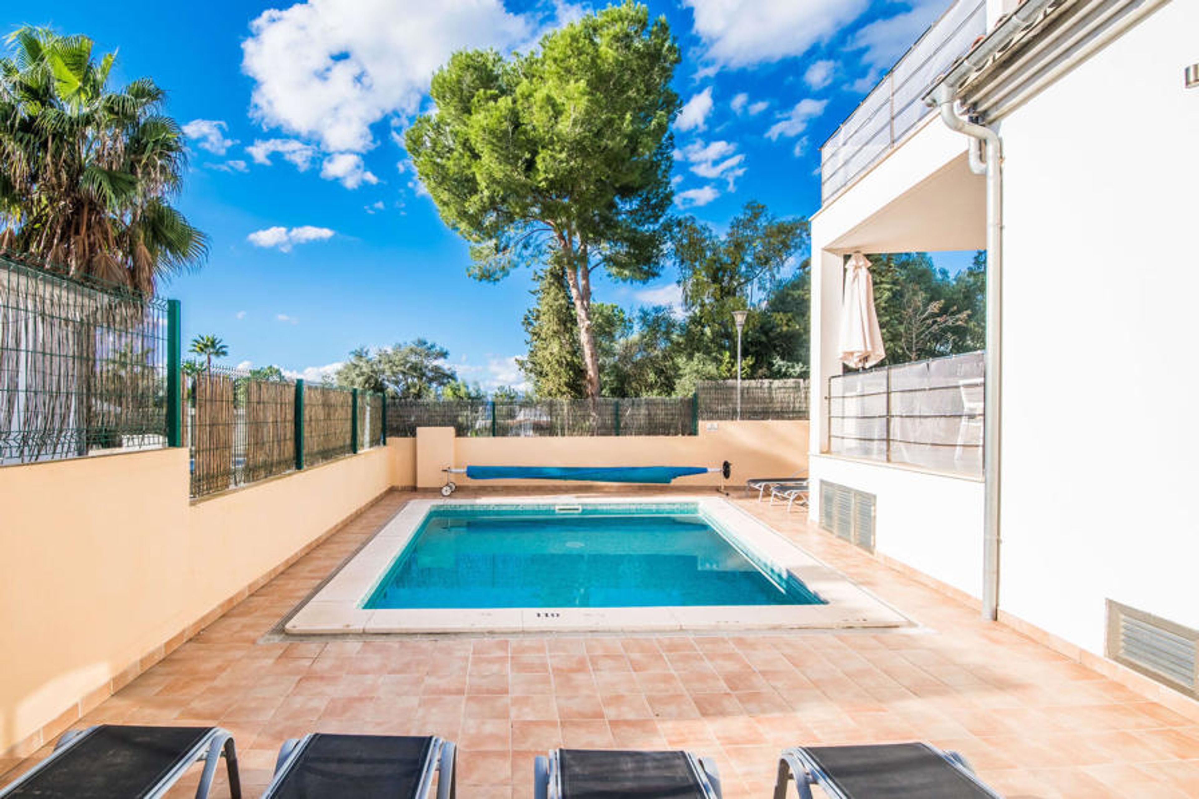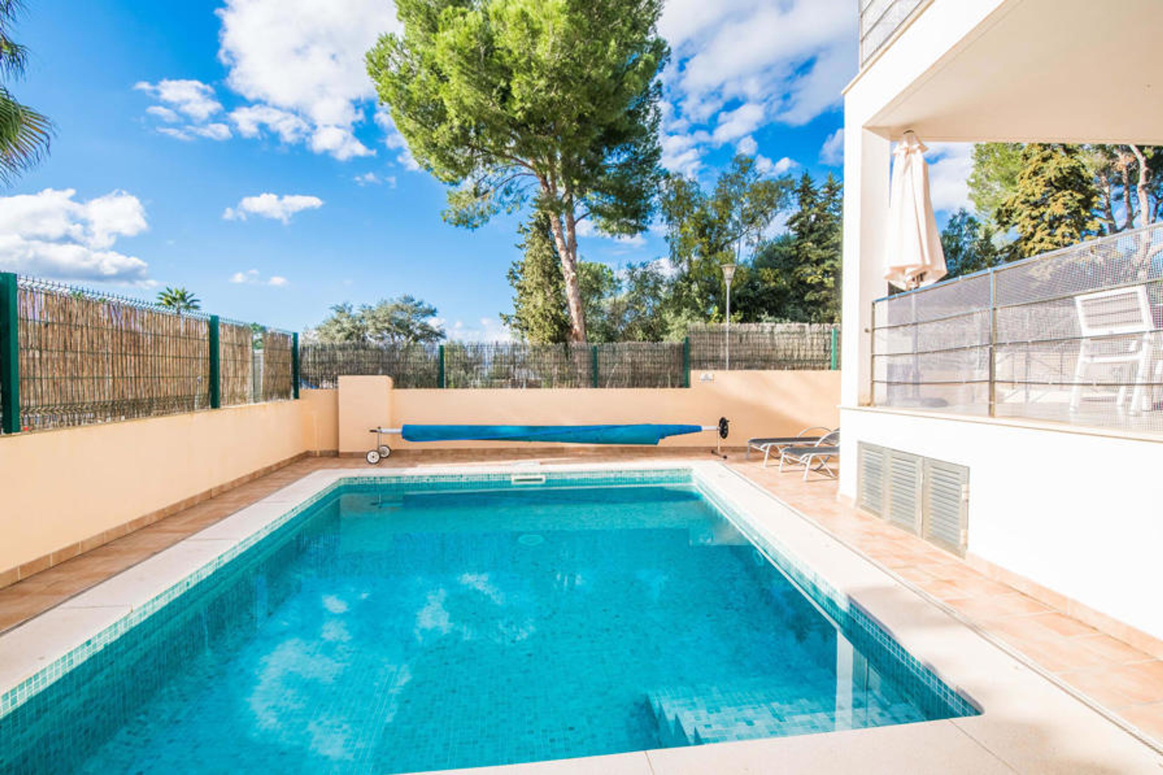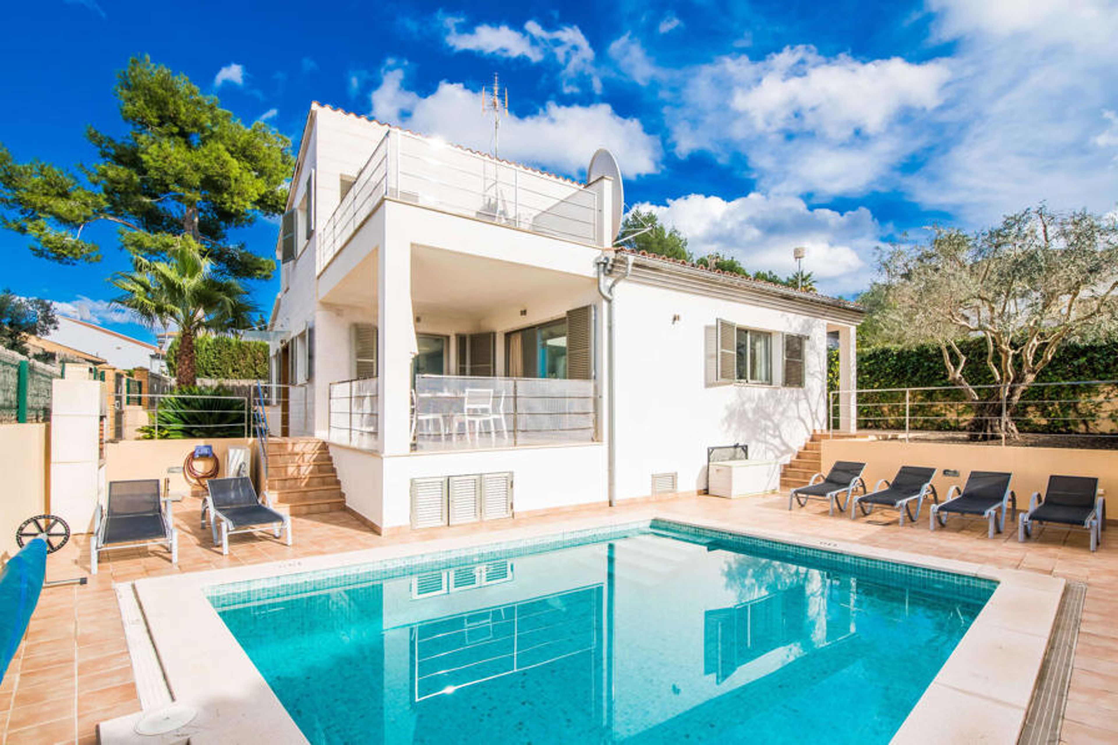 The interior continues to be wonderfully flooded with light. Straight lines, bright and harmonious colours and shapes are the order of the day here. In addition to the entrance area, there is a beautiful living/dining room on the ground floor as well as a kitchen, which is of course fully equipped and shines in the trendy white style. There is even space for an additional dining table. Three aesthetically designed double bedrooms, one of which has an en suite bathroom, and a second bathroom are also located on this living level, which has a very special effect thanks to the glass cube. The fourth bedroom, also with its own bathroom, is located on the upper floor. From here you have access to the aforementioned terrace, where you can also celebrate your first coffee in the morning. This charming villa with private pool is located in the rather quiet Cielo de Bonaire. The sea is just a 10-minute walk away. The area is not very touristy and is therefore the ideal retreat for all Mallorca holidaymakers looking for the tranquillity of the island. Attractive sights of Alcúdia and Pollensa are 5-10 minutes away by car and can be easily reached by road. There are several attractive beaches within a radius of 2 to 4 kilometres.