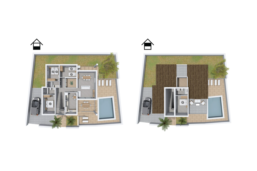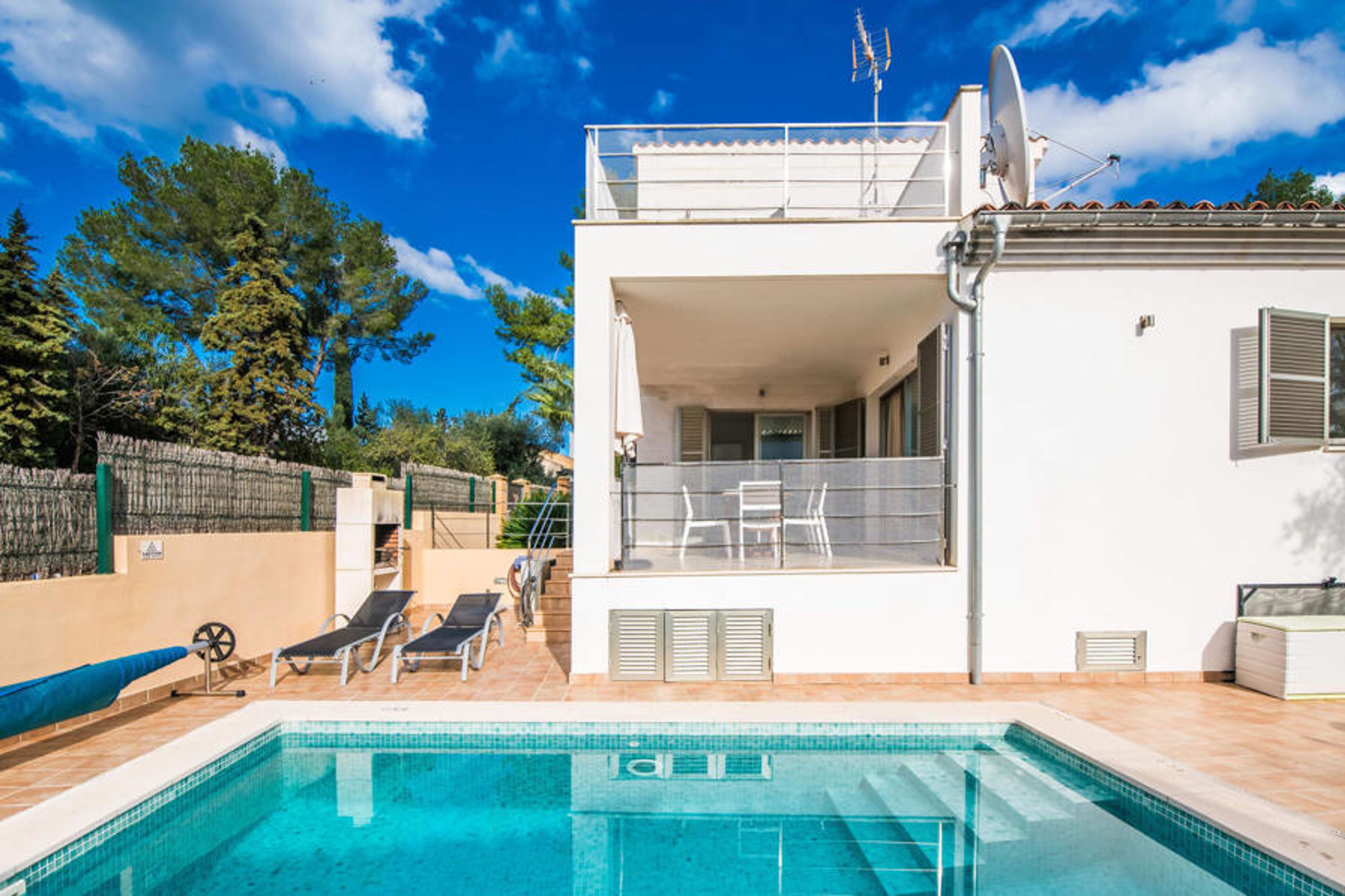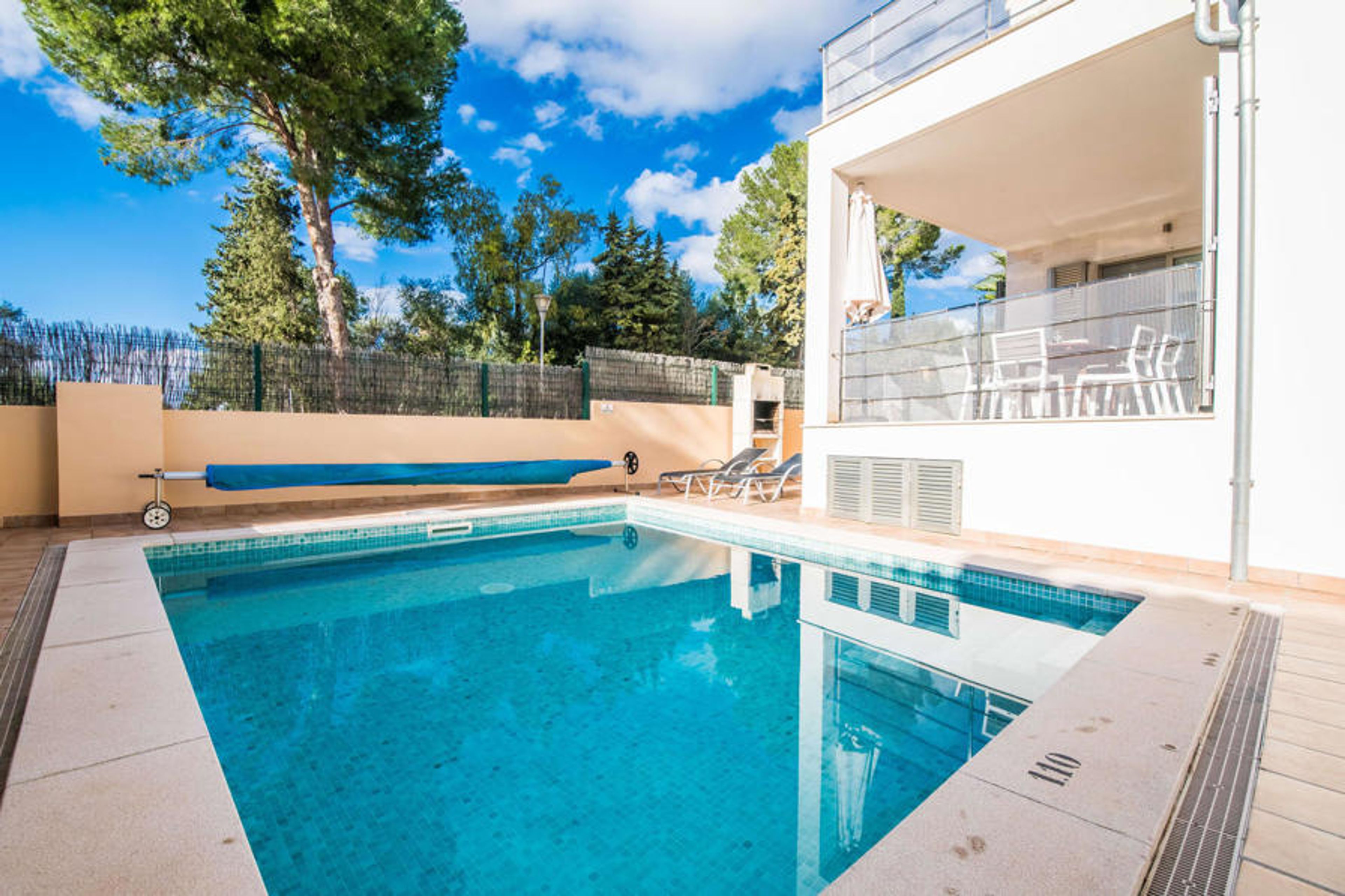 The interior continues to be wonderfully flooded with light. Straight lines, bright and harmonious colours and shapes are the order of the day here. In addition to the entrance area, there is a beautiful living/dining room on the ground floor as well as a kitchen, which is of course fully equipped and shines in the trendy white style. There is even space for an additional dining table. Three aesthetically designed double bedrooms, one of which has an en suite bathroom, and a second bathroom are also located on this living level, which has a very special effect thanks to the glass cube. The fourth bedroom, also with its own bathroom, is located on the upper floor. From here you have access to the aforementioned terrace, where you can also celebrate your first coffee in the morning. This charming villa with private pool is located in the rather quiet Cielo de Bonaire. The sea is just a 10-minute walk away. The area is not very touristy and is therefore the ideal retreat for all Mallorca holidaymakers looking for the tranquillity of the island. Attractive sights of Alcúdia and Pollensa are 5-10 minutes away by car and can be easily reached by road. There are several attractive beaches within a radius of 2 to 4 kilometres.