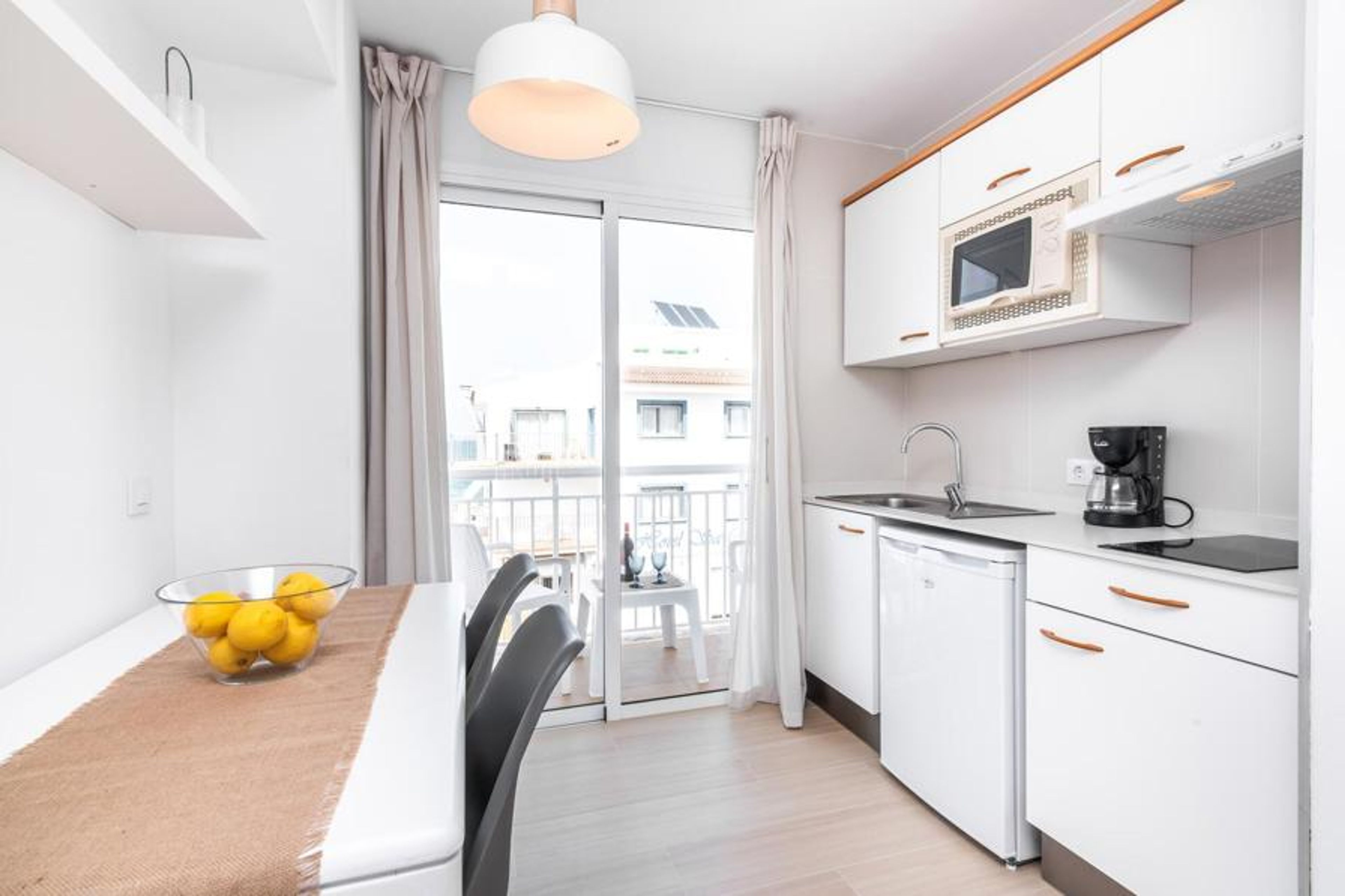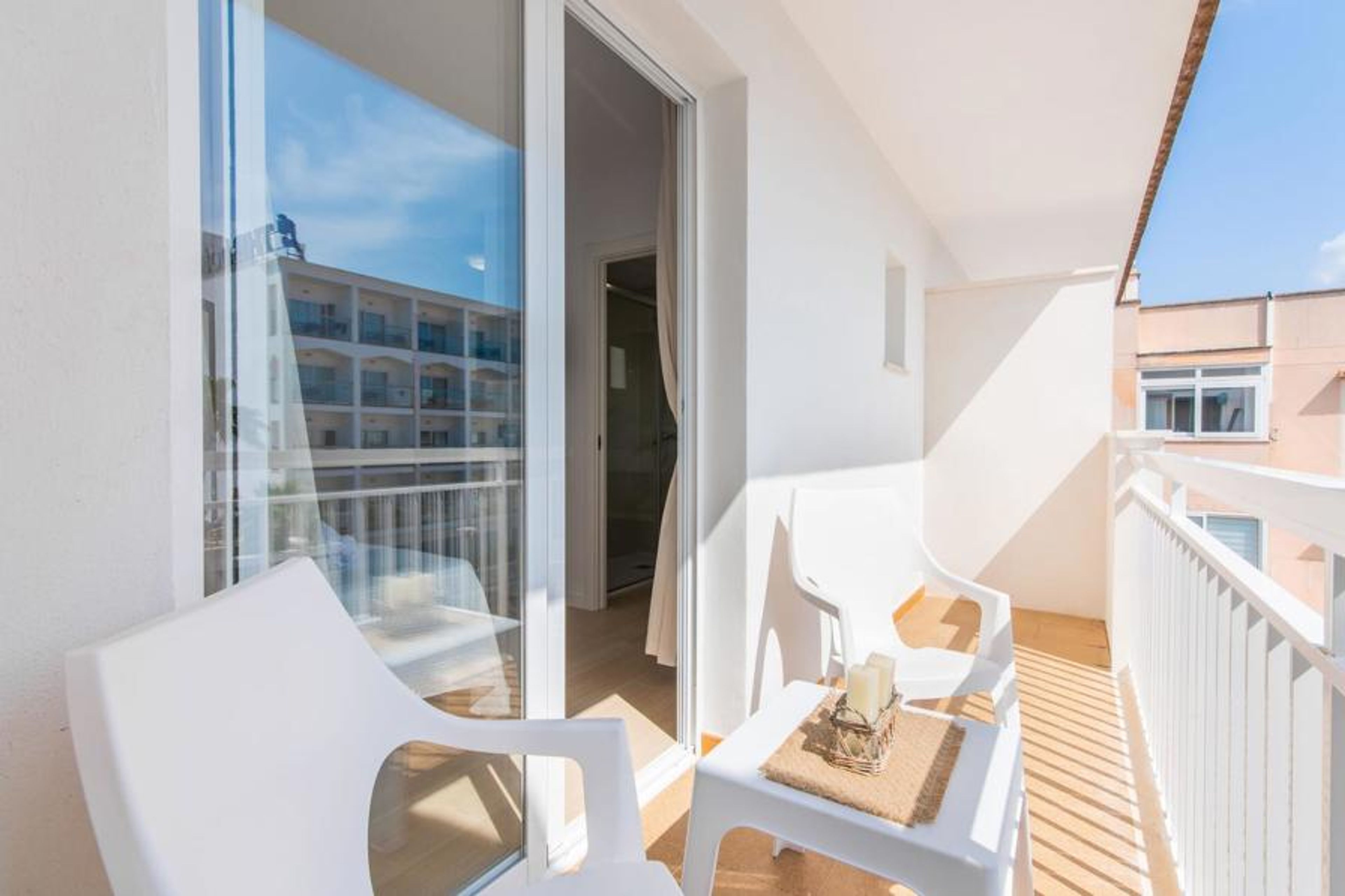 Thanks to an ingenious room concept, the Confluentia Playa 12 holiday apartment offers a cosy living area with plenty of natural light. It is open-plan and consists of a neat sleeping and dining area equipped with German and English satellite TV and an integrated kitchen with direct access to the balcony. This is a great place to spend time together indoors and ideal for self-catering. Lots of white and some colourful accents create a fresh, summery flair. The presence of heating and air conditioning ensures perfect indoor temperatures at all times. A chic, modern bathroom with a walk-in shower rounds off the inviting living comfort of this holiday apartment for two in Mallorca. The modern holiday apartment Confluentia Playa 12 is located near the centre of Can Picafort and directly on the north coast of Mallorca. In this beautiful village you will find restaurants, bars, discos and a variety of shopping facilities. The sandy beach is within walking distance and the bay of Alcúdia is just a few metres away. The area around Can Picafort is also ideal for cycling.