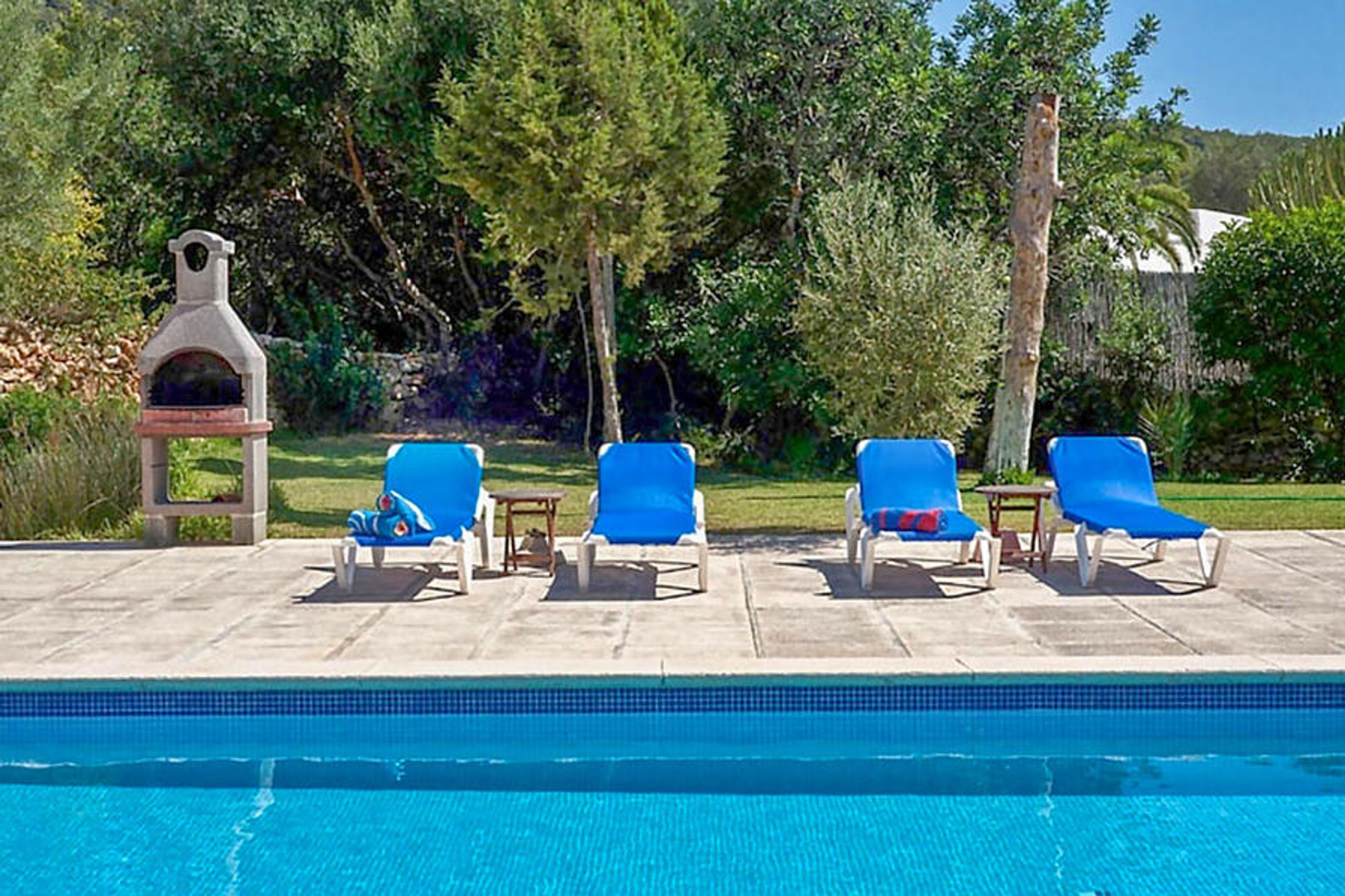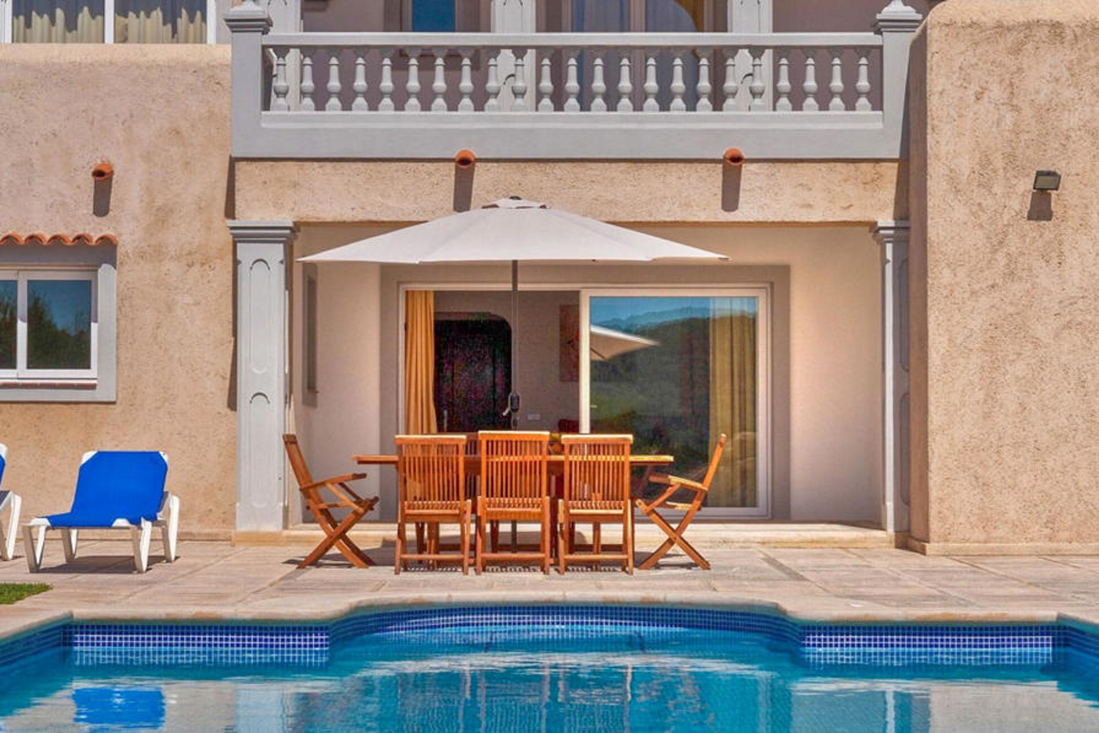 The villa is distributed over two levels and has a total of 4 bedrooms and 3 bathrooms inside the villa and 1 additional bathroom outside. On the ground floor you will find two bedrooms with two single beds, a bathroom with bathtub and a fully equipped kitchen with modern appliances such as fridge with freezer compartment, dishwasher, oven, microwave, ceramic hob, toaster, kettle, washing machine and tumble dryer. The kitchen opens directly onto the garden and has a table for four people. The living room with TV, stereo system and free WiFi offers direct access to the pool.
