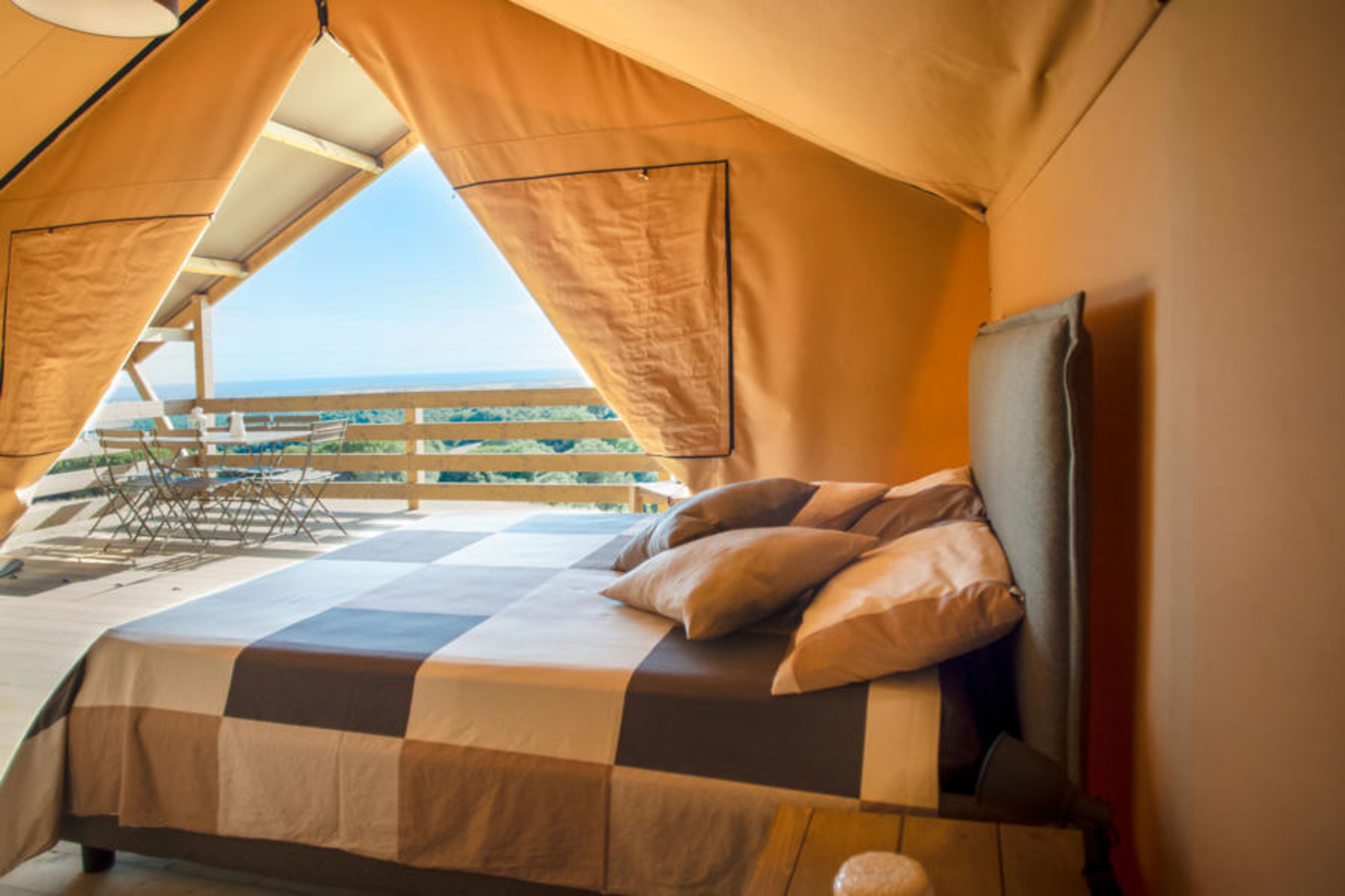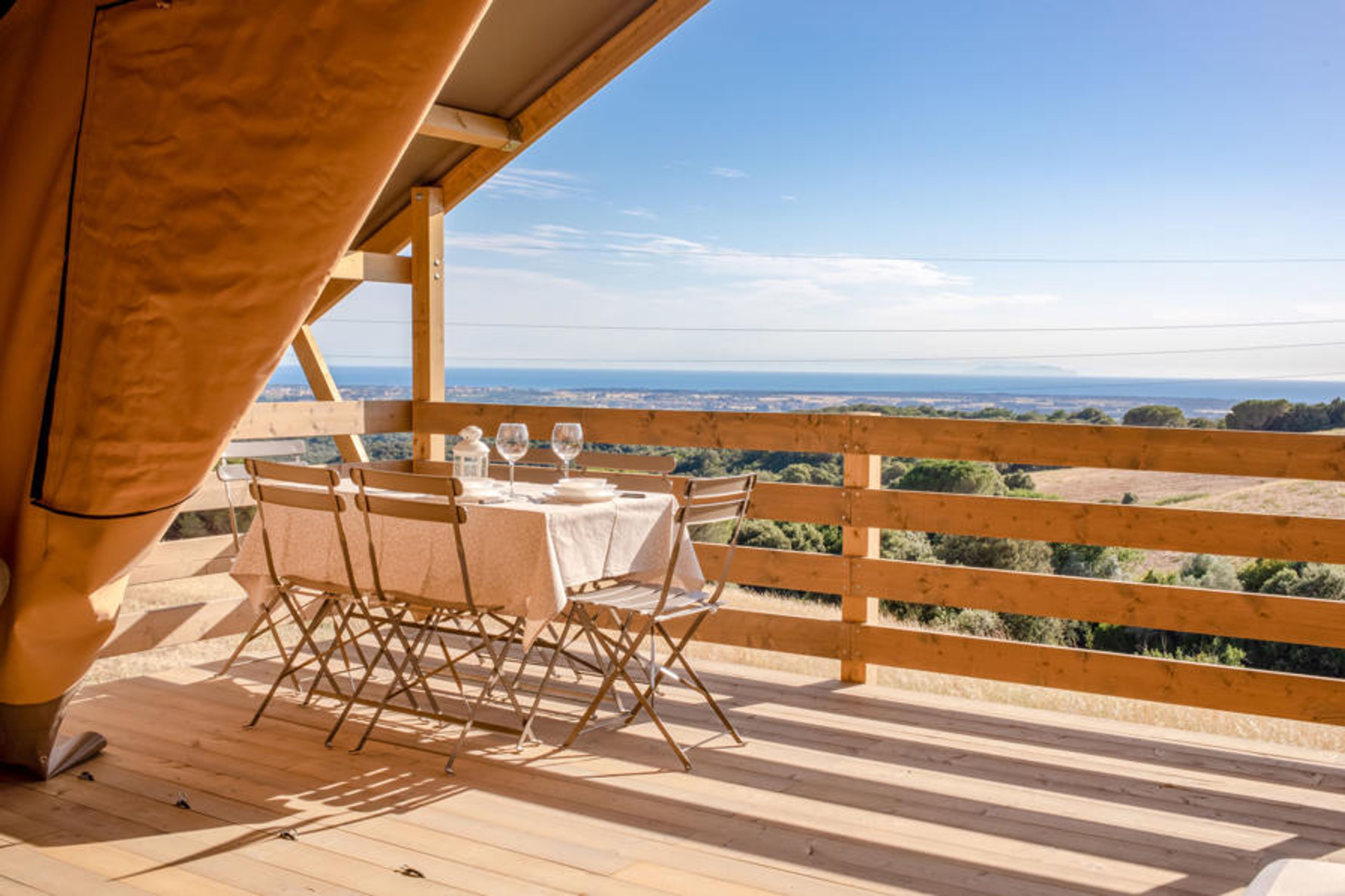 "Glampingtent Minerva", 1-room mobile home 32 m2, on the upper ground floor. Modern and cosy furnishings: open living/sleeping room with 1 double sofabed and 1 double bed. Exit to the veranda. Open gallery with 1 french bed. Open kitchen (4 ceramic glass hob hotplates, kettle, electric coffee machine). Shower/bidet/WC. Electric heating, air-conditioning. Terrace 16 m2, roofed. Terrace furniture. Very beautiful panoramic view of the sea and the countryside. Facilities: hair dryer. Please note: maximum 1 pet/ dog allowed. Private entrance. IT050030B5LGYNK79U