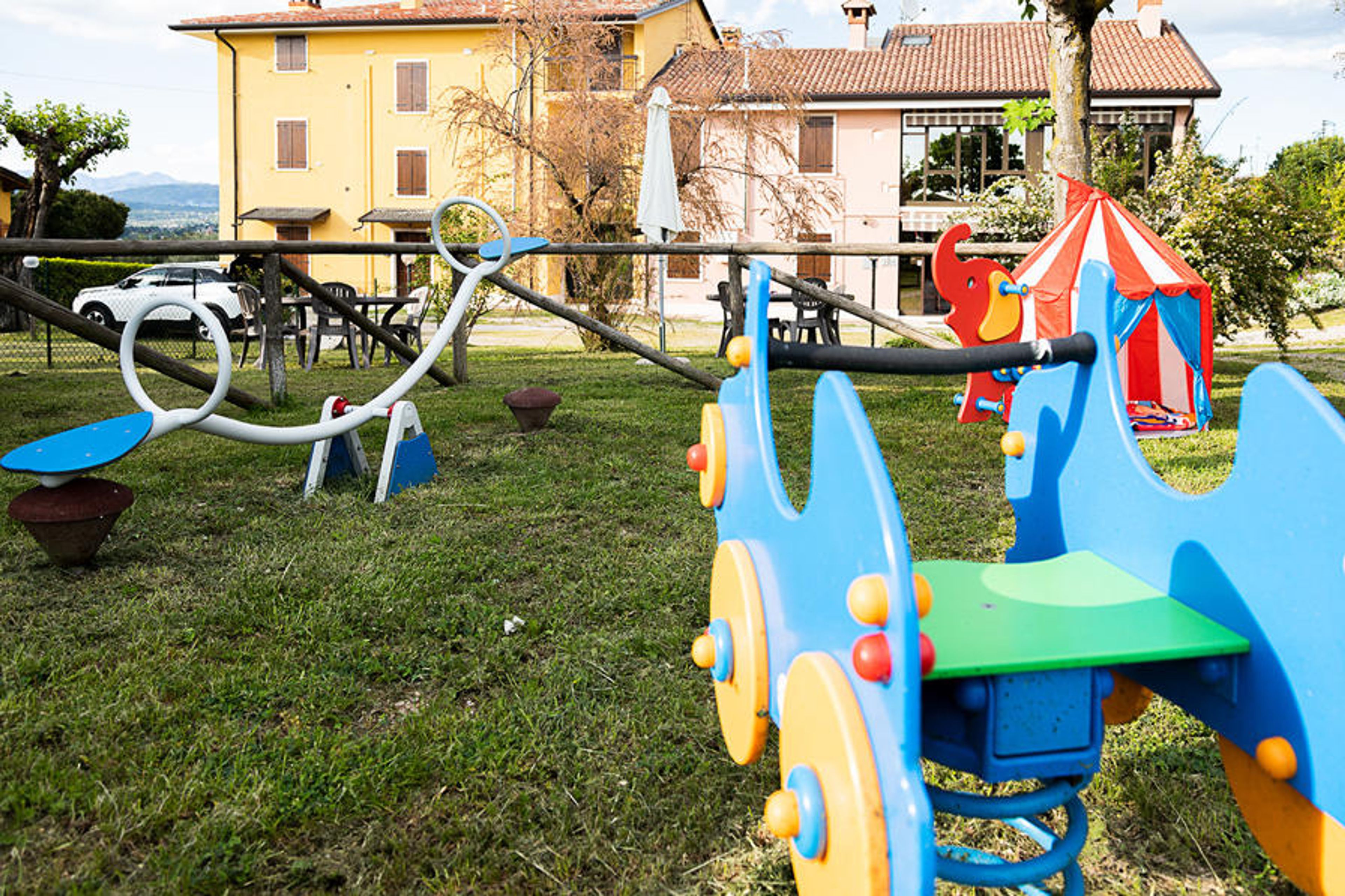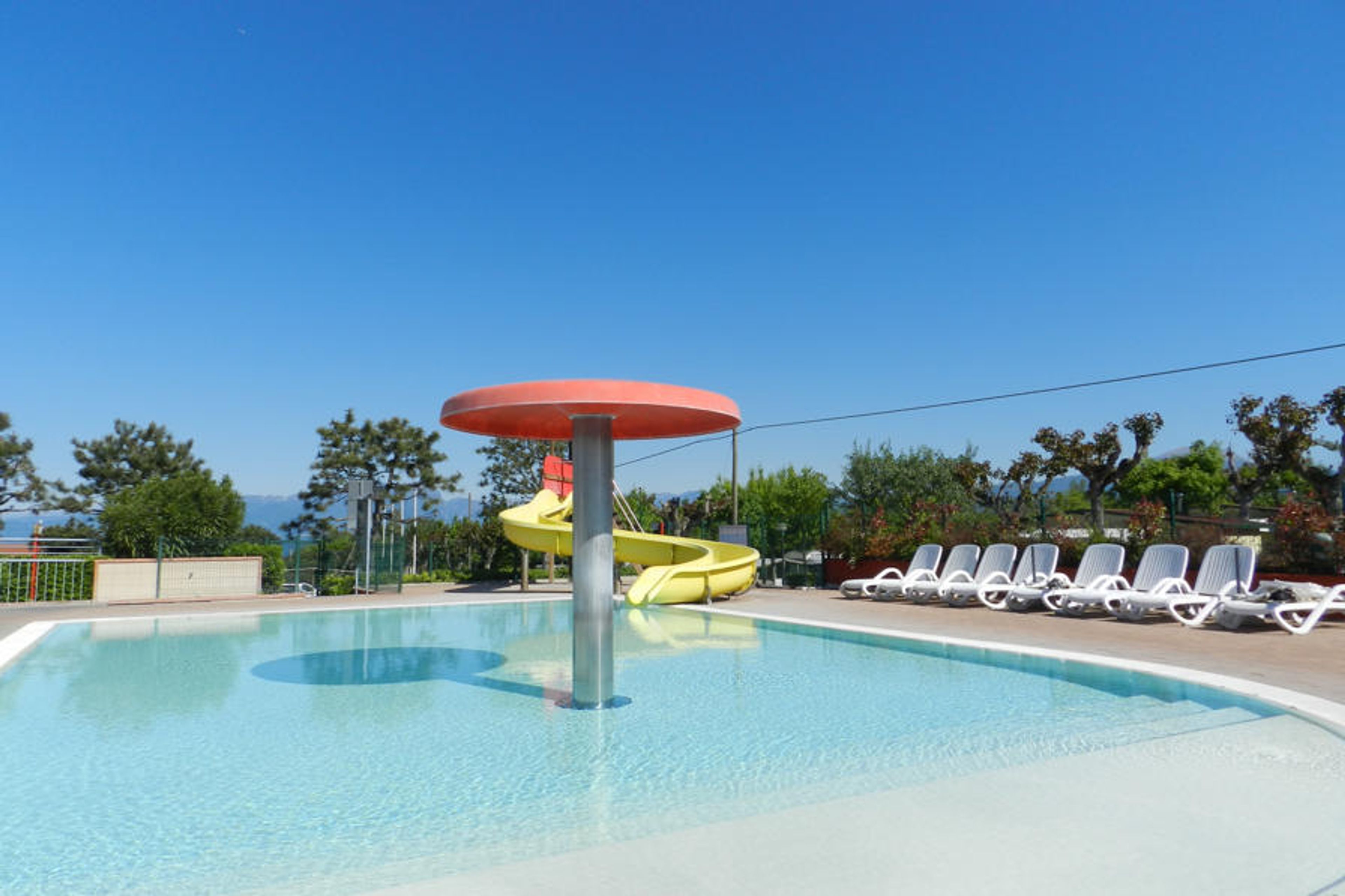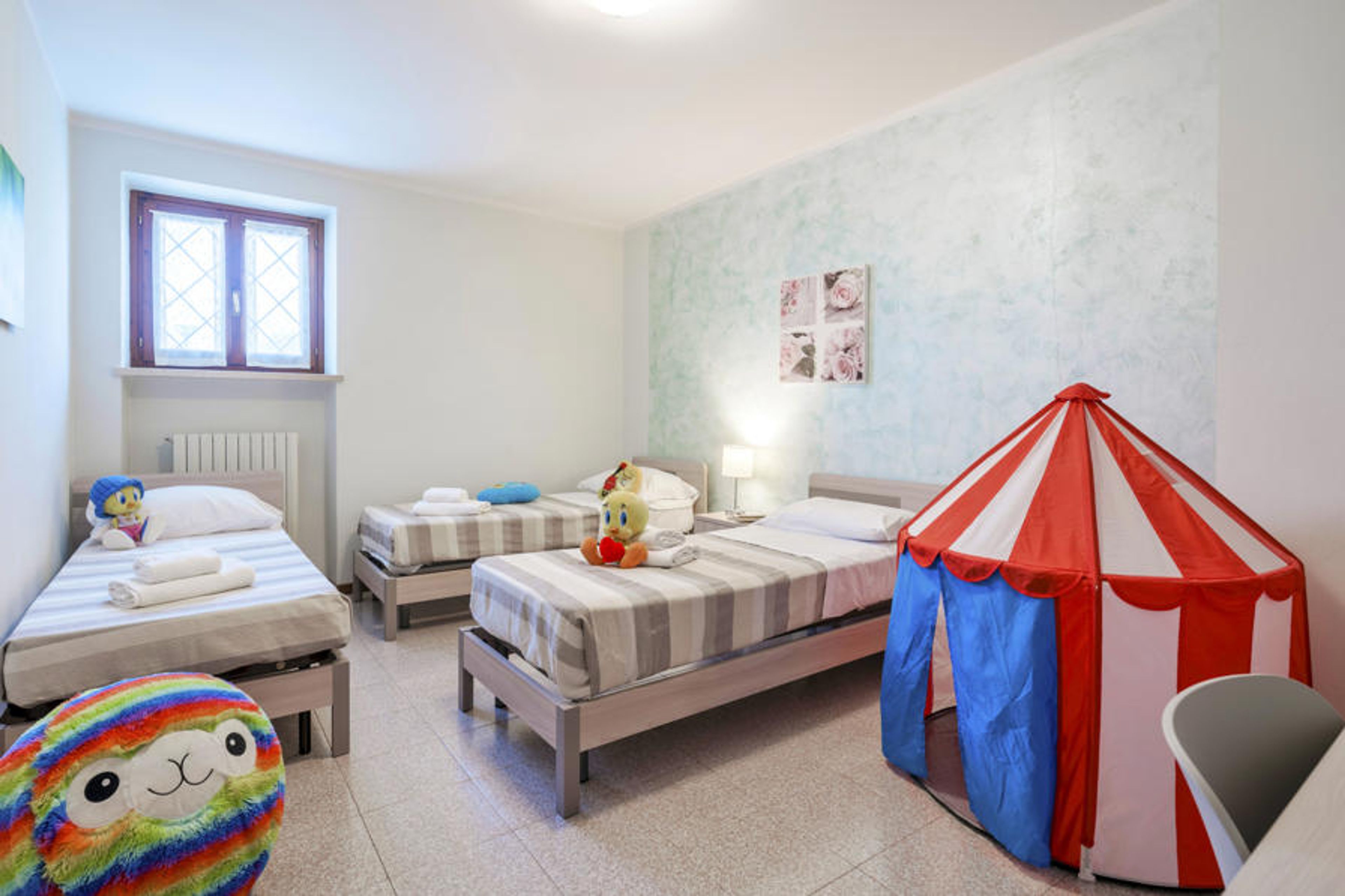 Ground floor apartment with three rooms consisting of a bright living room with a new and equipped kitchen with refrigerator with freezer, table and chairs, coffee machine, toaster, 4-burner hob, microwave and dishwasher, high chair. Sofa bed, satellite TV, Wi-Fi, air conditioning/heating. New master bedroom with double bed, cot, wardrobe, safe. New room with three single beds (can be positioned side by side), small wardrobe and children's desk, bathroom with shower, bidet, mirror and washing machine. Direct access to the large garden furnished with tables, chairs and umbrellas. Small children's play area near the garden. We recommend this apartment for families with children looking for a place near the lake, in a quiet location with all the comforts of a holiday village.
