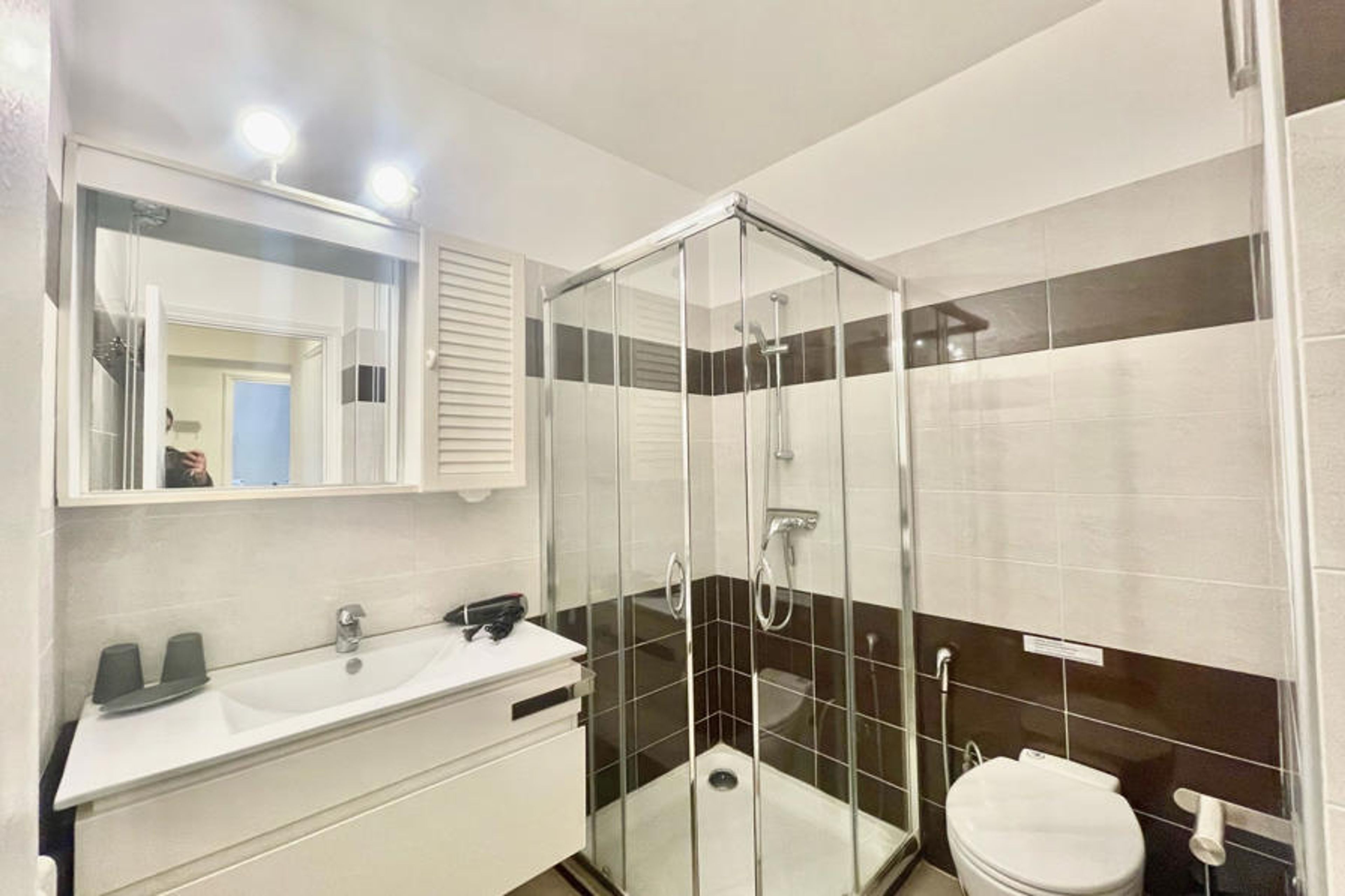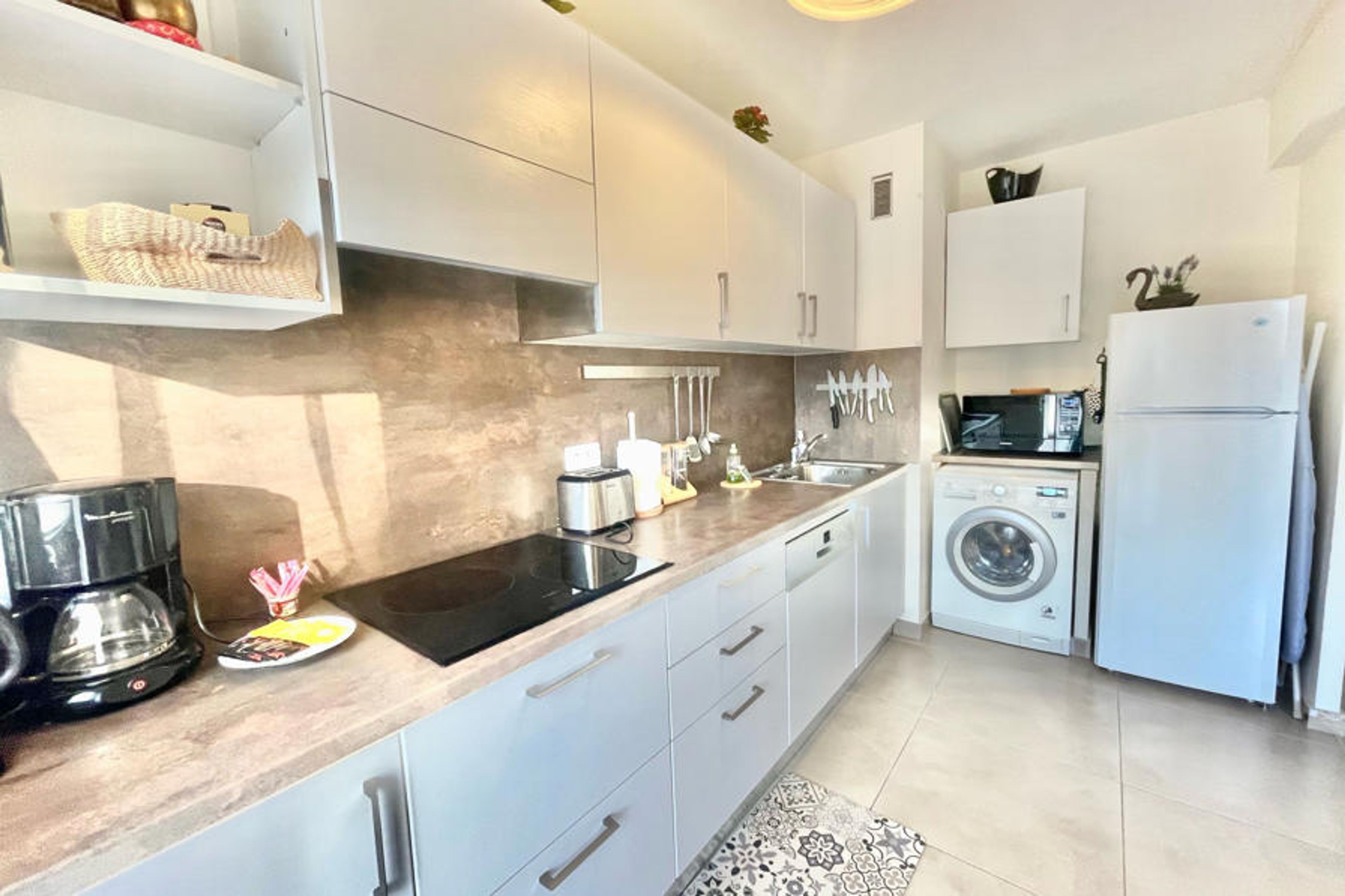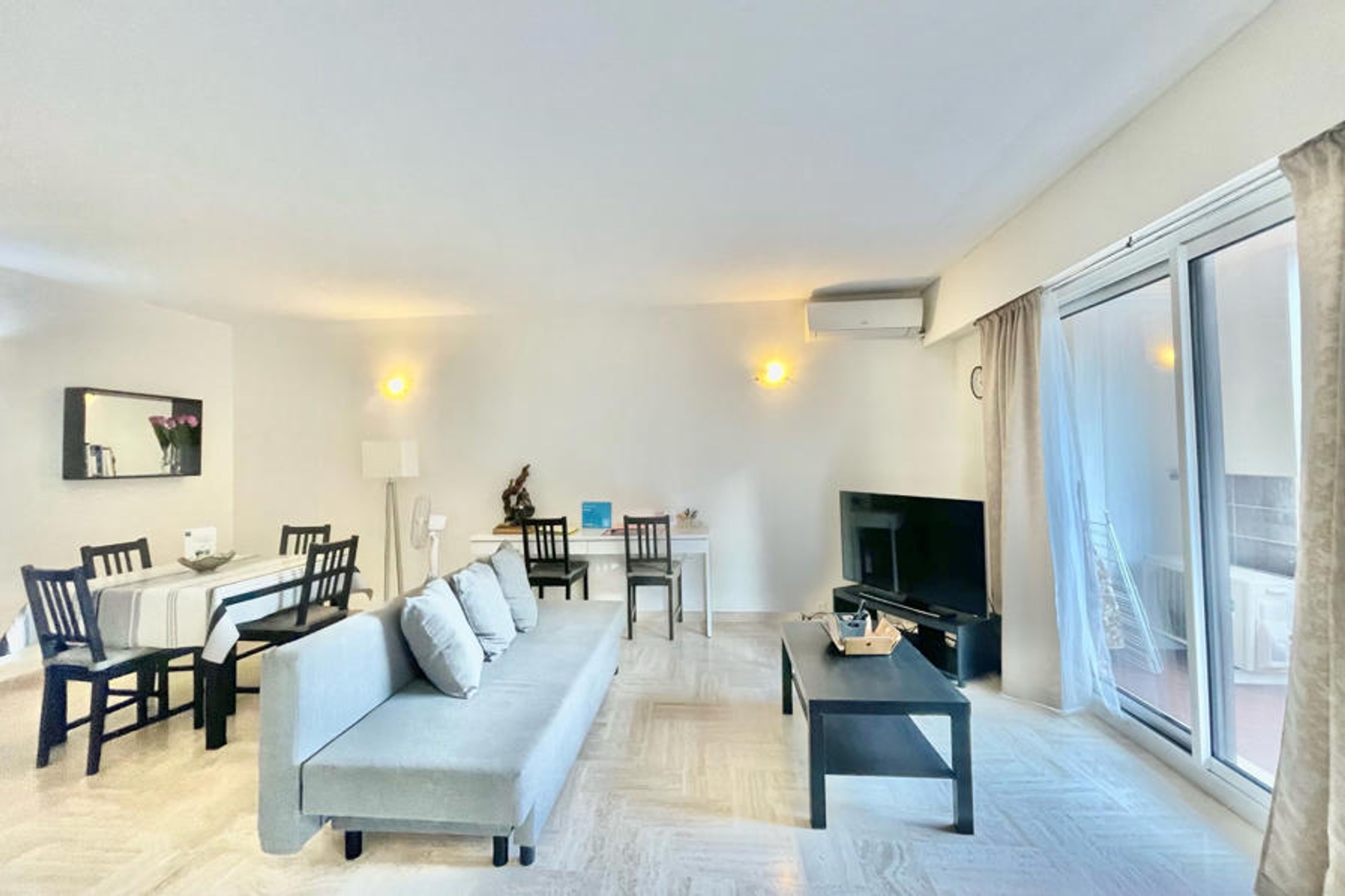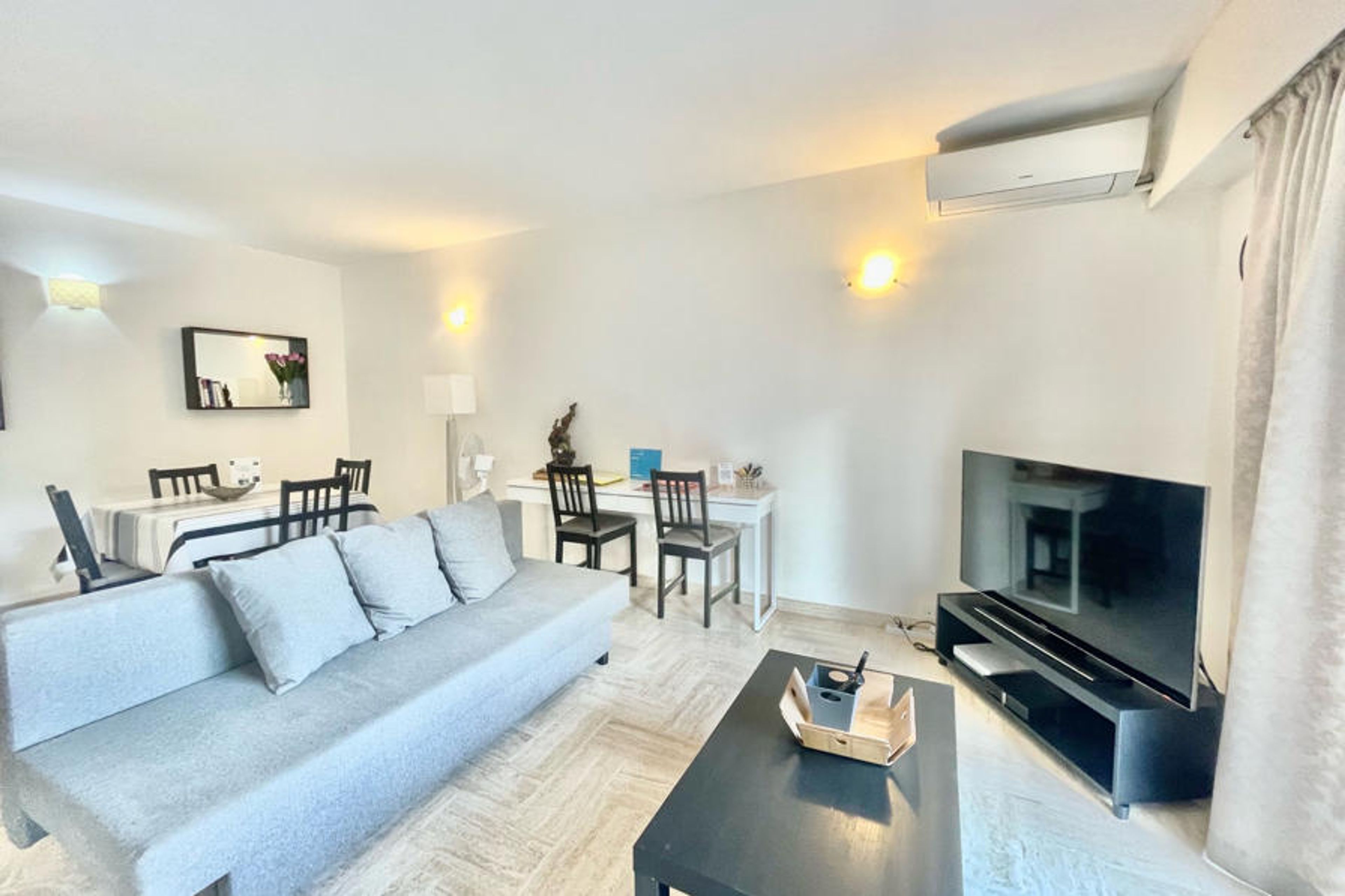 Located in a secure residence, this pleasant two-room renovated apartment offers a beautiful living room with a fully equipped kitchen, a lounge area with a sofa bed, a dining space and a balcony. The apartment also includes a bedroom with two single beds and storage, a bathroom with WC, an additional WC, as well as Wi-Fi access and air conditioning.