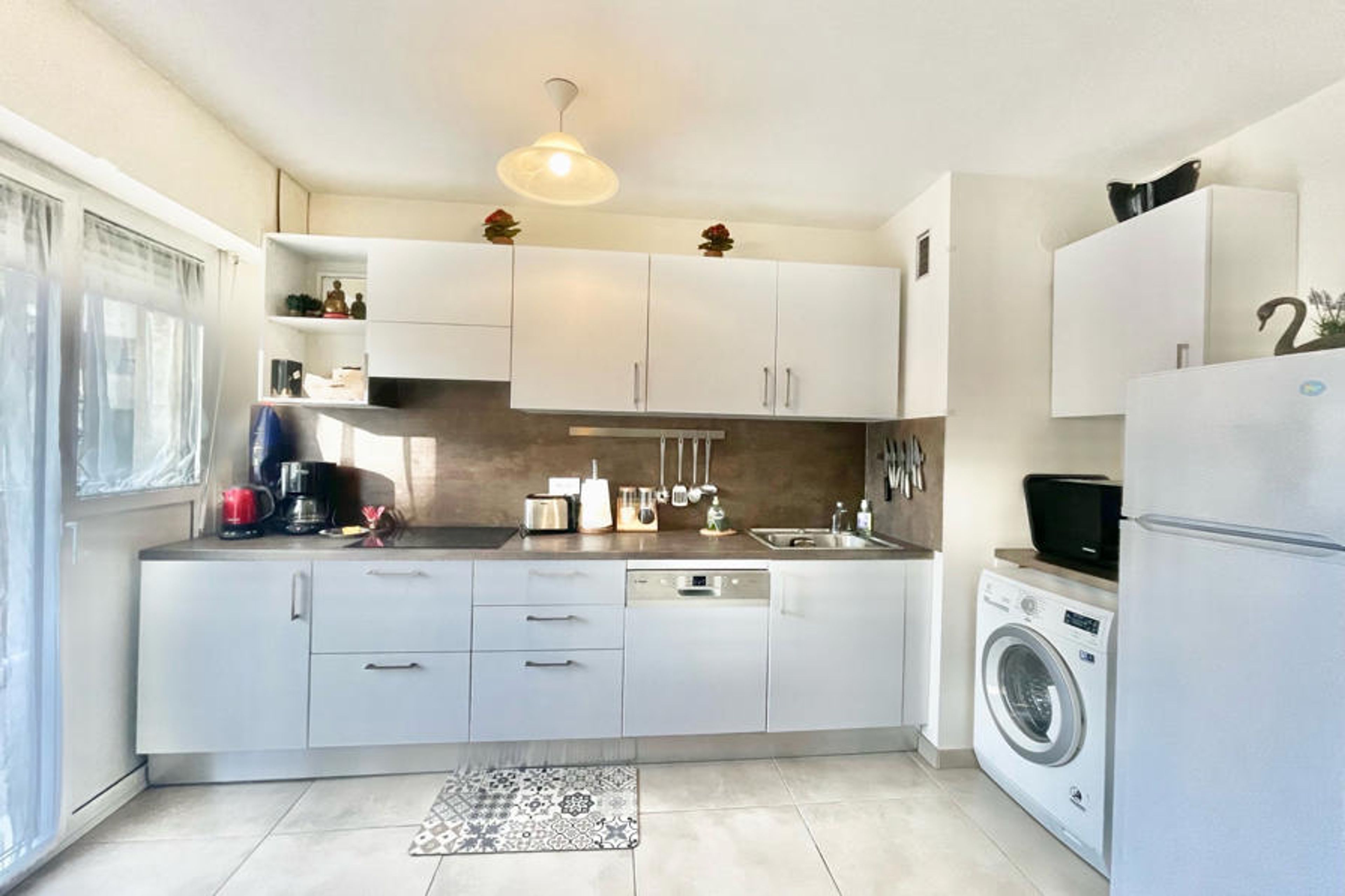 Located in a secure residence, this pleasant two-room renovated apartment offers a beautiful living room with a fully equipped kitchen, a lounge area with a sofa bed, a dining space and a balcony.