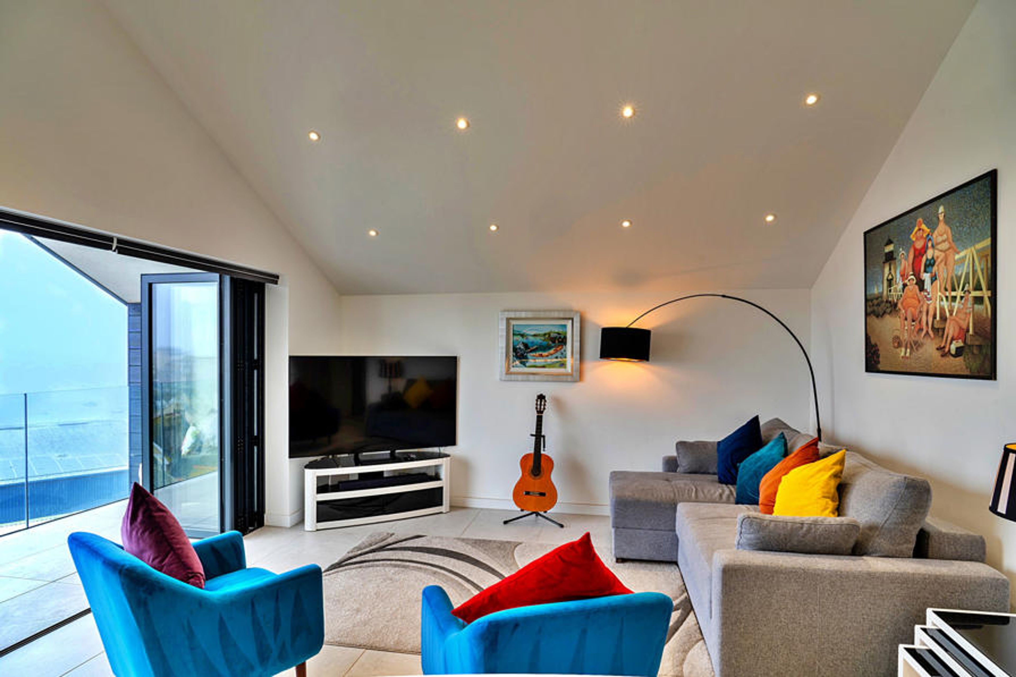 The living area is open plan with dining, plenty of seating, 65" smart TV and a fully equipped kitchen with integrated fridge/freezer, oven, induction hob, microwave, wine cooler, dishwasher and washing machine/tumble drier. The apartment has underfloor heating throughout. Large bi-fold doors open out on to the balcony which is 7.1 metres wide and has plenty of comfortable outside seating from which the fabulous views can be enjoyed.