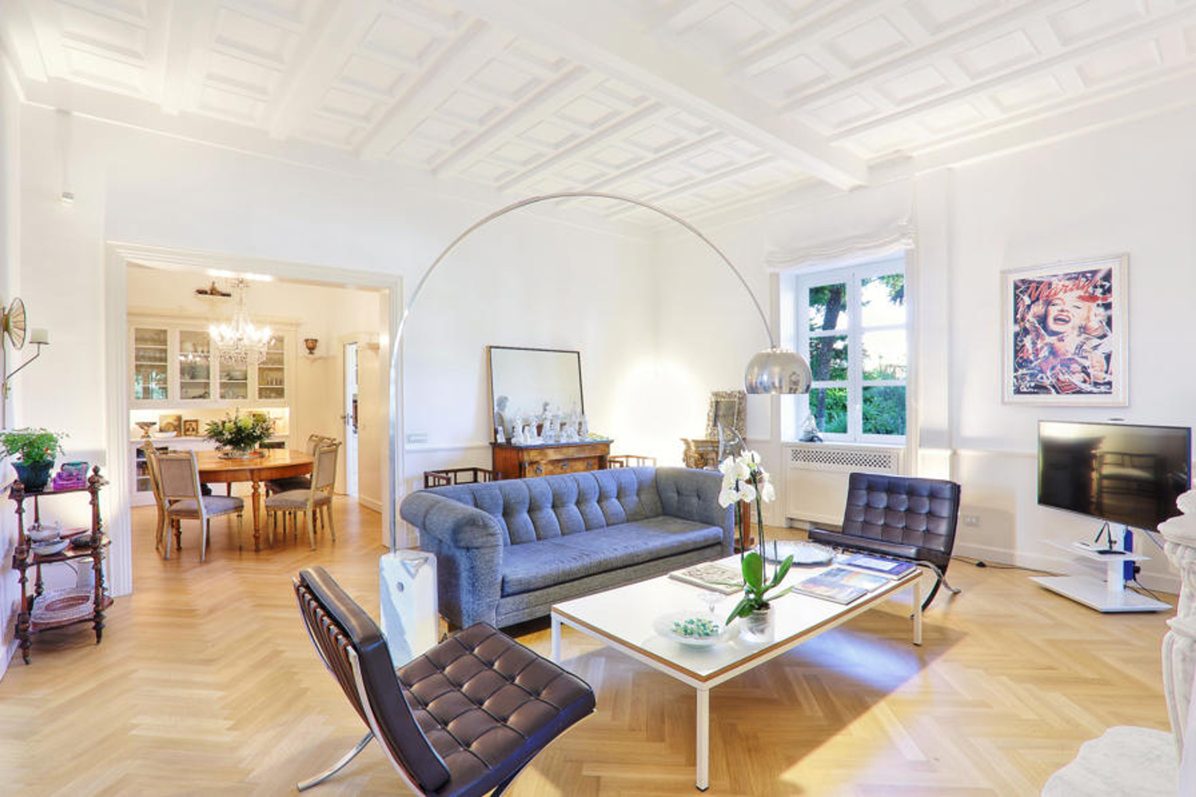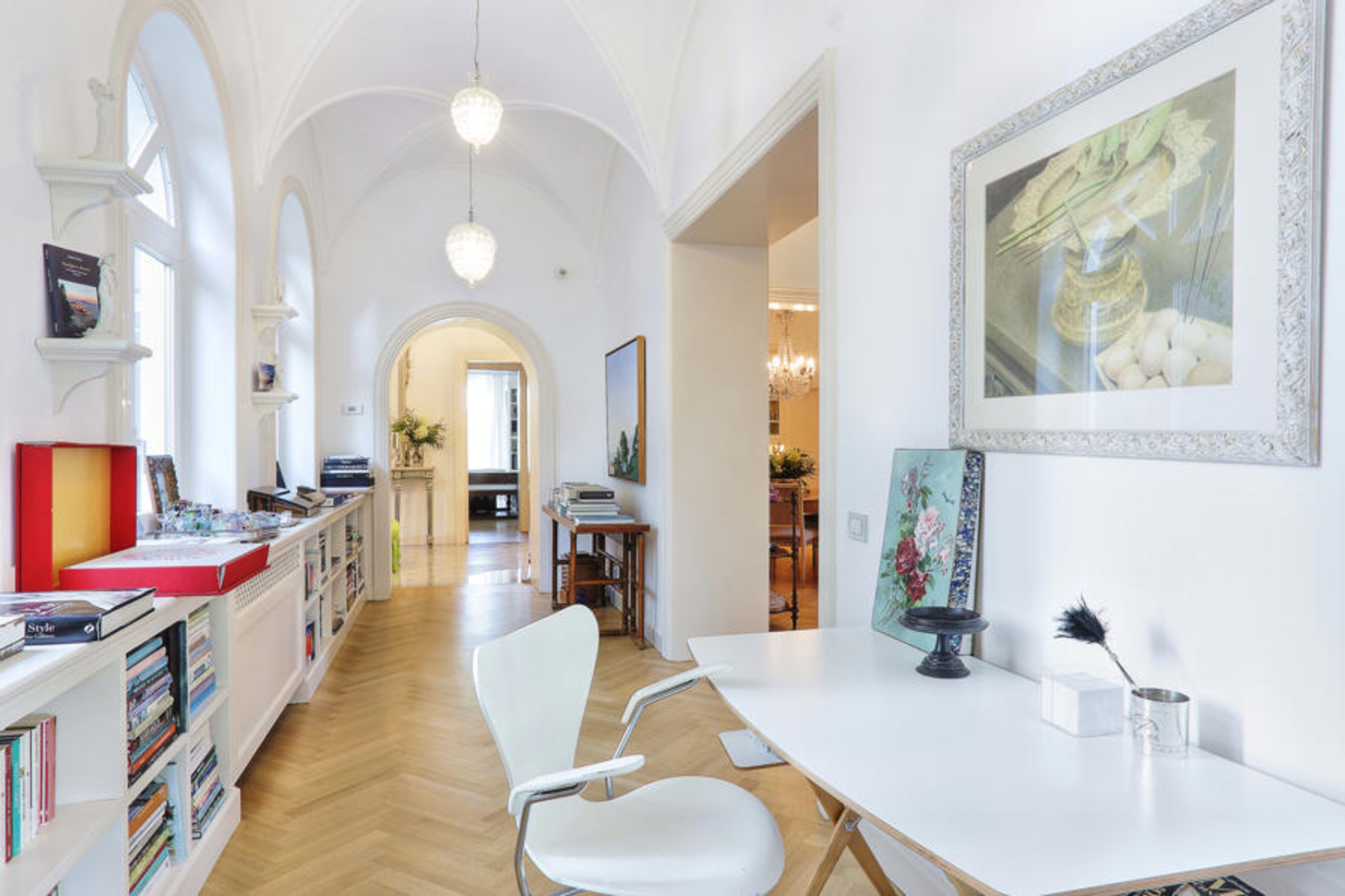 The house (130 m²) is very roomy for a family, with a lounge, dining room, kitchen and a study with desk next to the living room. The décor throughout the apartment is extremely stylish, with parquet flooring throughout and high-end finishes. Light streams through the French windows in the lounge and into the adjacent dining area. The classy kitchen, located next to the dining room, features marble countertops and ample storage space.
