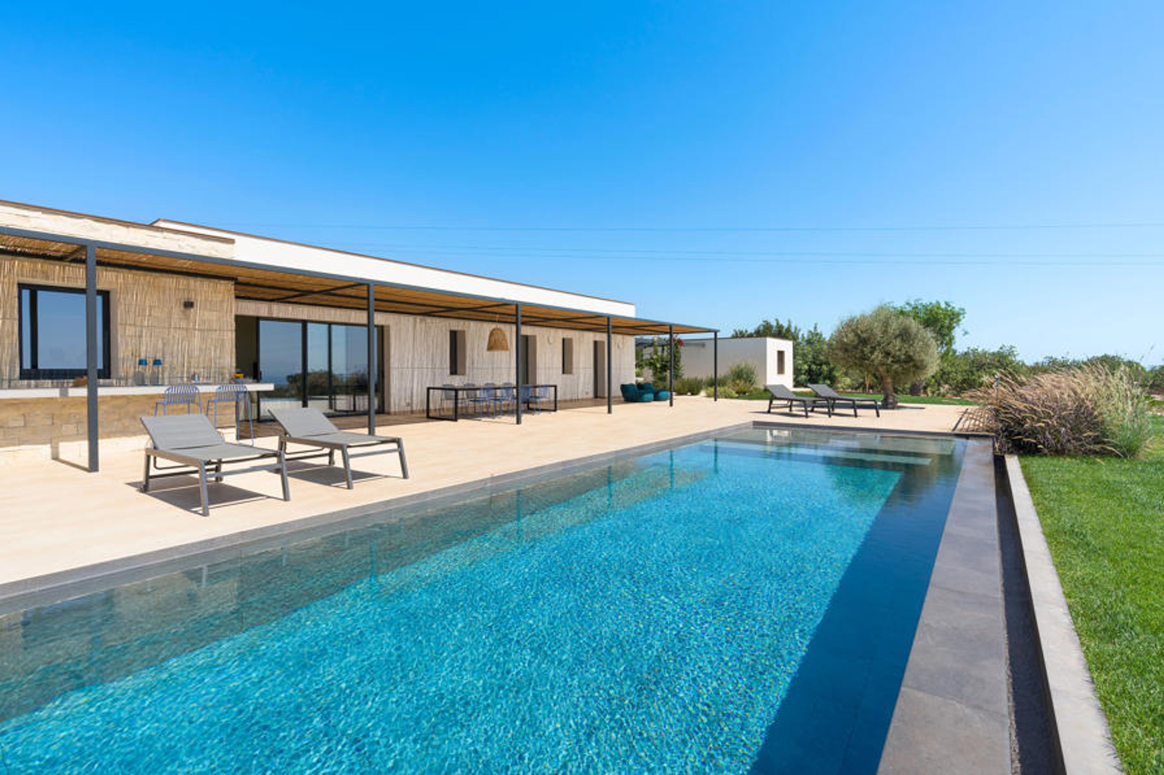 An oasis of refined comfort and panoramic sea views. This is Passo Salina, a beautiful residence with swimming pool located near Scicli. Surrounded by a well-kept and lush Mediterranean garden, the Villa has a beautiful infinity pool and large sun terrace with garden furniture, ideal for relaxing breakfasts and enjoying time spent together. These exclusive and inviting outdoor spaces are joined by the welcoming indoor environments that include a bright living room and dining area with an expansive glass panels opening out onto the terrace, a kitchen, two double bedrooms with walk-in closet and private bathroom, along with a bedroom with two single beds and another bathroom, also with shower. The annex instead consists of a living room with kitchenette and a double bedroom with bathroom. The villa even has air-conditioning and heat pumps in all rooms, Wi-Fi internet connection, television, washing machine and dishwasher, American coffee and espresso machine, ice-maker and barbecue. The sizable property also contains another villa that, in turn, has a swimming pool, terraces and private garden. From Passo Salina, you can easily drive to the most beautiful baroque towns of the Val di Noto and even Syracuse and the renowned seaside villages of Sampieri, Donnalucata, Punta Secca, Marina di Ragusa, Portopalo and Marzamemi.