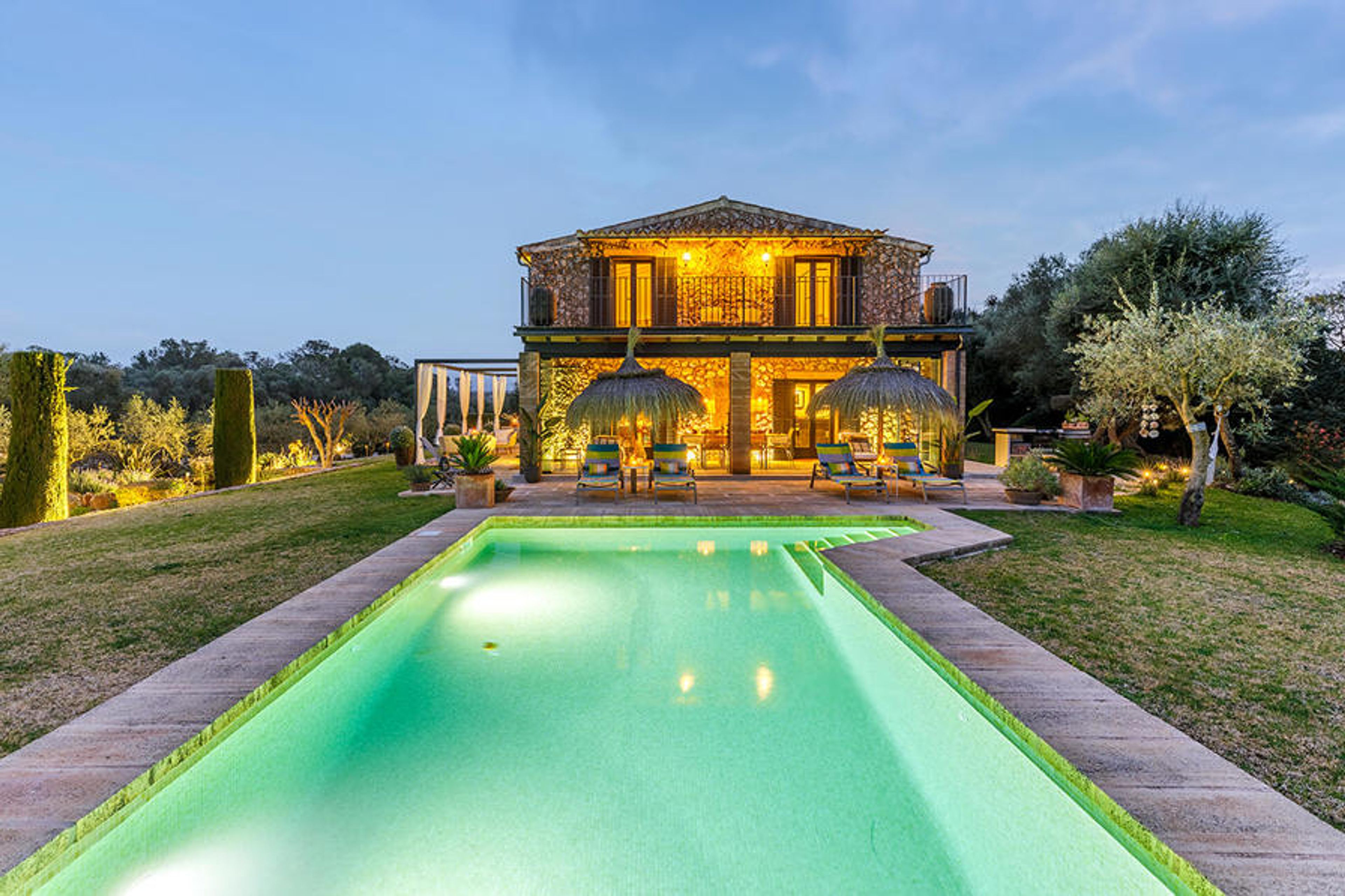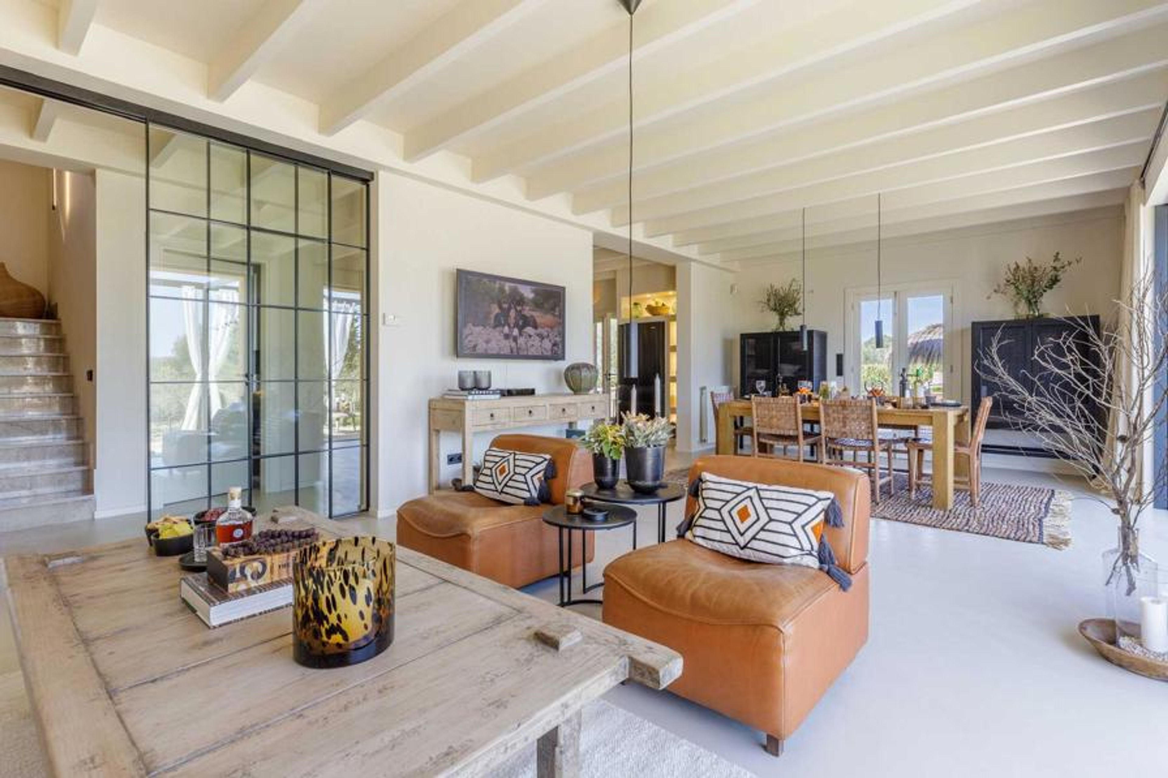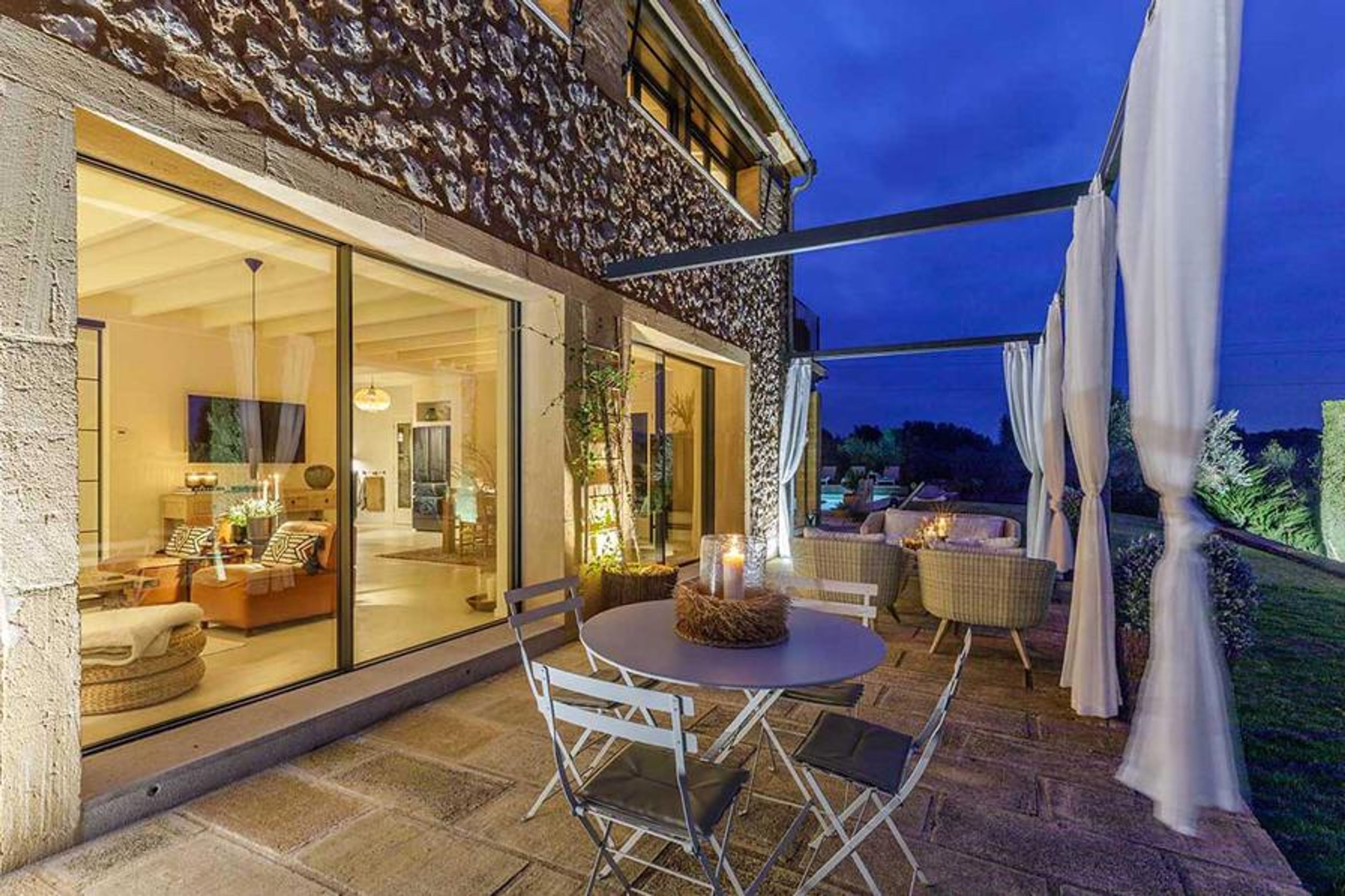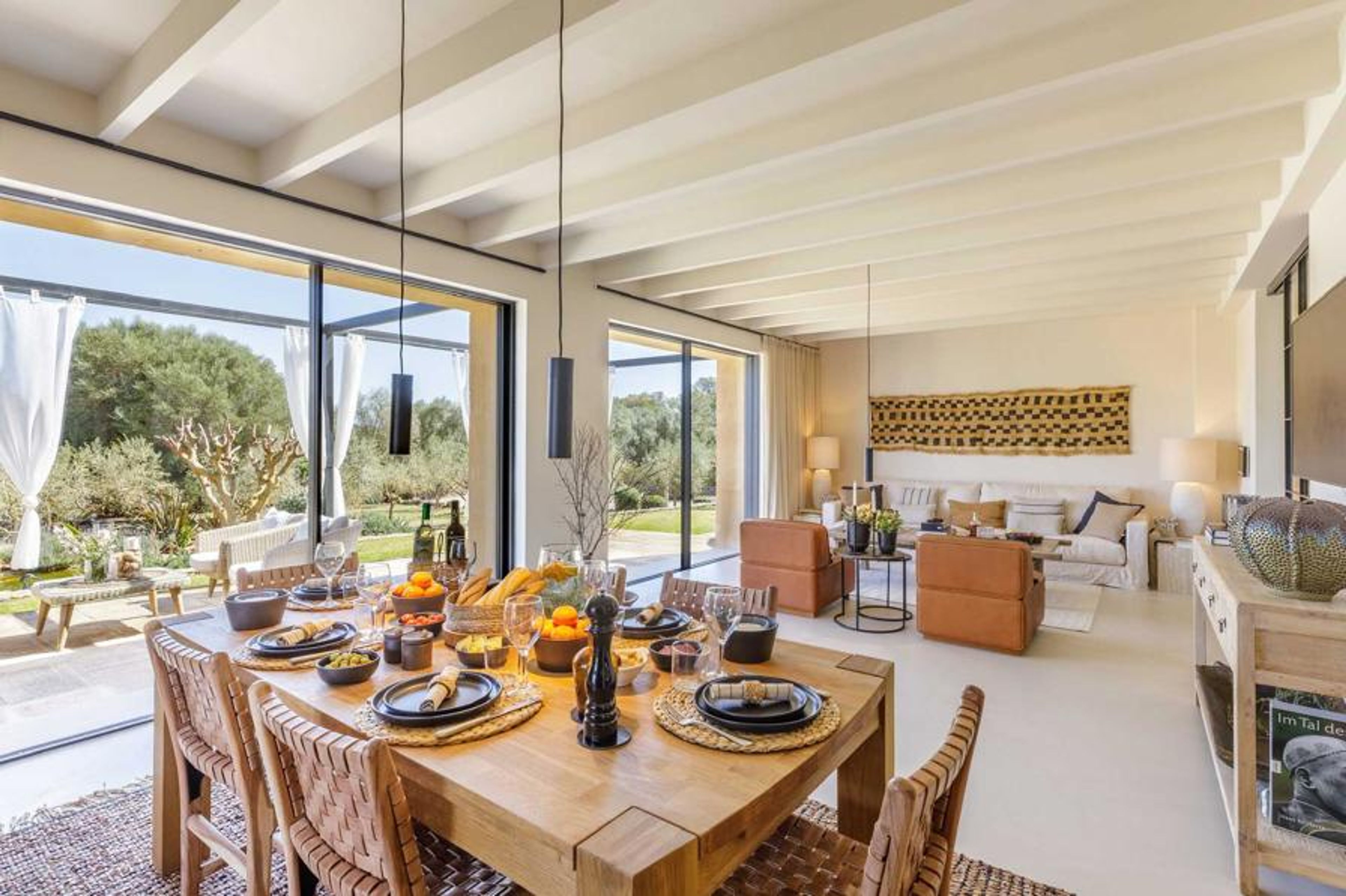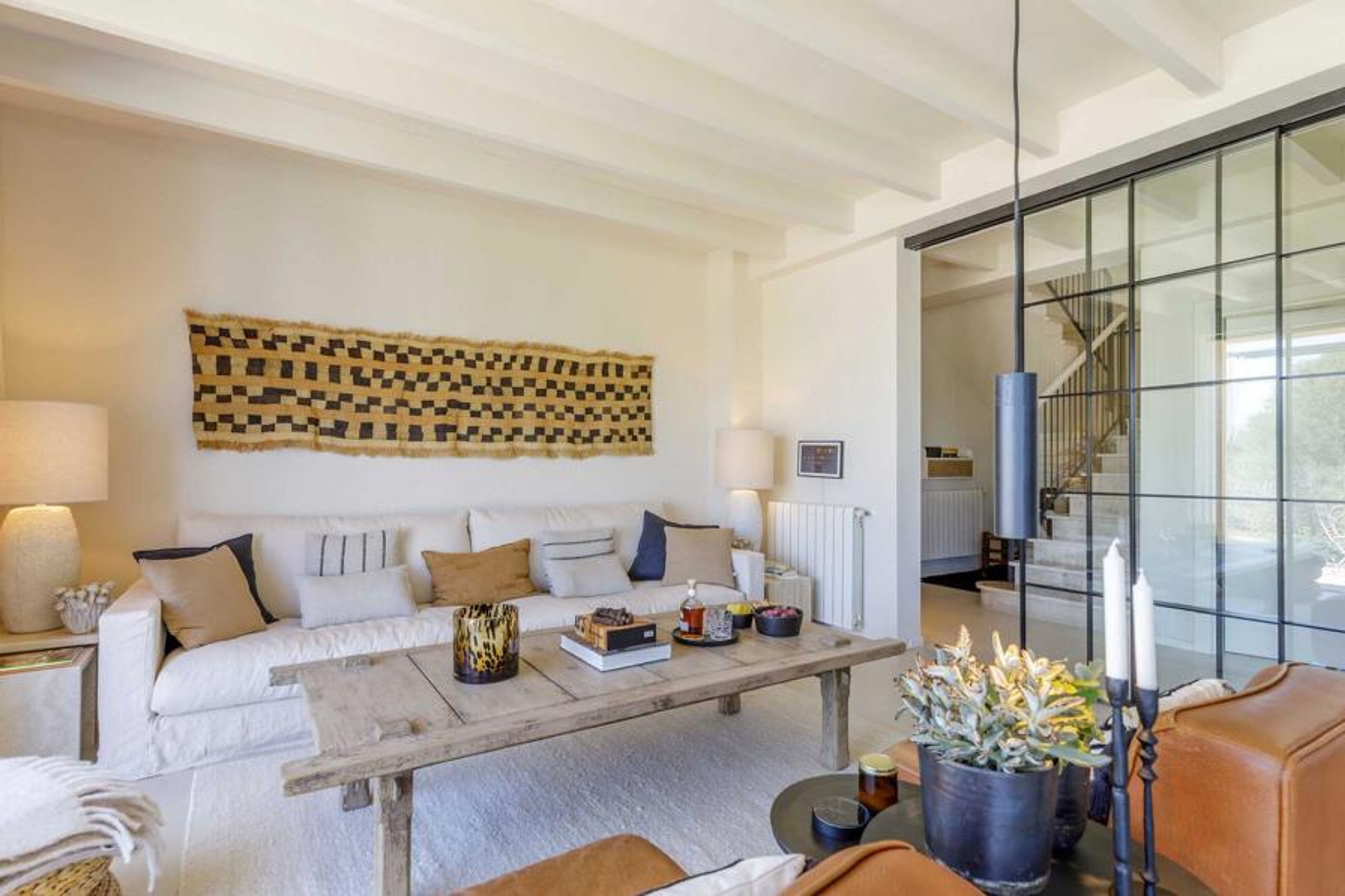 This is a Fincallorca holiday home: A truly exceptional finca awaits you in a fantastic location, surrounded by lush countryside and views of the Mallorcan hinterland between Llubi and Sineu in the centre of Mallorca. Surrounded by 15,000 square metres of land with 274 olive trees, you can enjoy peace and relaxation here and still be at the Playa de Muro beach in 20 minutes by car. The island's capital Palma is also only 30 minutes away by car. Finca Ses Moreres is a natural stone house with a typical local design on the outside and lovingly selected interior furnishings on the inside. The individually designed living spaces with the living room with large sliding doors that connect the garden with the living-dining room, a conservatory that can be opened completely, 4 individually furnished bedrooms and 3 beautiful bathrooms. The wonderful garden surrounding the property is divided into different areas and these magically provide for regeneration and create spaces for both individual retreats and unforgettable times together. The swimming pool is nestled in the garden, directly connected to the house via the terrace.