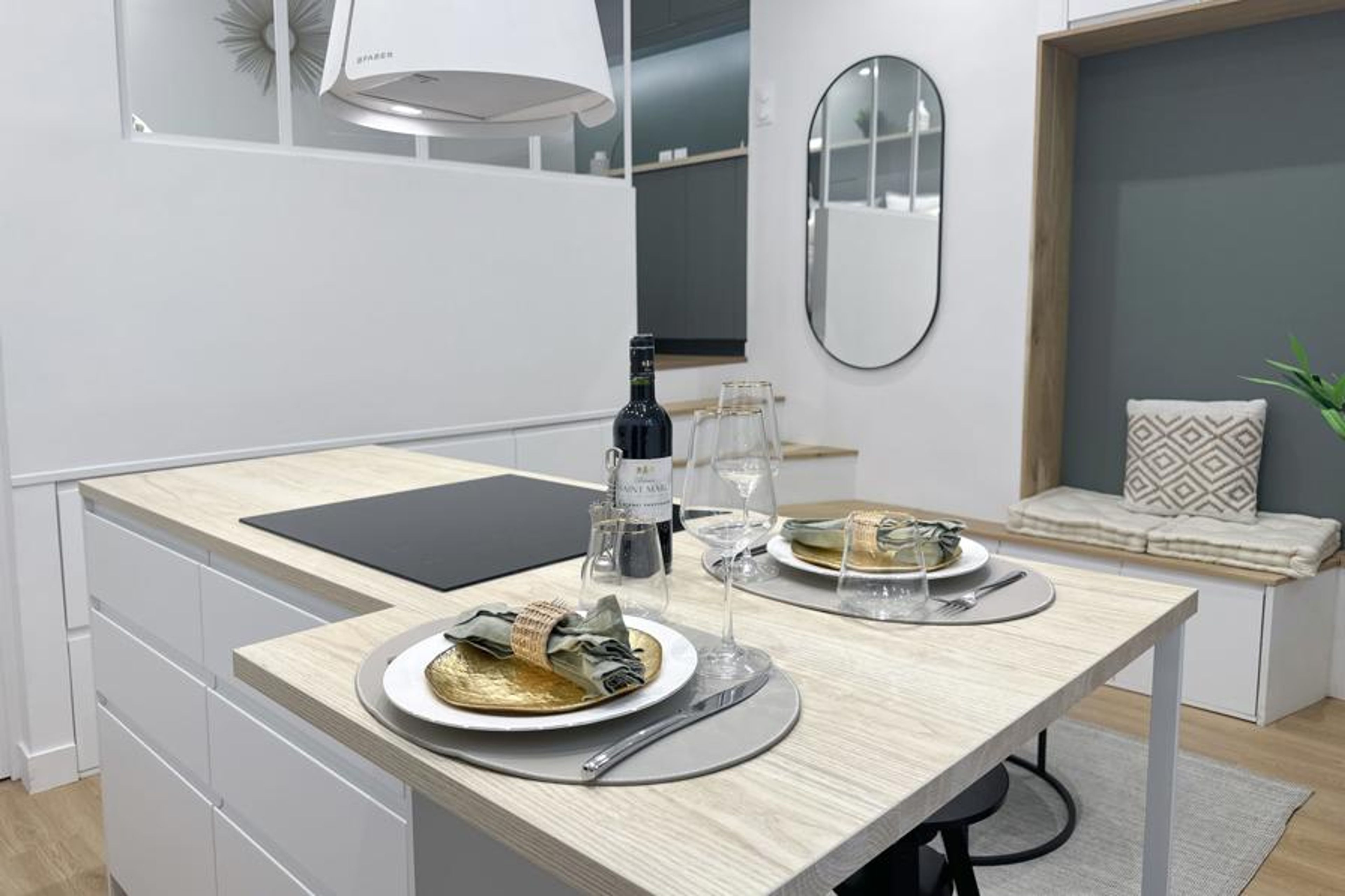 • A fully equipped open kitchen: oven, hotplates, microwave, kettle, Nespresso coffee machine, kitchen utensils, dishwasher, washing machine, pots and pans…