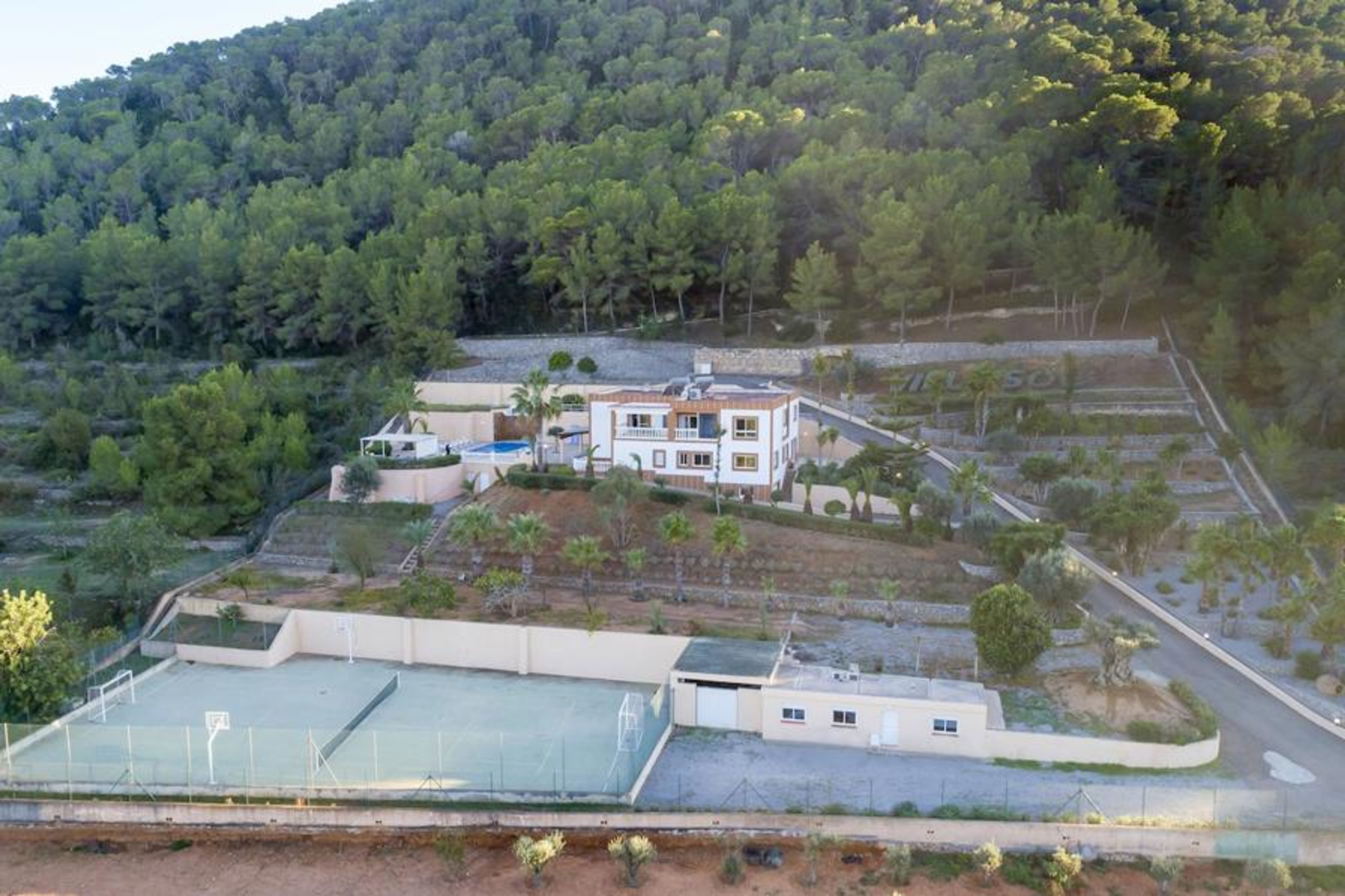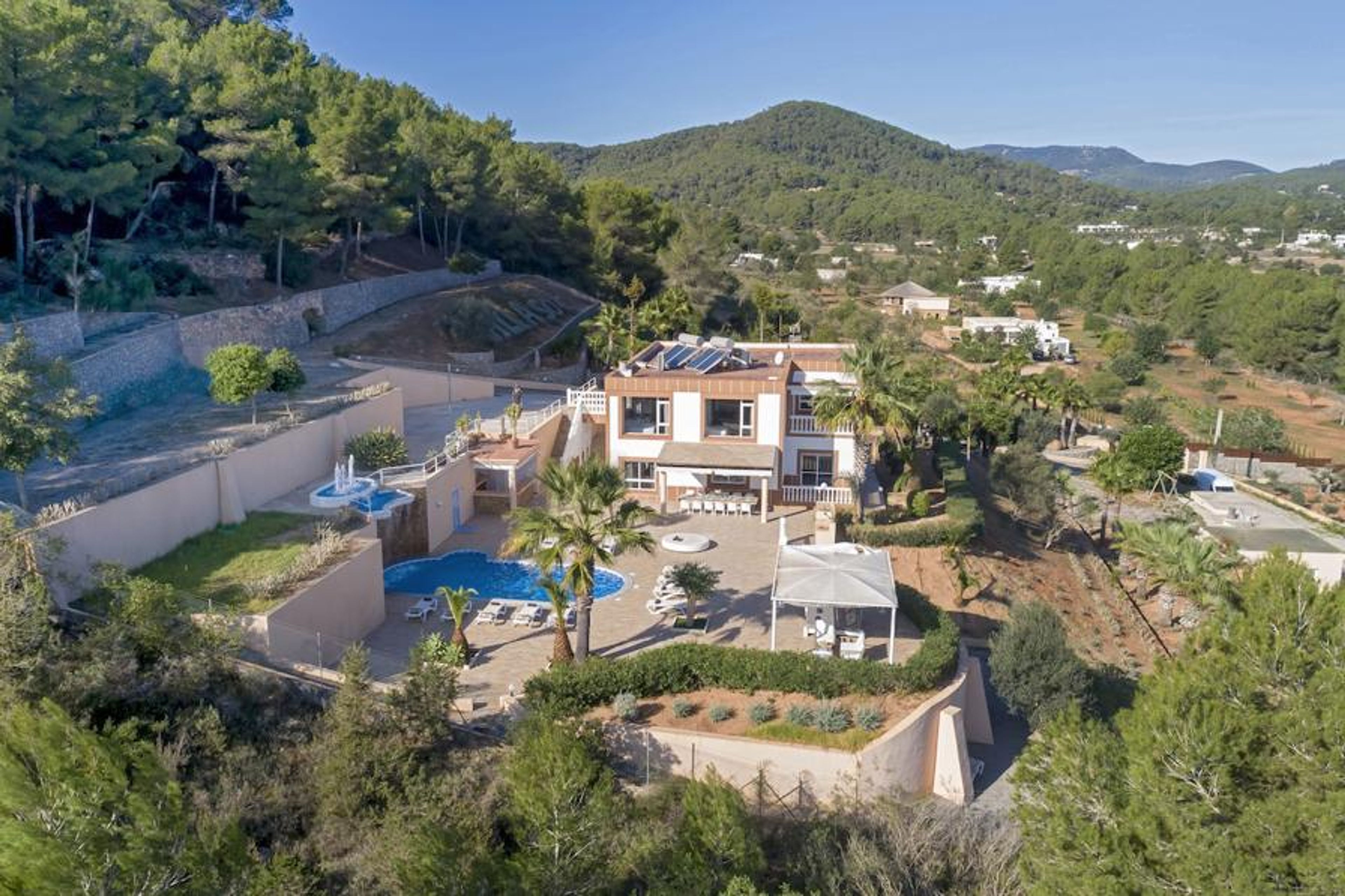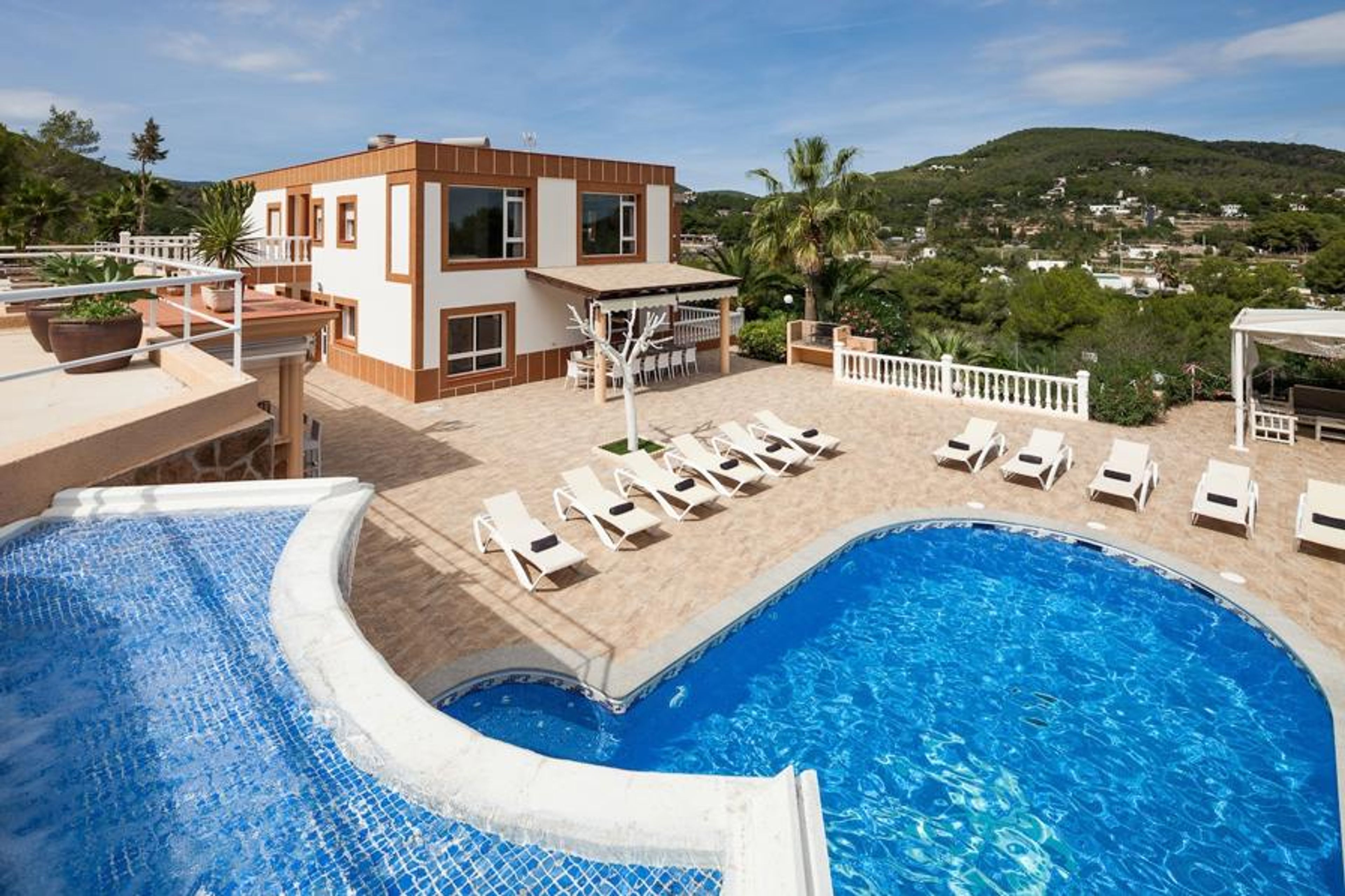 The outside of the villa is particularly impressive, surrounded by well maintained gardens and spectacular views. The swimming pool is surrounded by a wide paved sun deck, complete with sun loungers and chill out beds. The BBQ area can be found by the pool and has a kitchenette nearby. With the outdoor dining table undercover, this is a great place to hang out with families or friends. The swimming pool has an impressive waterfall and Jacuzzi for you to relax in and take in the views of Ibiza Town and the surrounding countryside. There is also a tennis court on the property you are welcome to use.