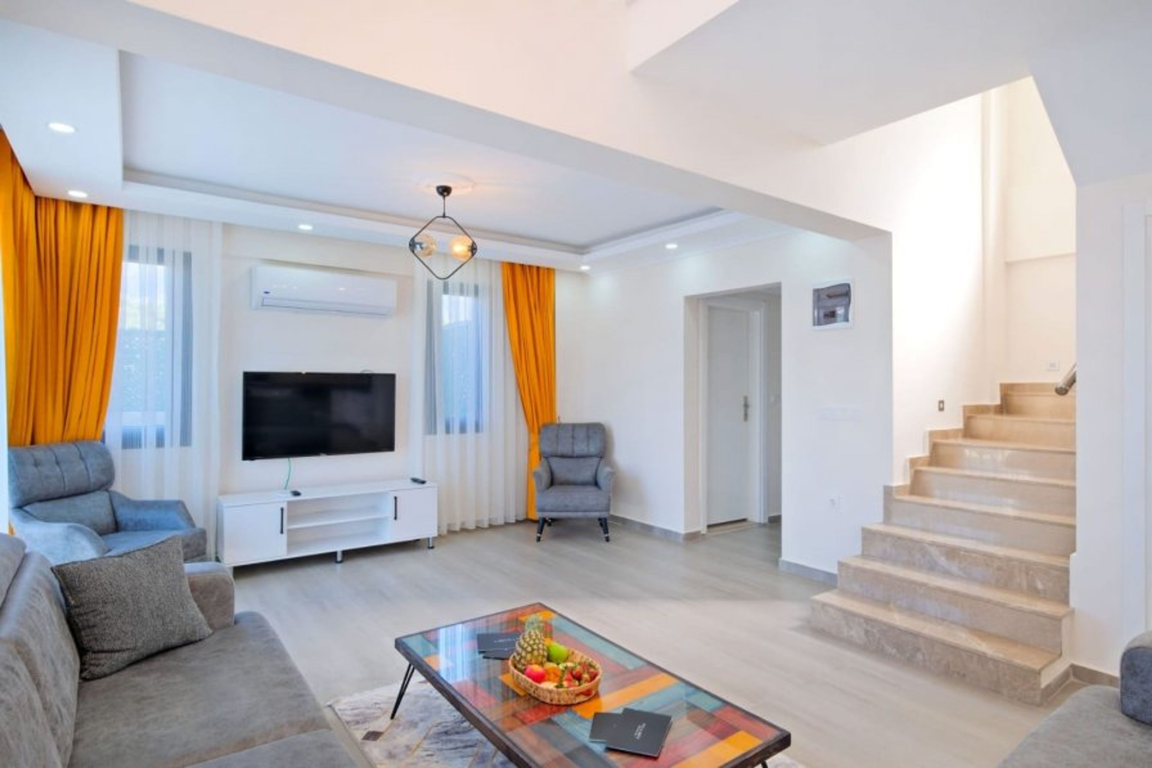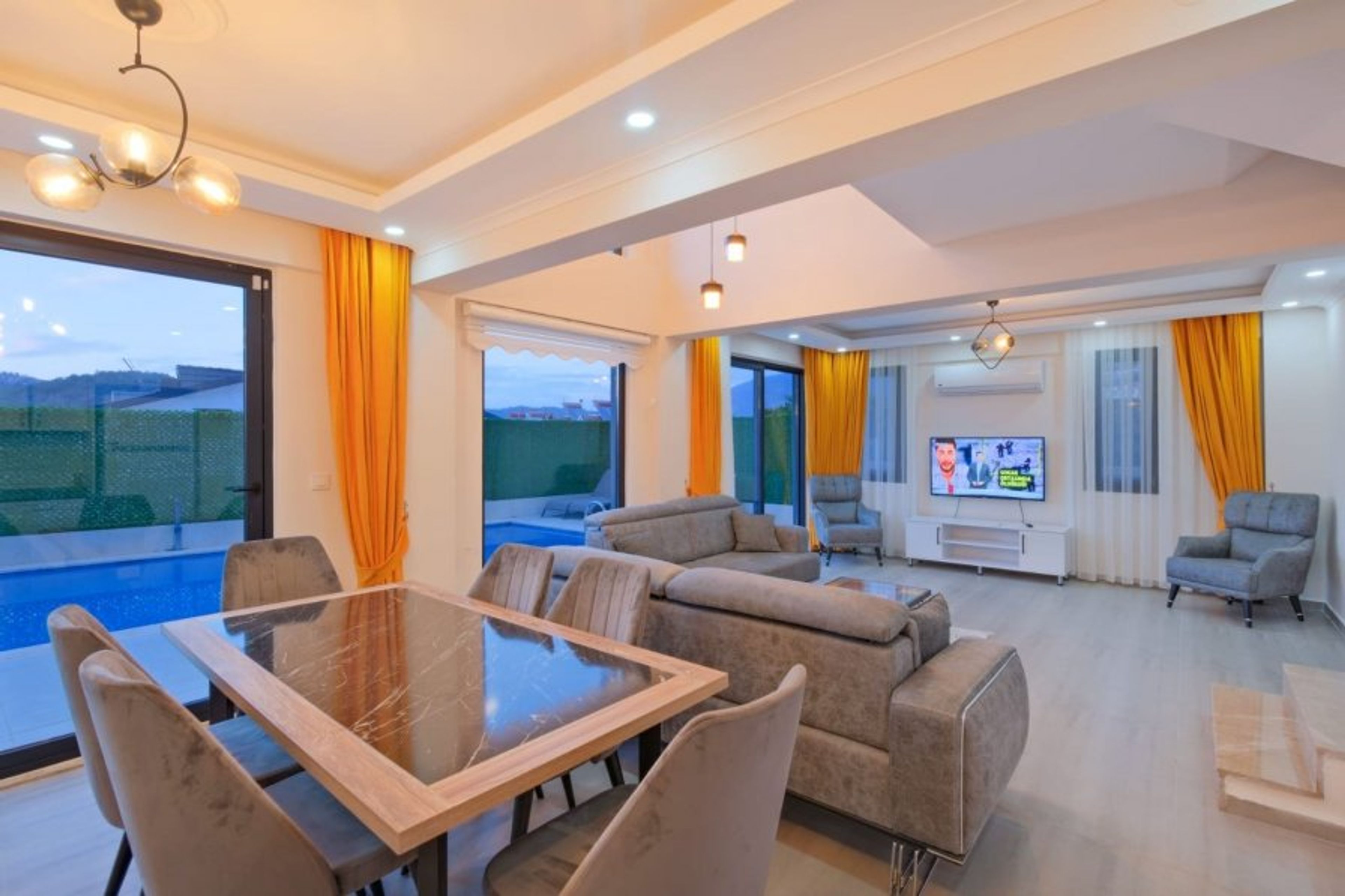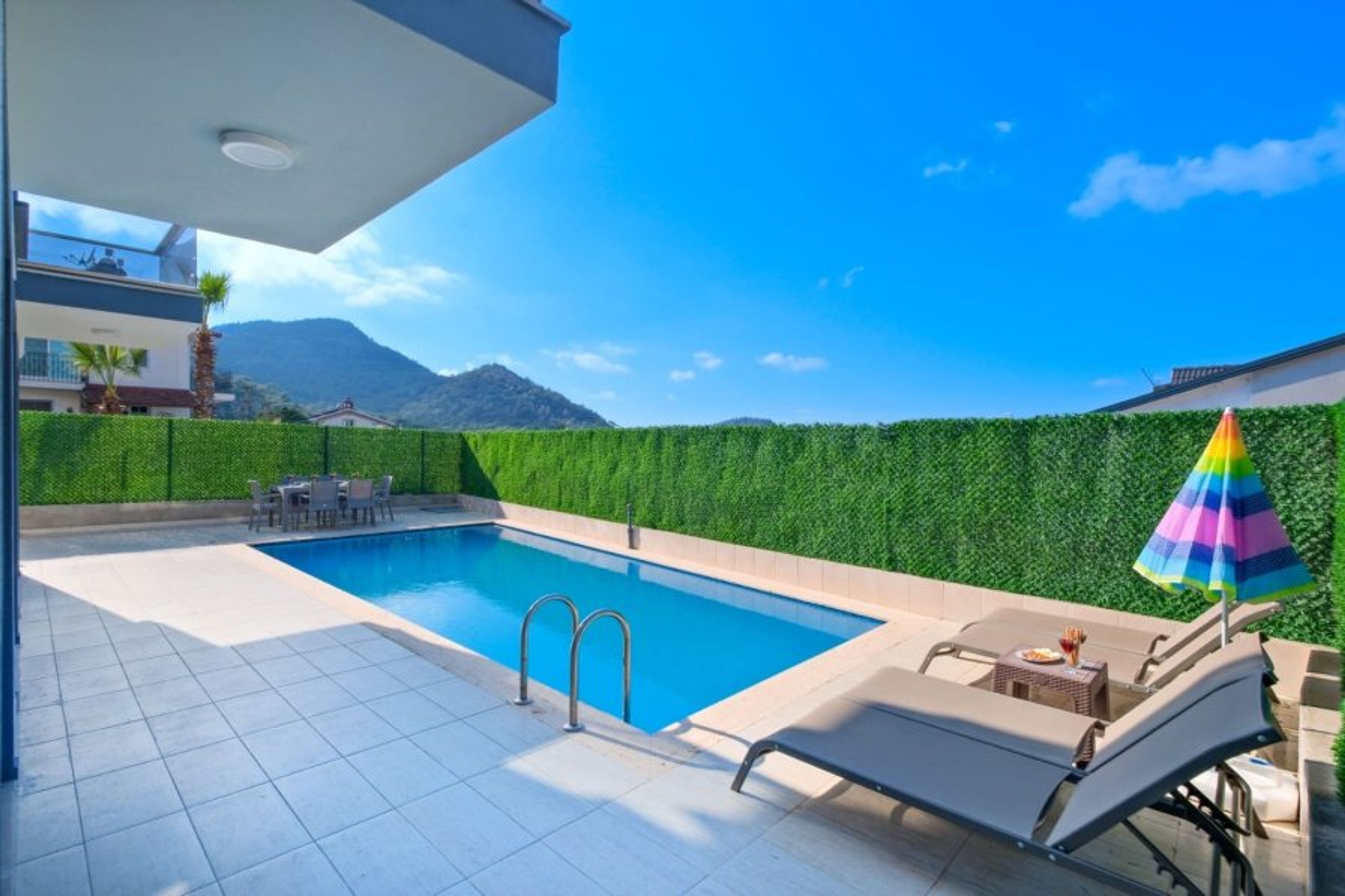 Located in Fethiye - Ölüdeniz Hisarönü region, our villa has an accommodation capacity of 8 people. our villa is walking distance to hisarönü center and ideal for large families. There are 4 bedrooms and 4 bathrooms in our villa. One double bed in the 1st bedroom, WC-bathroom air conditioner, one double bed in the 2nd bedroom, WC-bathroom air conditioner, Two single bed in the 3rd bedroom, WC-bathroom air conditioner, Two single bed in the 4th bedroom, WC-bathroom air conditioner,. In the common area, there is a living room-kitchen, WC, air conditioning and TV. There is direct access to the terrace and pool area from the living room.