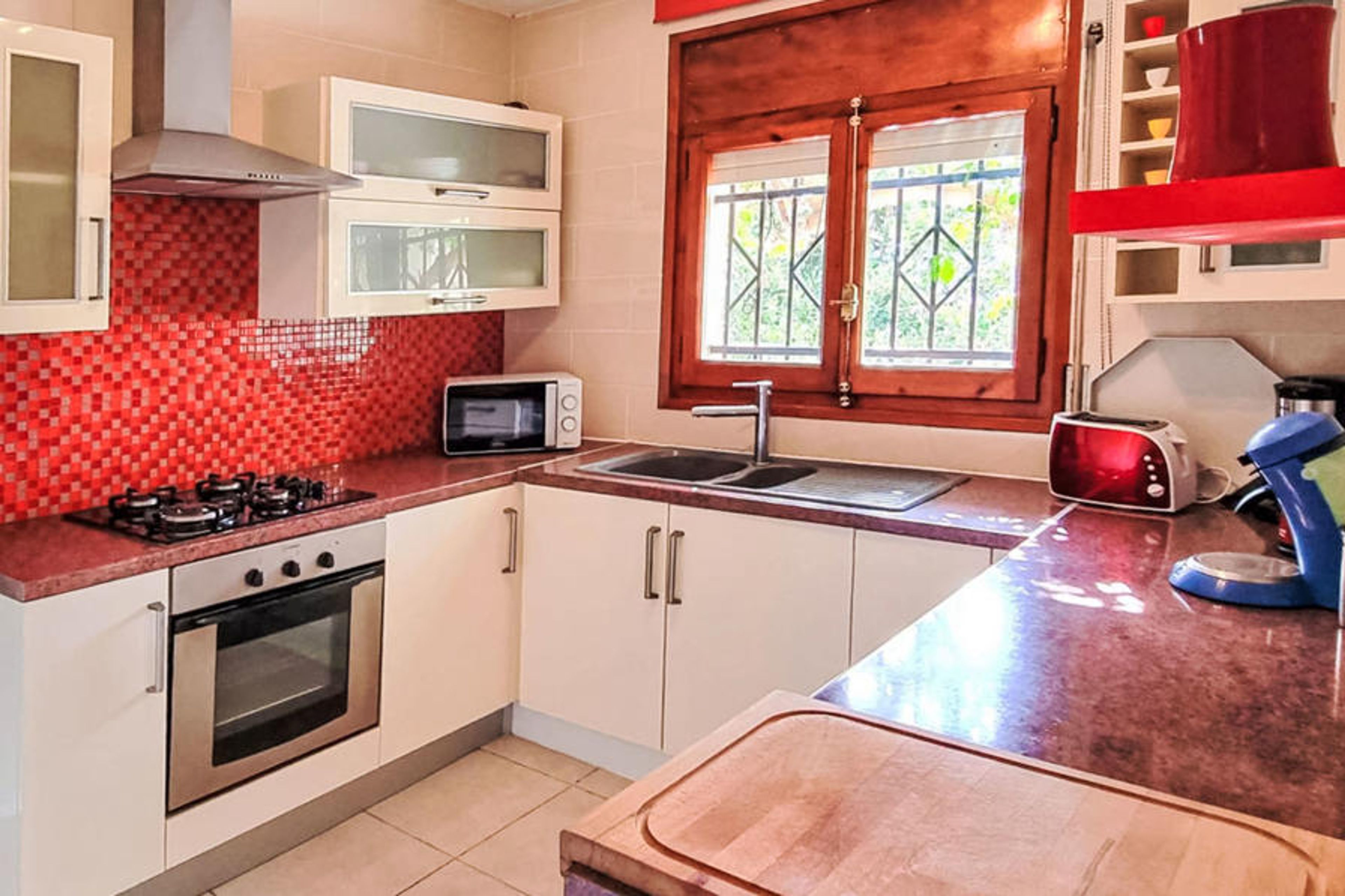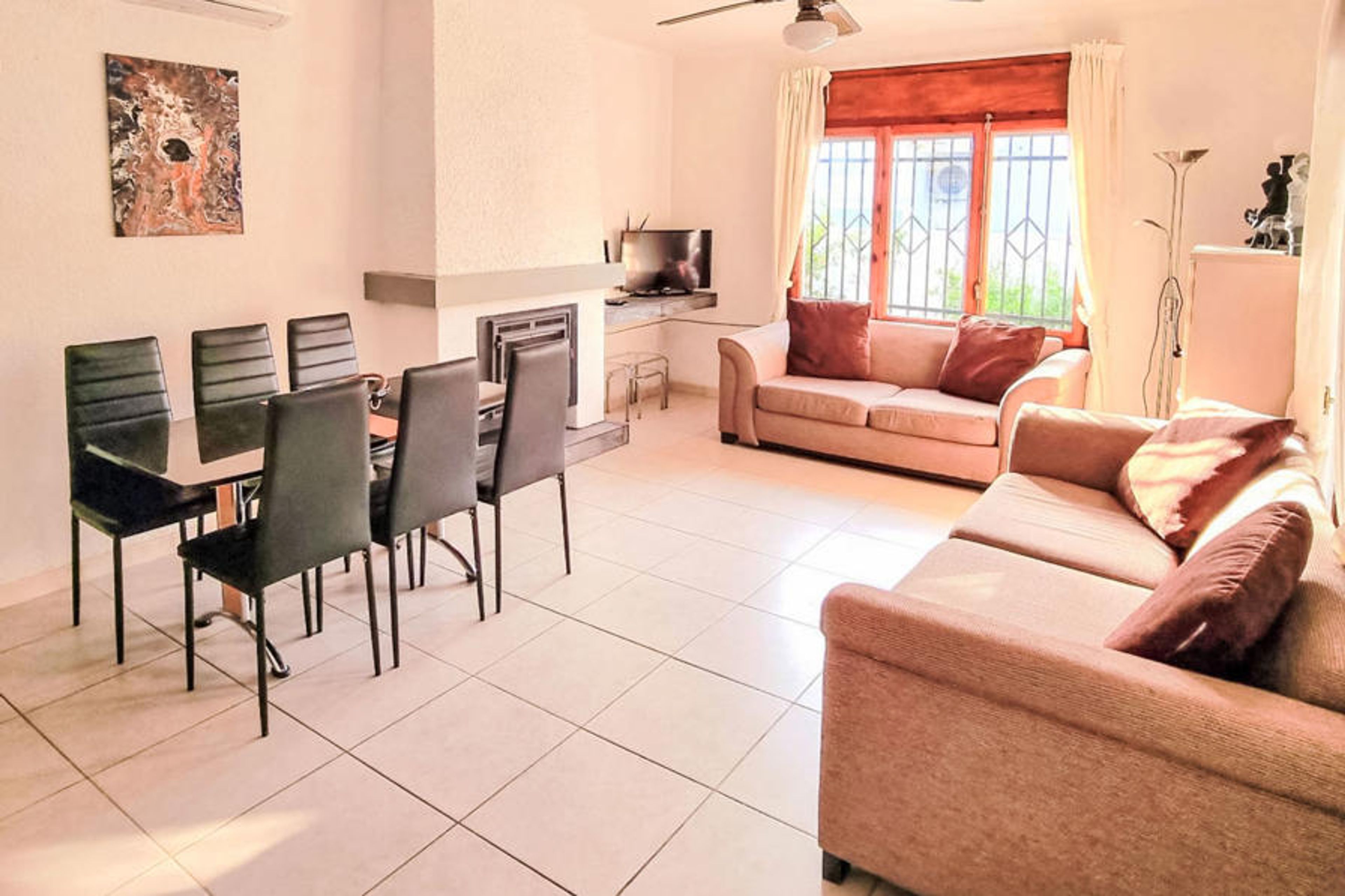 "Villa Sueño II", 4-room villa 120 m2. Practical and comfortable furnishings: living/dining room with dining table, digital TV and air conditioning. 1 room with 1 french bed (160 cm), air conditioning. 1 room with 2 beds (90 cm), fan. 1 room with 2 beds (90 cm), air conditioning. Kitchen (4 hot plates, oven, dishwasher, toaster, kettle, microwave, electric coffee machine). 2 showers/WC. No heating option. Patio. Terrace furniture, barbecue. Facilities: washing machine, iron, hair dryer. Internet (WiFi, free). Parking at the house. HUTTE-003204 // Reg. Nr.: ESFCTU0000430200000631830000000000000000HUTTE-0032042
