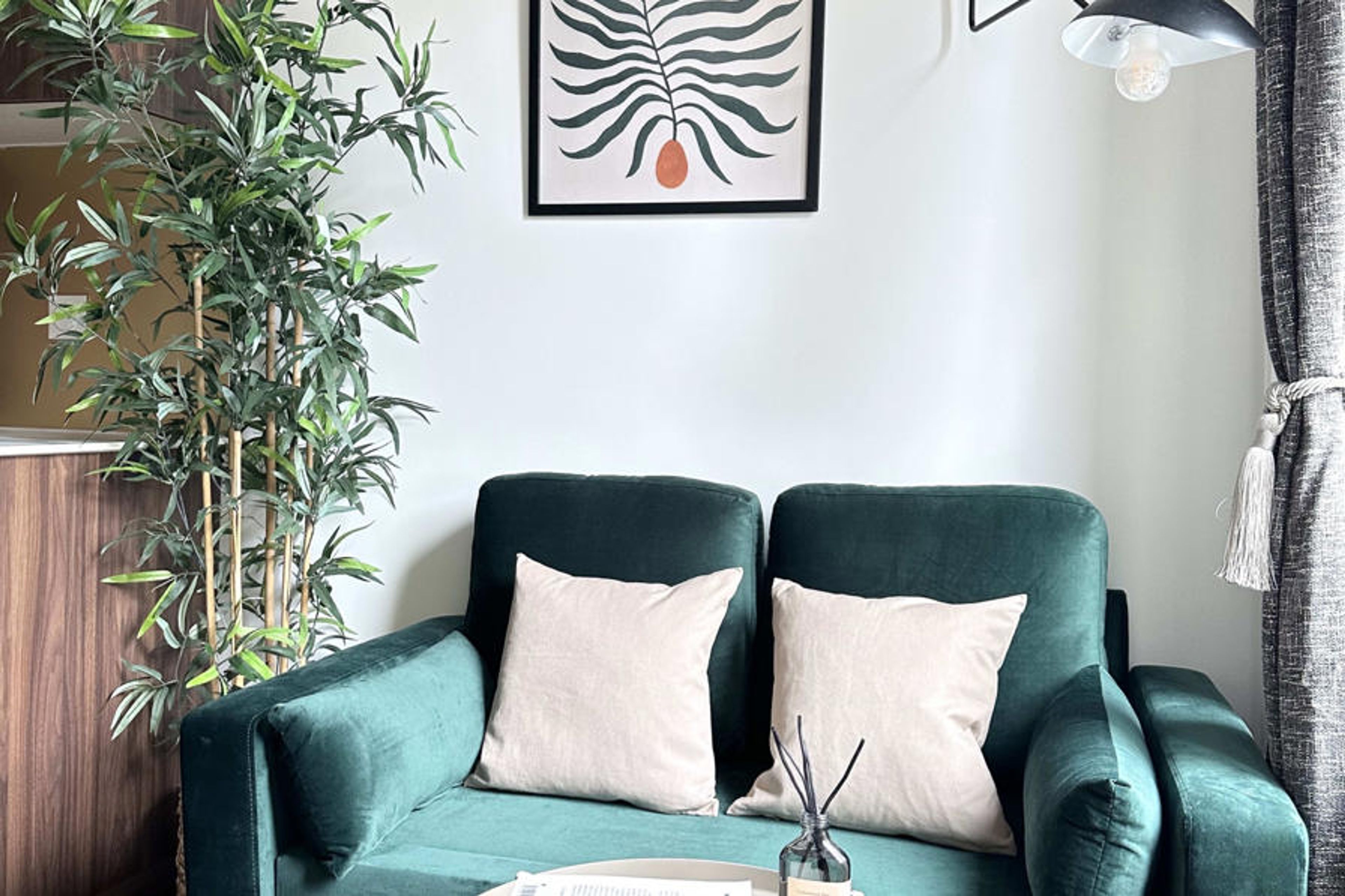 • A living room: Smart television, storage, sofa and unlimited Wi-Fi access.