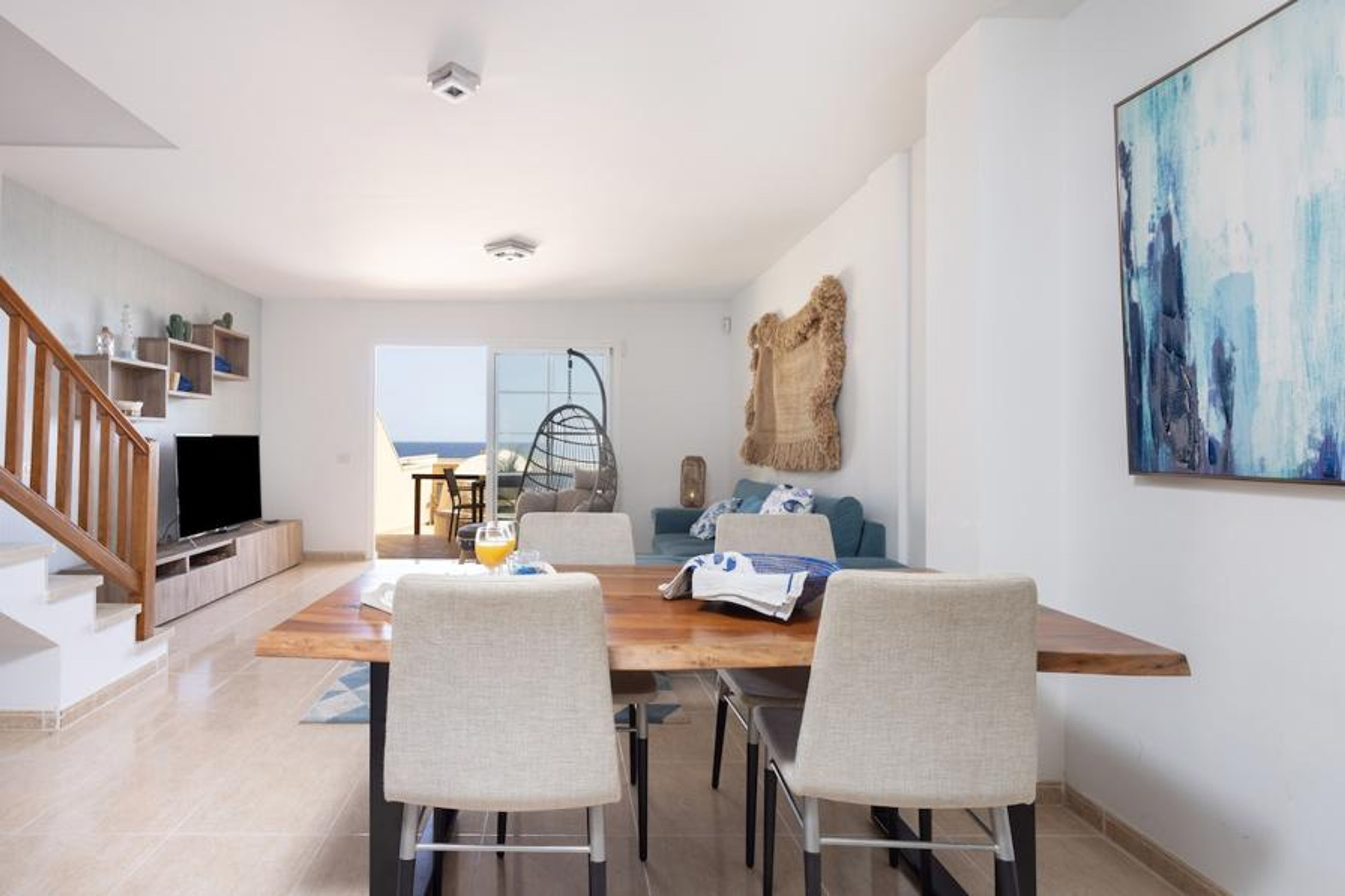 Beautiful designer house with ocean views and communal pool, just a few steps from the beach of La Jaquita in El Médano. With a summery atmosphere all year round and several terraces where you can have lunch, relax and sunbathe while contemplating the sea. With capacity for 7 people, 4 spacious bedrooms, the master bedroom with king size bed, en-suite bathroom and access to a pleasant terrace. It is ideal for families, couples and business trips, as it has 1GB Fibre Wifi and Smart TV.