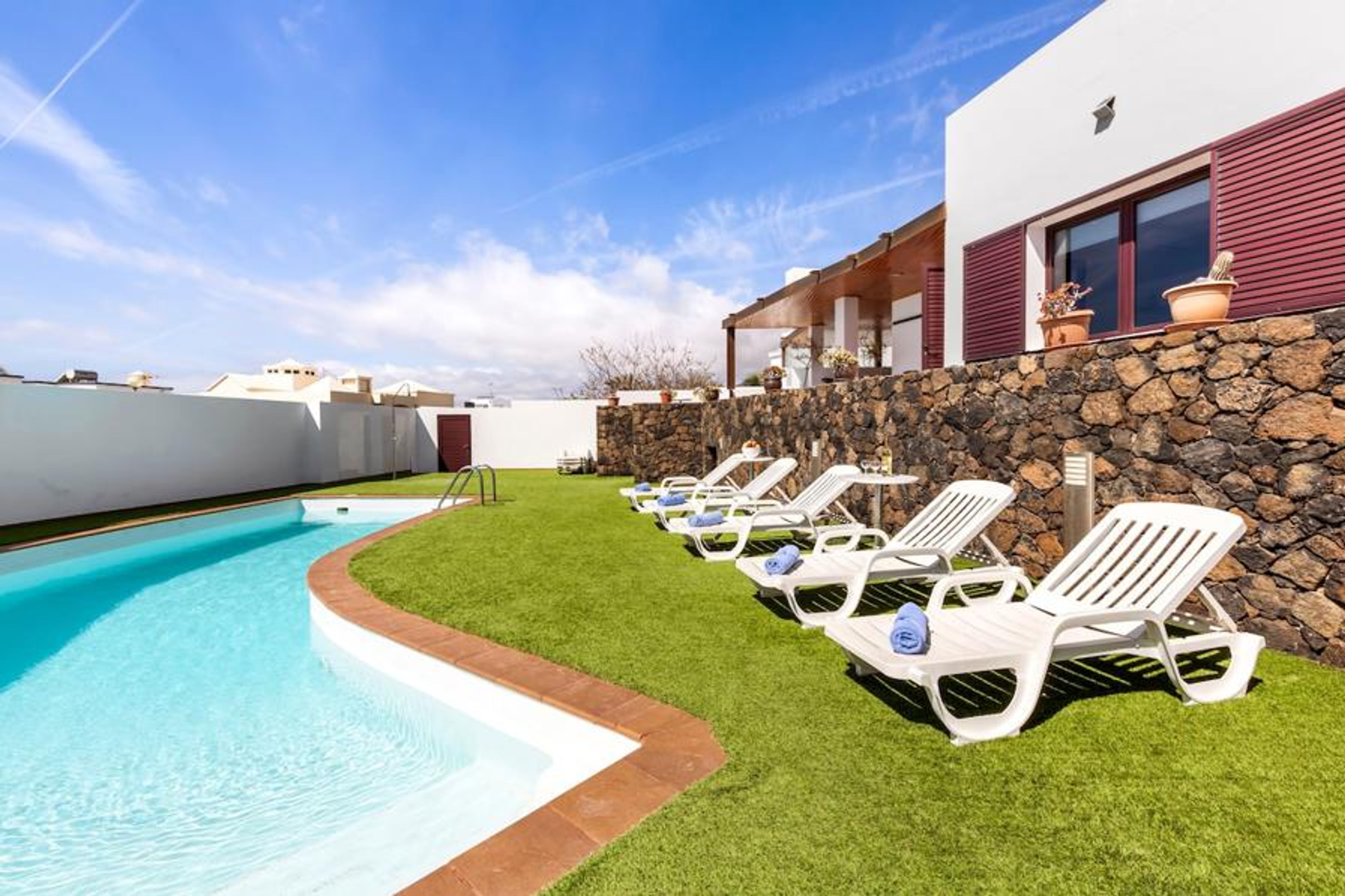 Beautiful villa with private pool just a few steps from the beach in Playa Honda, Lanzarote, where you can breathe a summer atmosphere all year round. With large open spaces for family lunches or sunbathing, swimming pool, barbecue area and exquisite decoration with attention to detail, where there is harmony between the beauty and comfort offered by the house. It has 6 bedrooms, 4 bathrooms, capacity for 12 people, Fibre Wifi and a privileged location in Lanzarote.