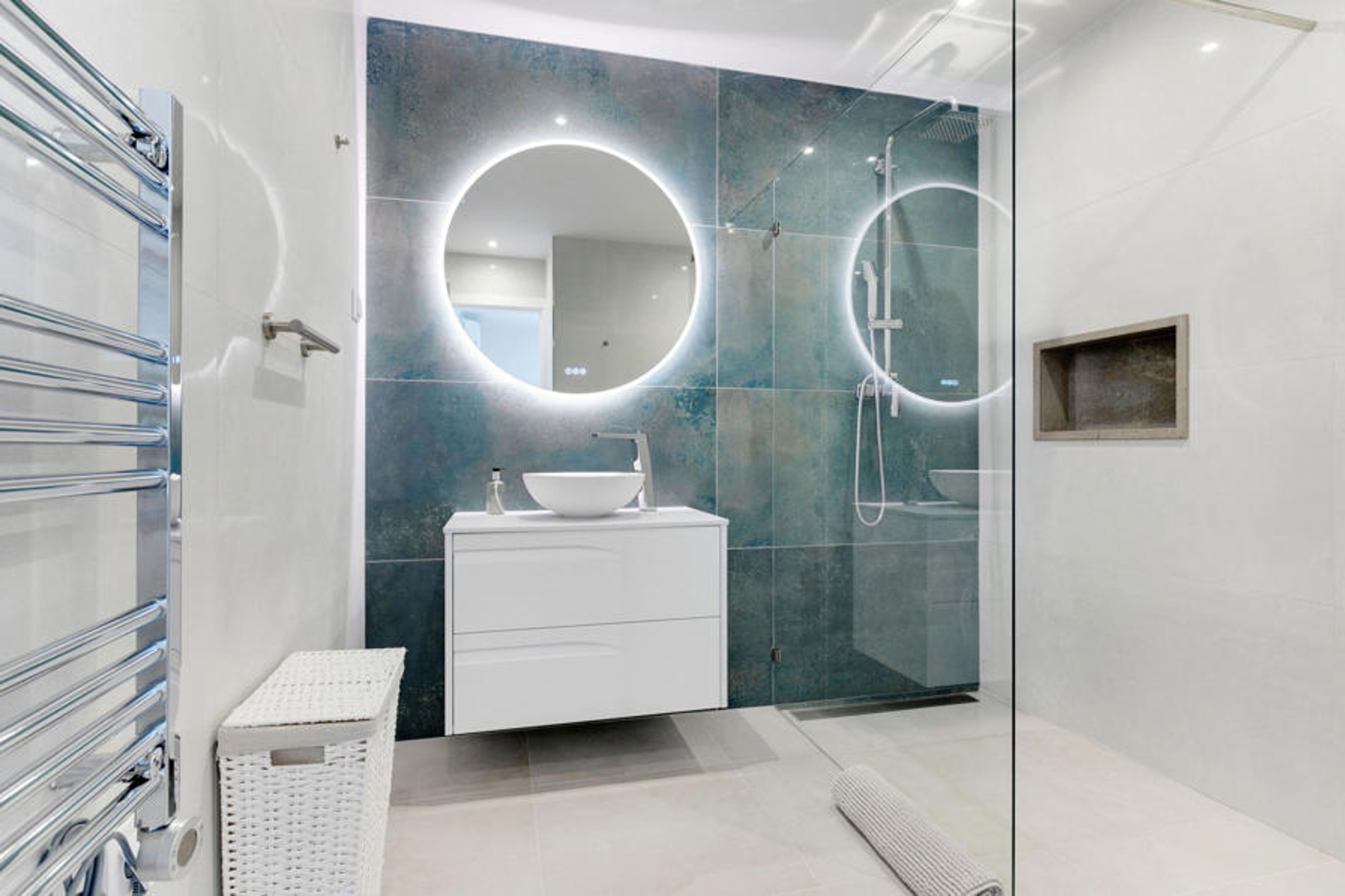 Step outside onto the terrace, where you can enjoy al fresco dining at the exterior table, relax in comfortable chairs, and savour the flavours of a BBQ. The terrace offers breathtaking views across the valley and even a distant glimpse of the sea. A glass wall allows you to immerse yourself in these stunning views from the comfort of the indoors.