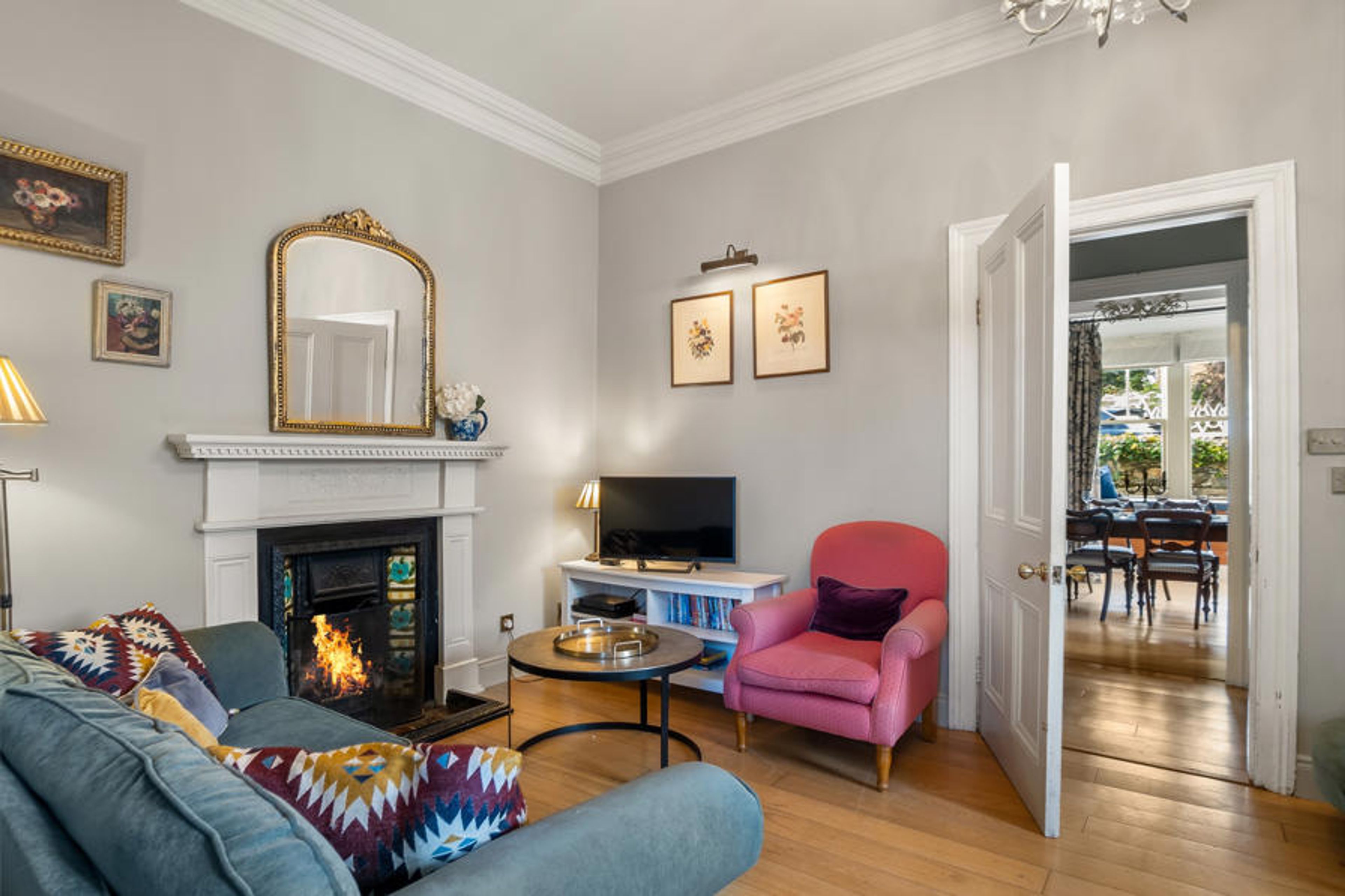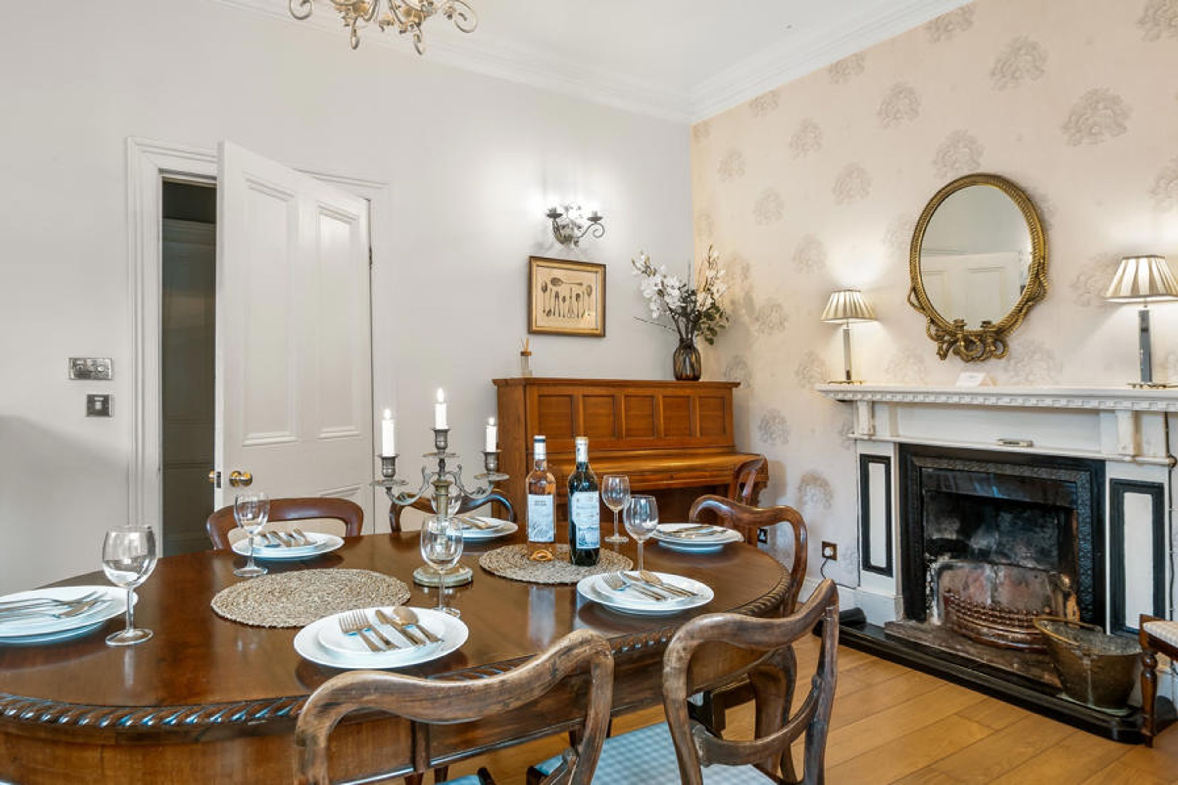 To the right of the hallway is an elegant dining room with an ornate fireplace and large windows overlooking the front and side of the property. Dining table seating 8 -the perfect room for entertaining.