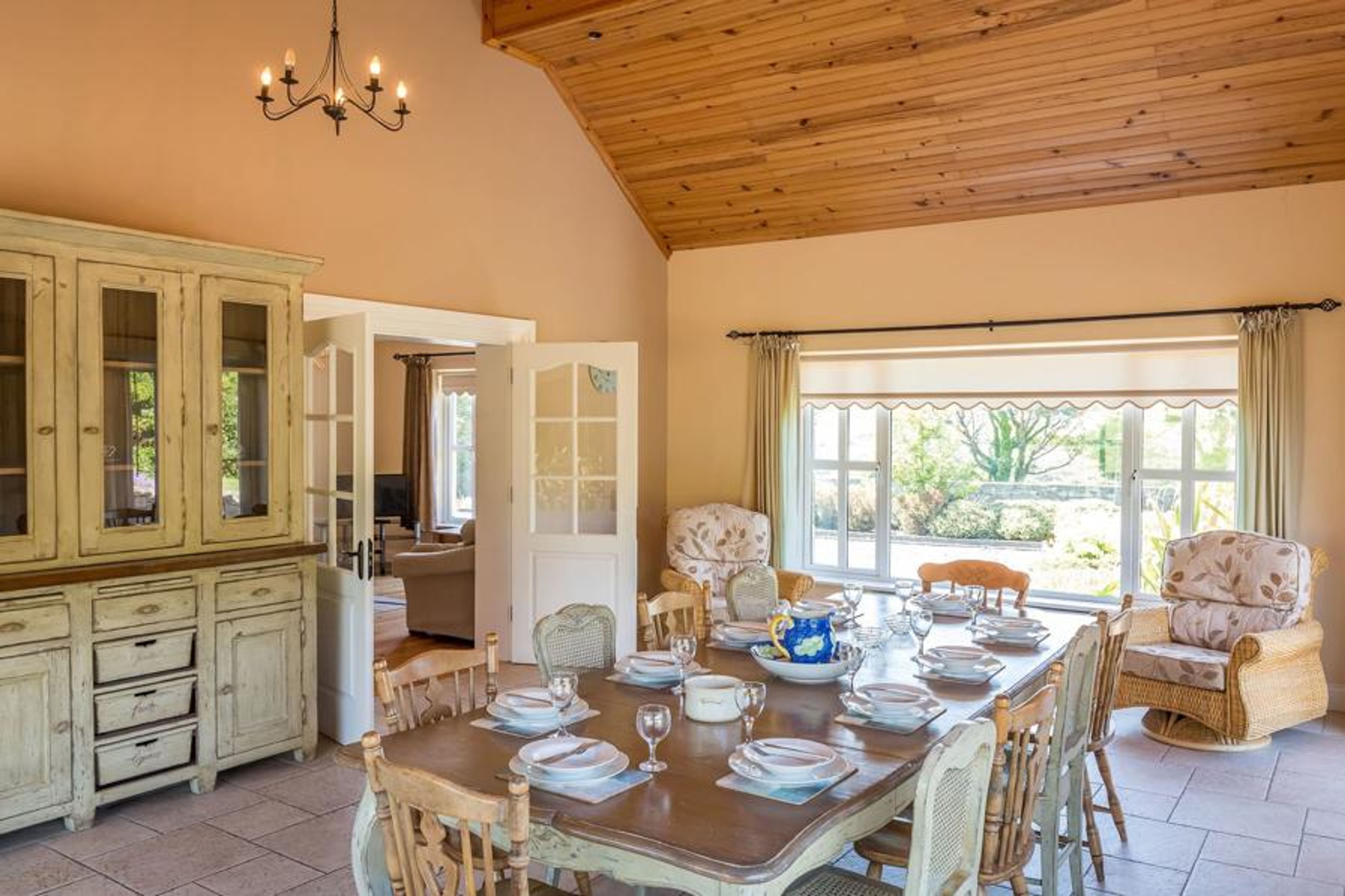 Step through the welcoming stone entryway into a large, tiled hall that sets a warm and inviting tone for your stay. The main reception room invites you to relax on comfy couches in front of the cozy stove fire. Double doors open into an expansive, light-filled dining room with seating for eight, perfect for sharing memorable meals together.
