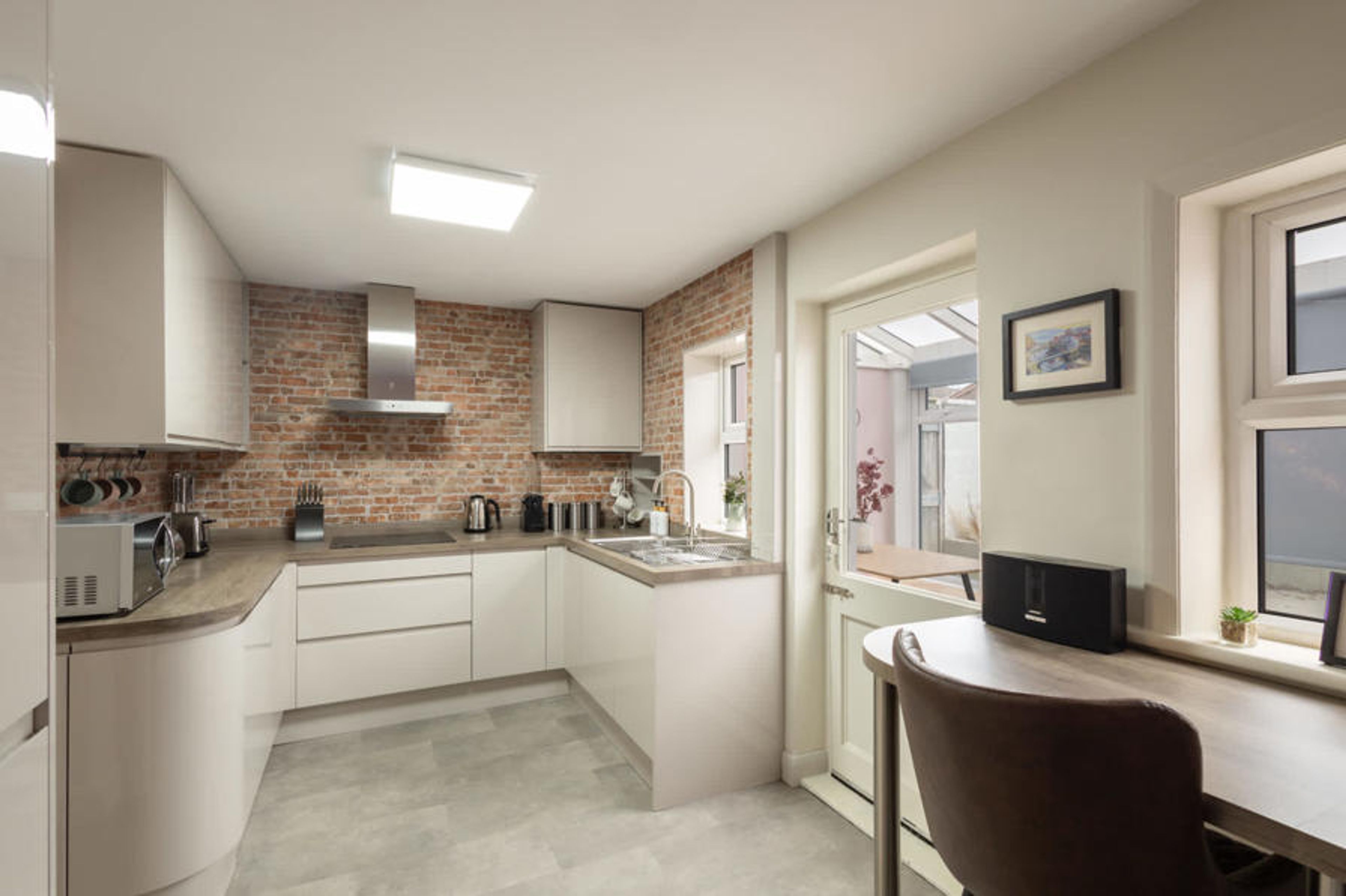 The fully equipped kitchen boasts sleek appliances and ample counter space, making it a pleasure to prepare meals. The dining areas include a breakfast bar in the kitchen as well as a dining table in the conservatory next-door inviting guests to gather for memorable meals.