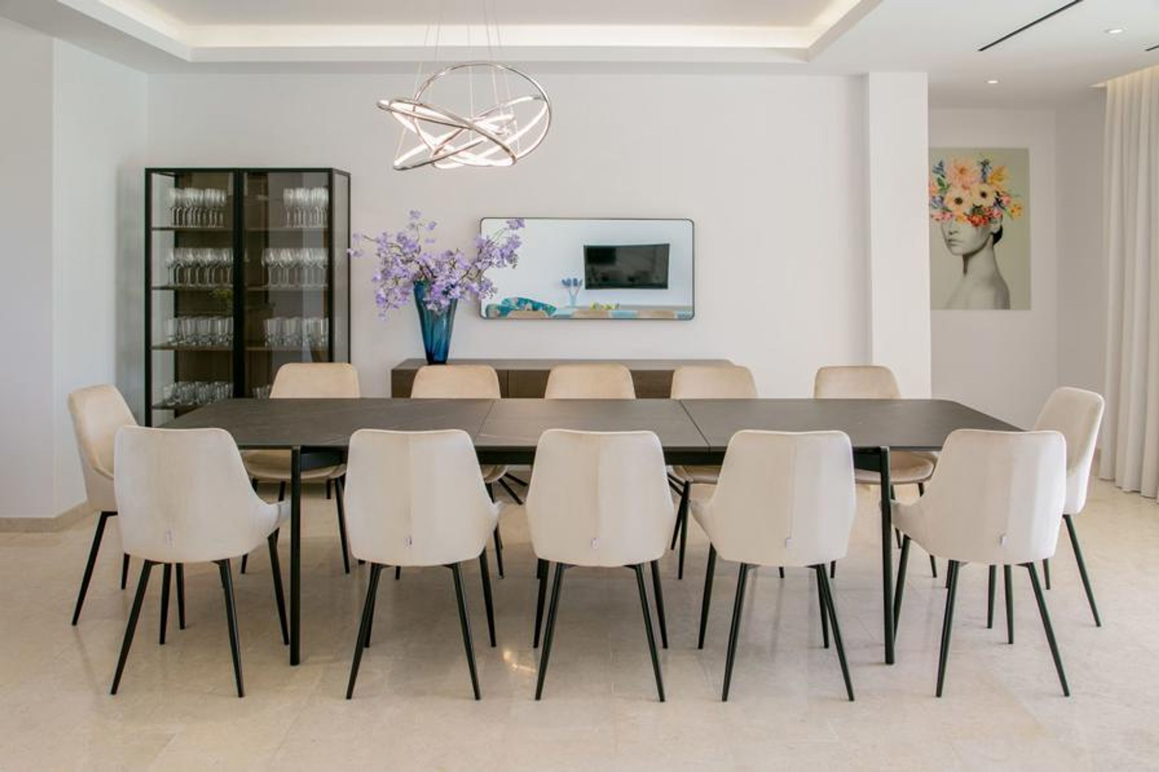 - Open-plan living and dining area with sofa, 75-inch Smart TV, dining table and doors opening to dining terrace