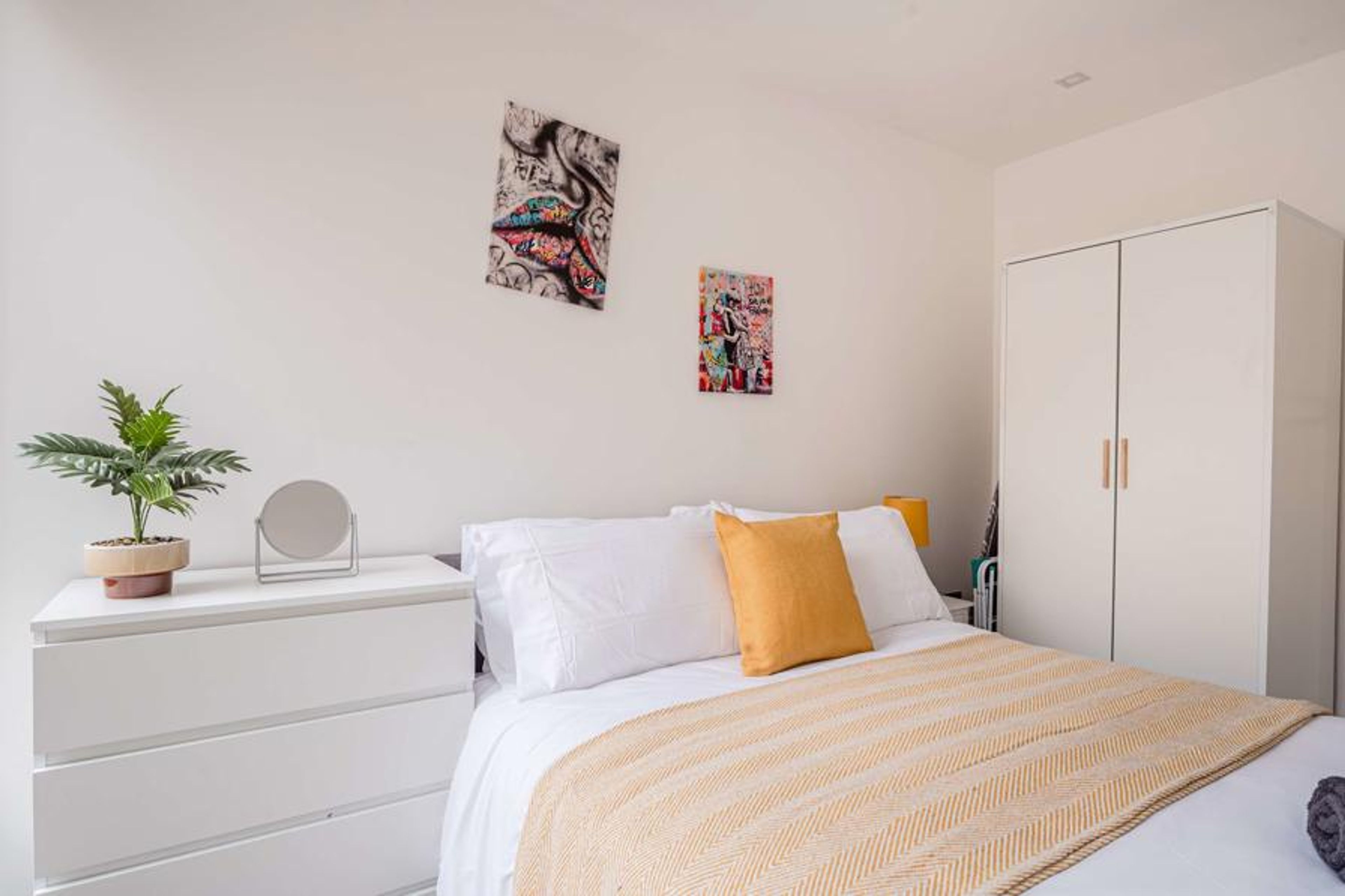 The property has two double bedrooms, each thoughtfully furnished with a bedside table, wardrobe, and chest of drawers for ample storage. The spacious and modern bathroom offers a toilet, wash basin, and a large bath with a shower, providing a relaxing space to unwind. This home is designed with comfort and functionality in mind, making it a perfect base for your stay.