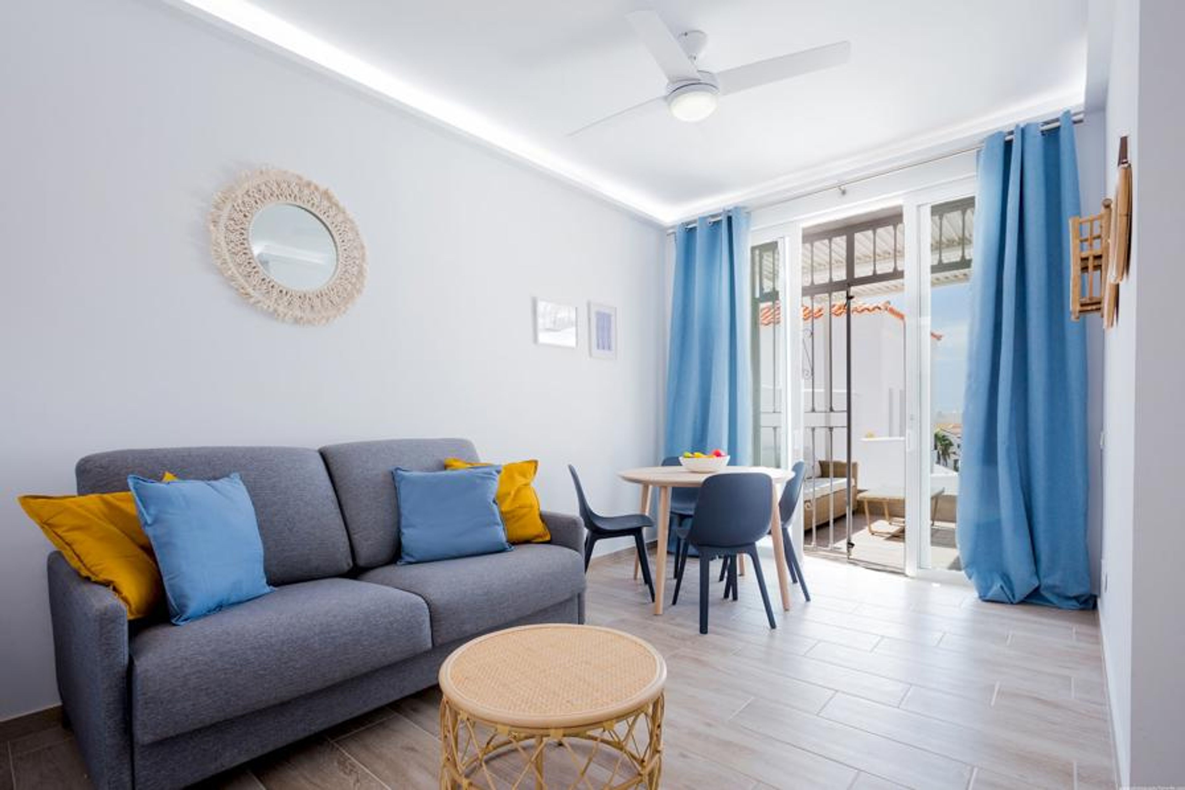 This beautifully renovated and modern bungalow sleeps up to 4 people and has two bedrooms, both with ceiling fans. The master bedroom has a double bed, fitted wardrobe and access to a small terrace with side sea and mountain views. The second bedroom also has a double bed. In addition, the cosy living-dining room has a Smart TV. From this room you can access the second terrace of the flat, where you can enjoy sea views and spectacular sunsets, while relaxing in the chill-out area with sun loungers, the perfect place to sunbathe and unwind.