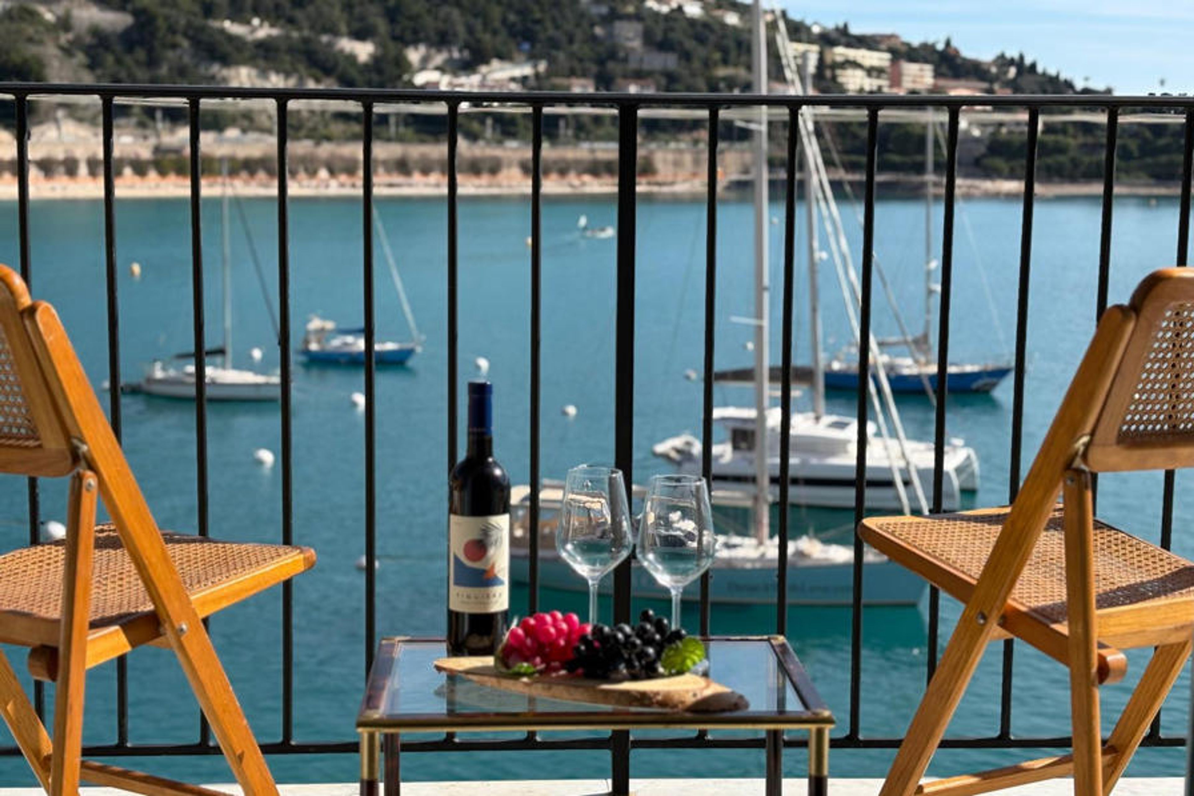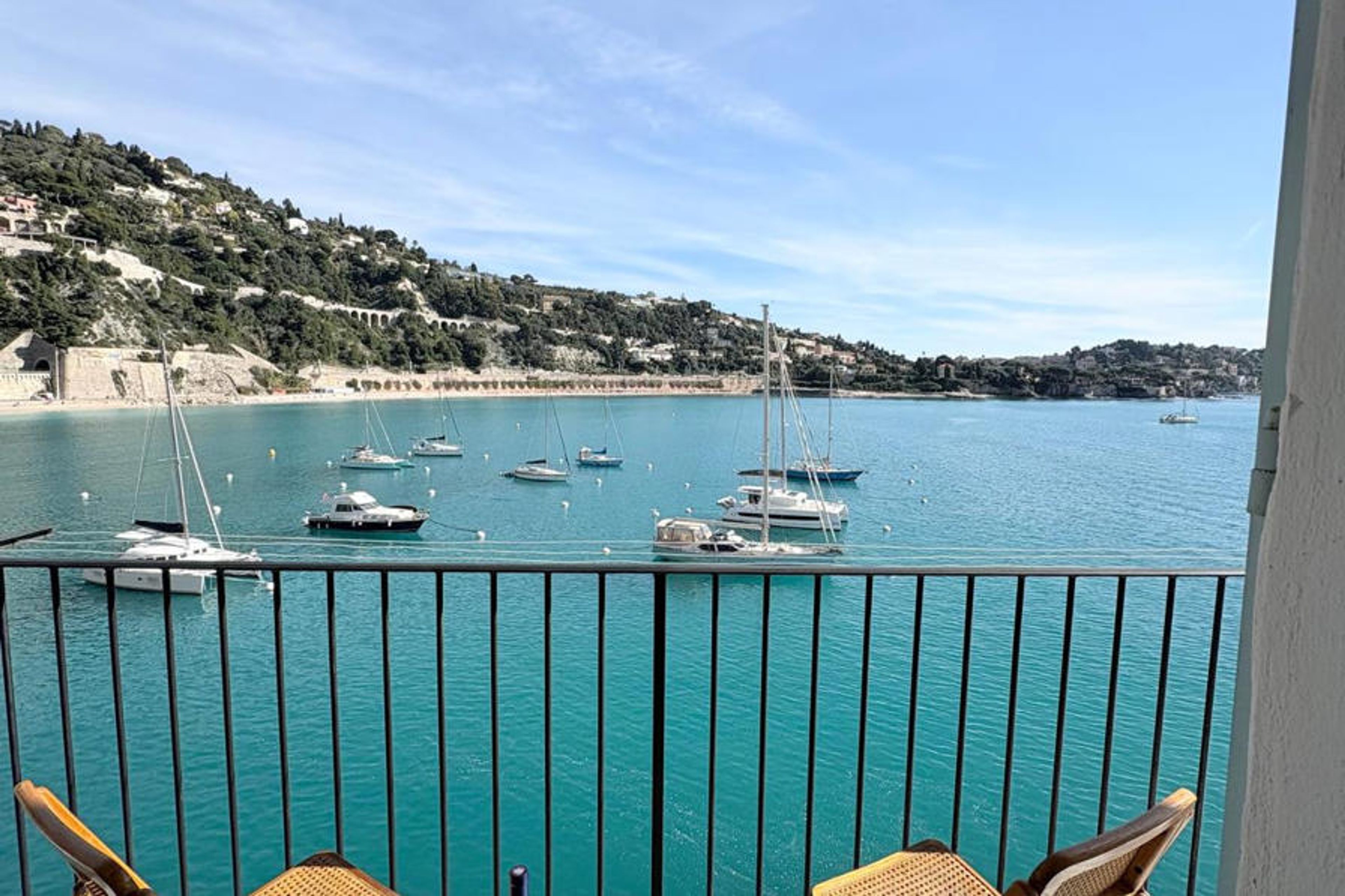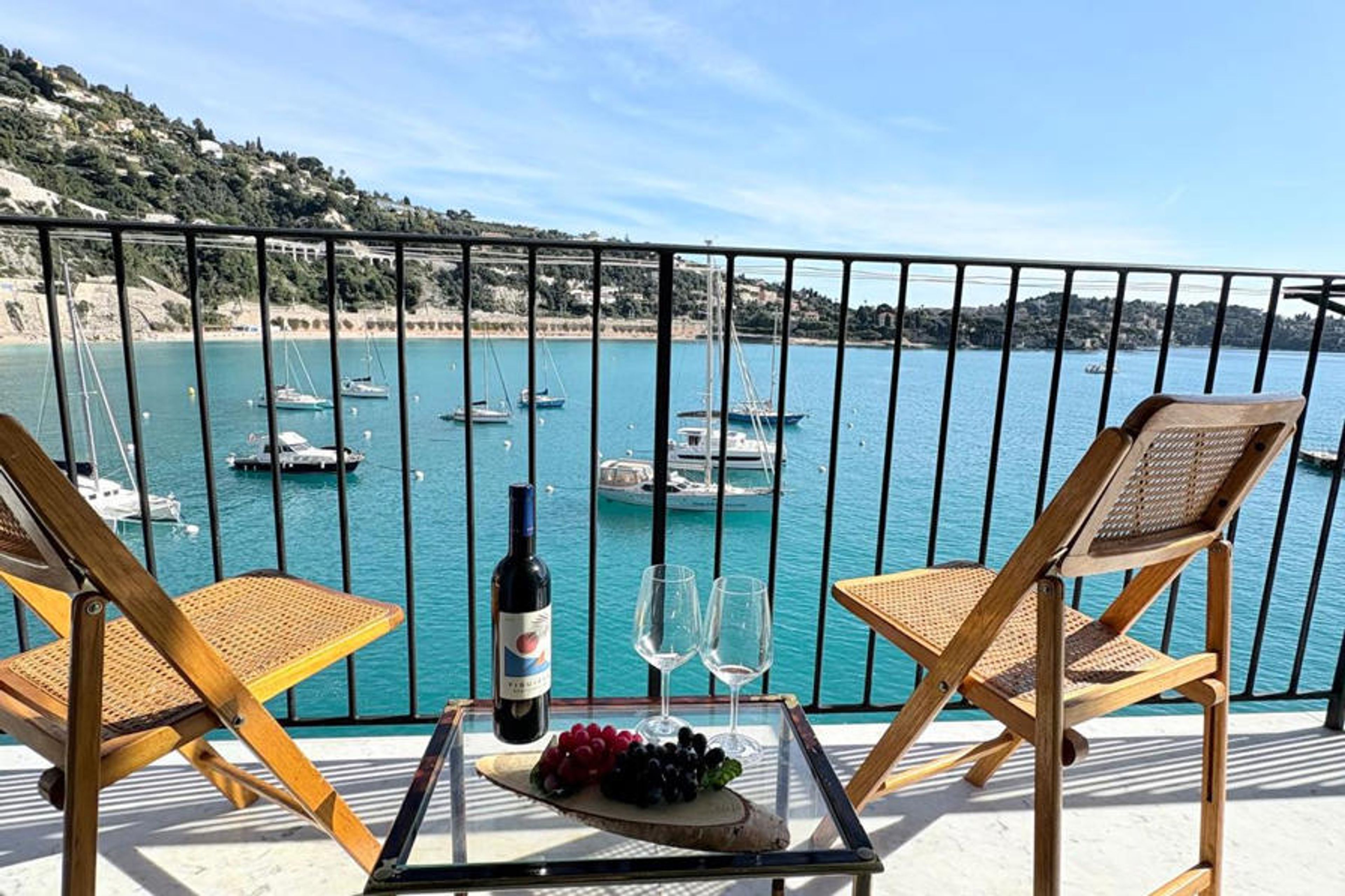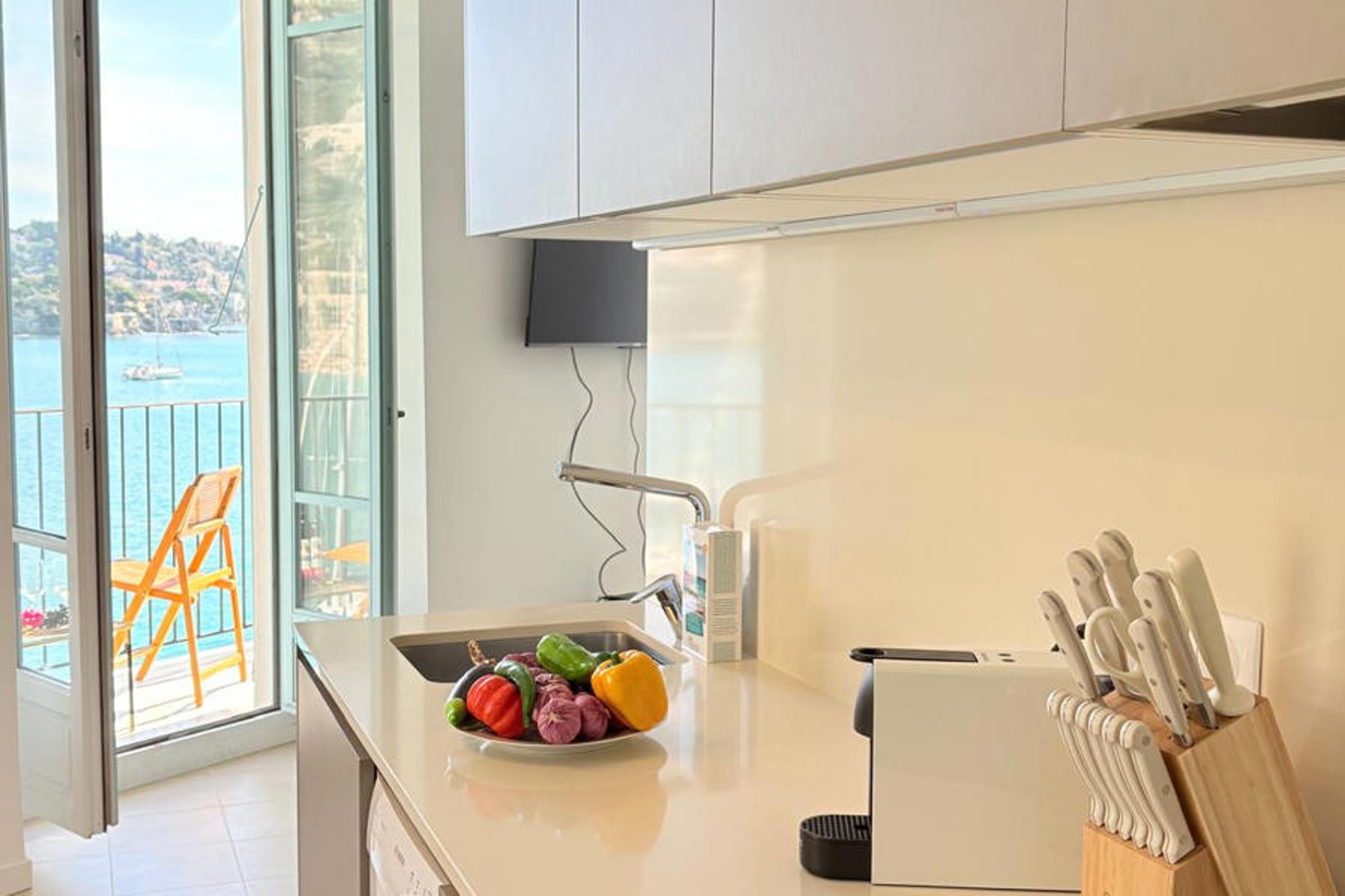A living room/dining room with an equipped kitchen area including: dishwasher, fridge, hob, etc. Dining table, also a sofa bed for 1 person overlooking a balcony with a view of the bay of Villefranche sur Mer. Change of scenery guaranteed!
