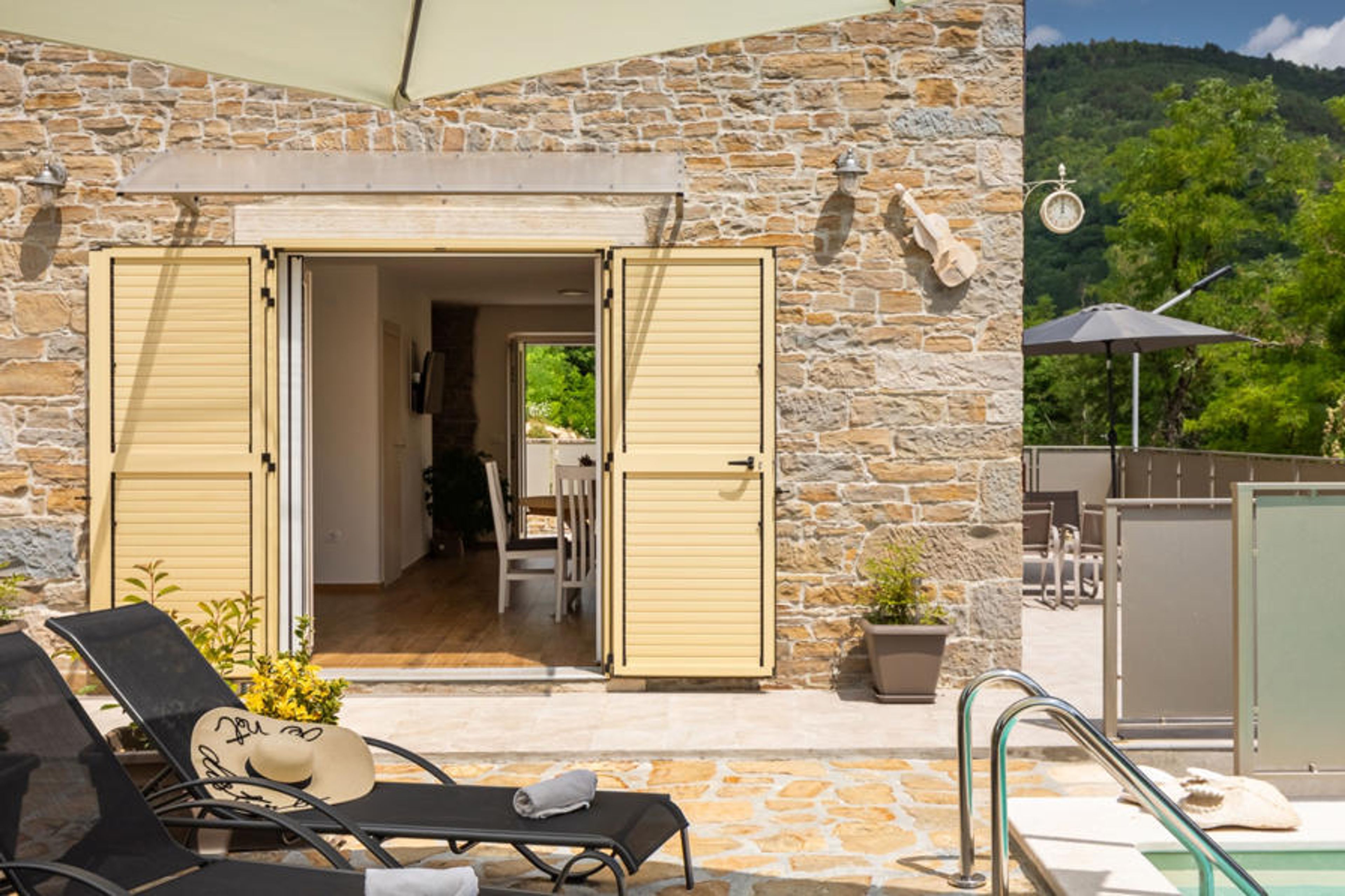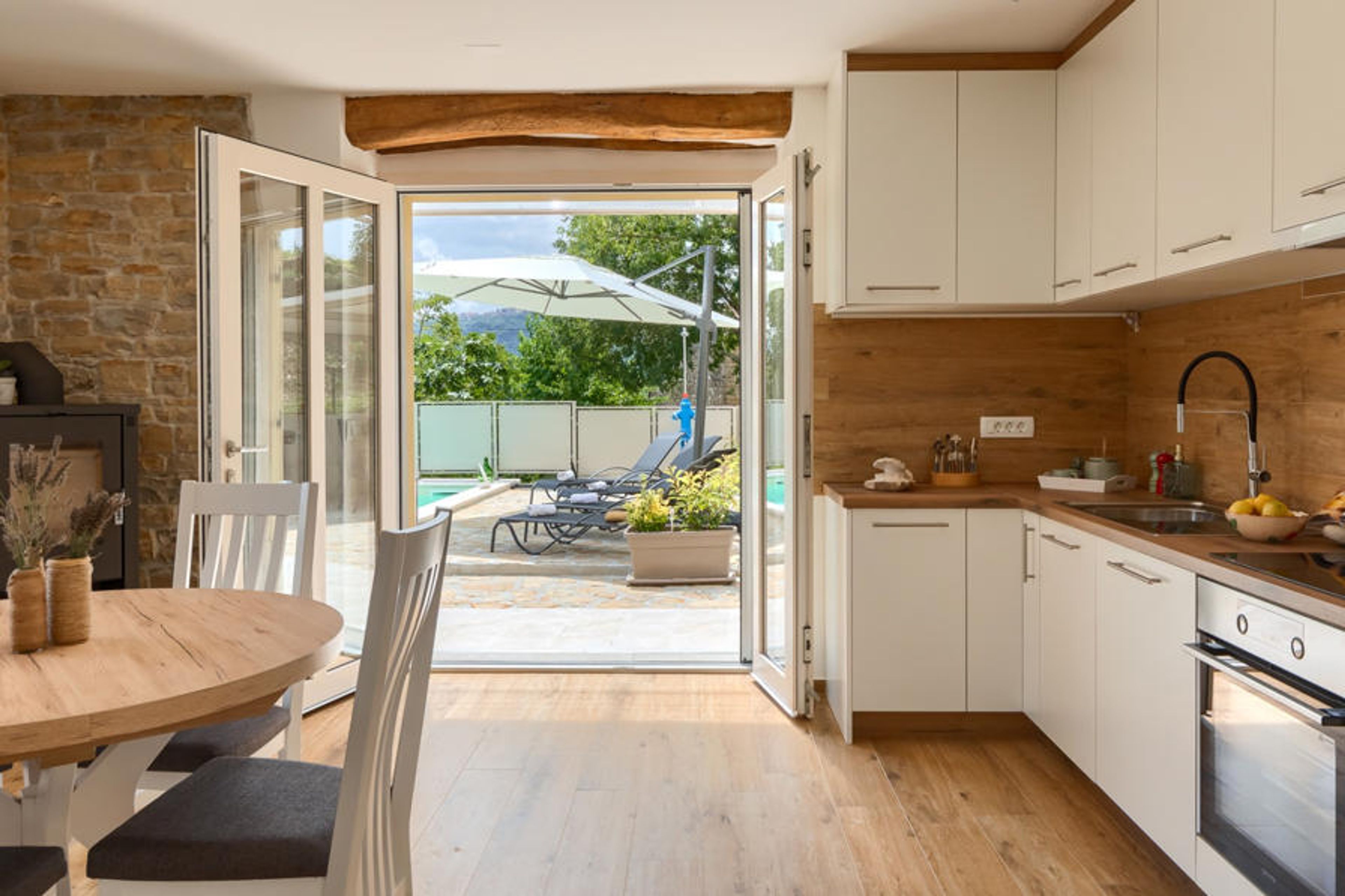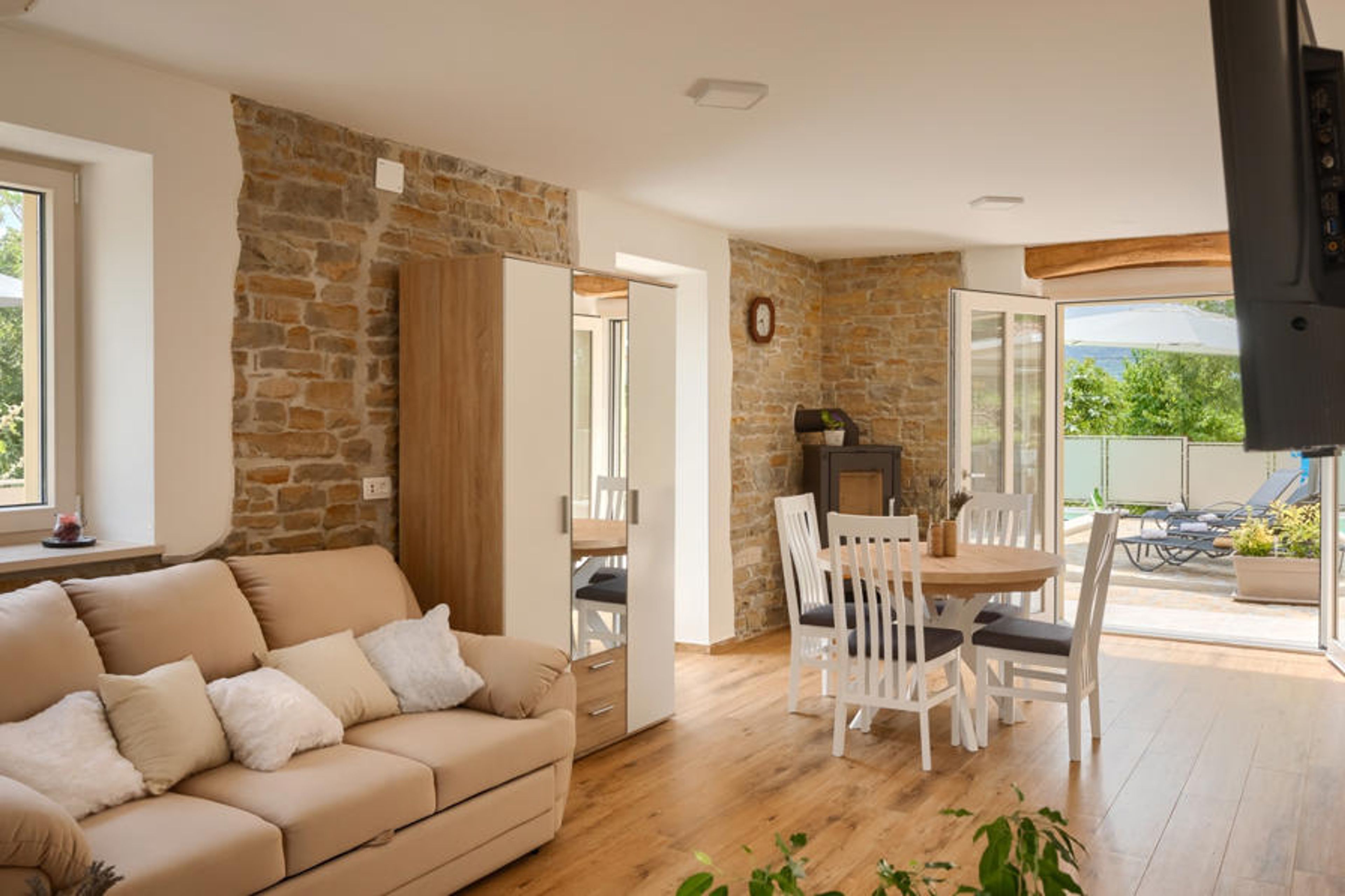 Casa Mavretići is surrounded by a garden of 400 m², which consists of an outdoor terrace with a swimming pool and no less than 3 lounge areas. Next to the pool there are 4 deck chairs for sunbathing and relaxing, and right next to it, there is a covered terrace with dining table and barbecue. Along the side of the house there is another seating area with garden furniture. With so much space to relax and socialize, your stay at this villa will be truly unforgettable. Breakfast by the pool, barbecue lunch, candlelight dinner under the stars - you don't have to choose, you can do it all in this villa. An added bonus is the view of the endless greenery that surrounds the villa, which will provide a true retreat for both body and soul.