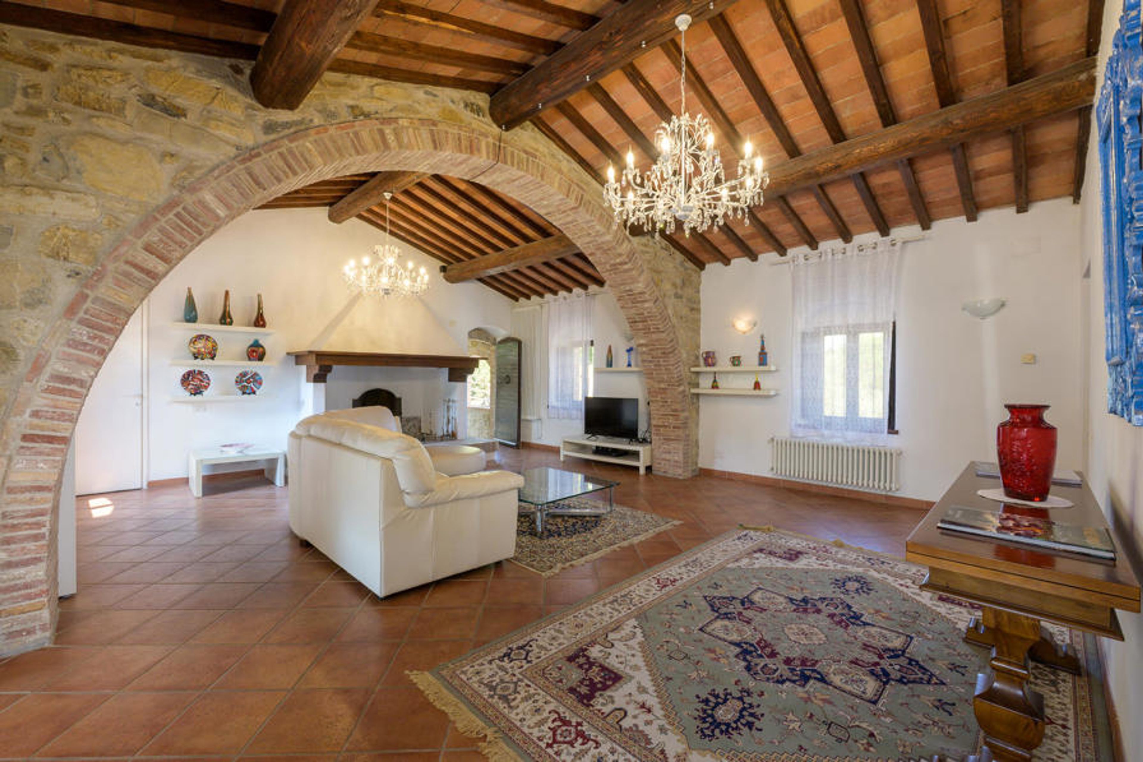 Enjoy a relaxing break and be enchanted by the picturesque surroundings of this traditional stone house. Nestled in a green hilly landscape, the house offers a wonderful retreat for your next holiday in Tuscany. The cosy living area with rustic wooden furniture creates a comfortable atmosphere in which you will immediately feel at home.
