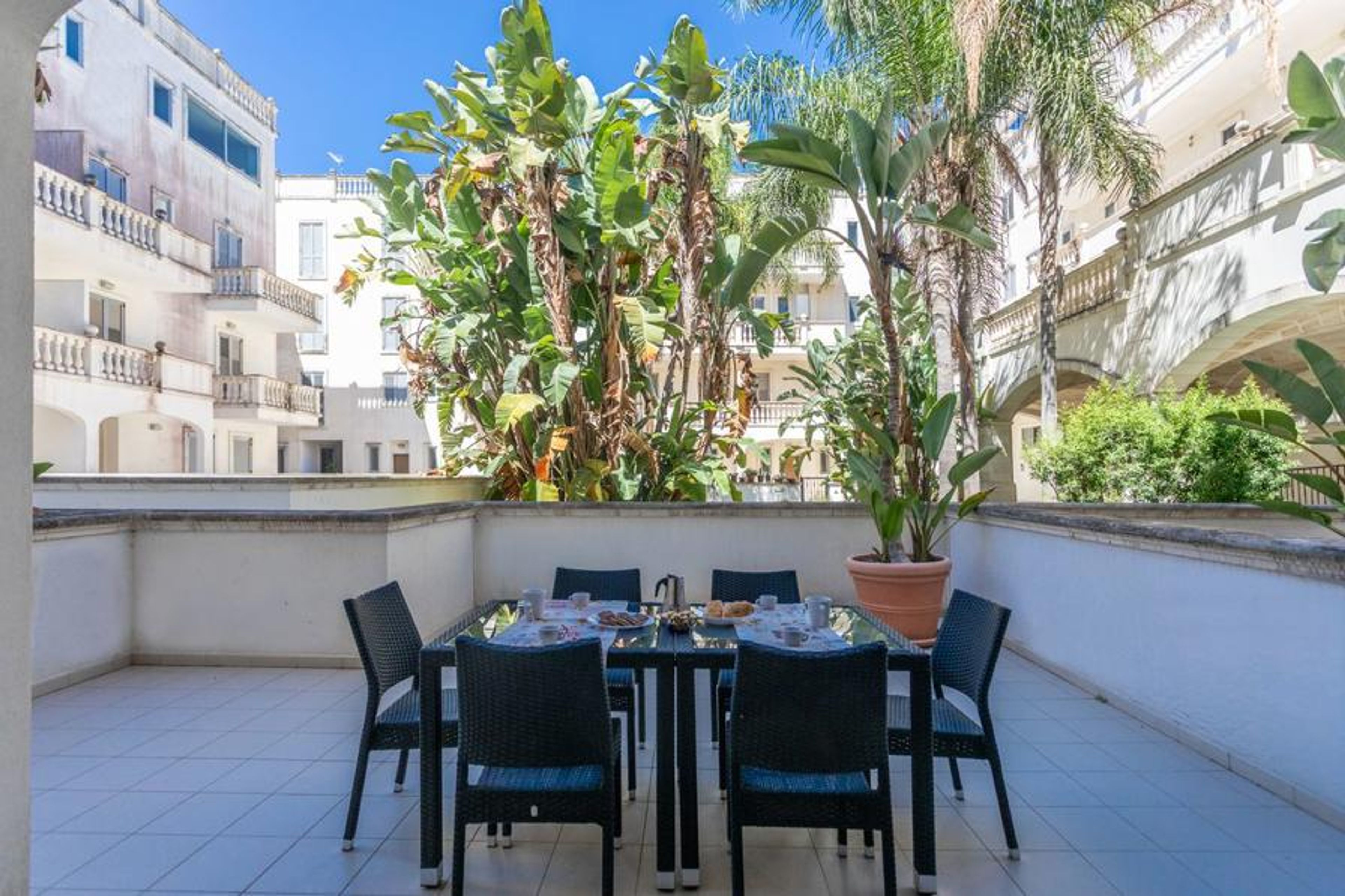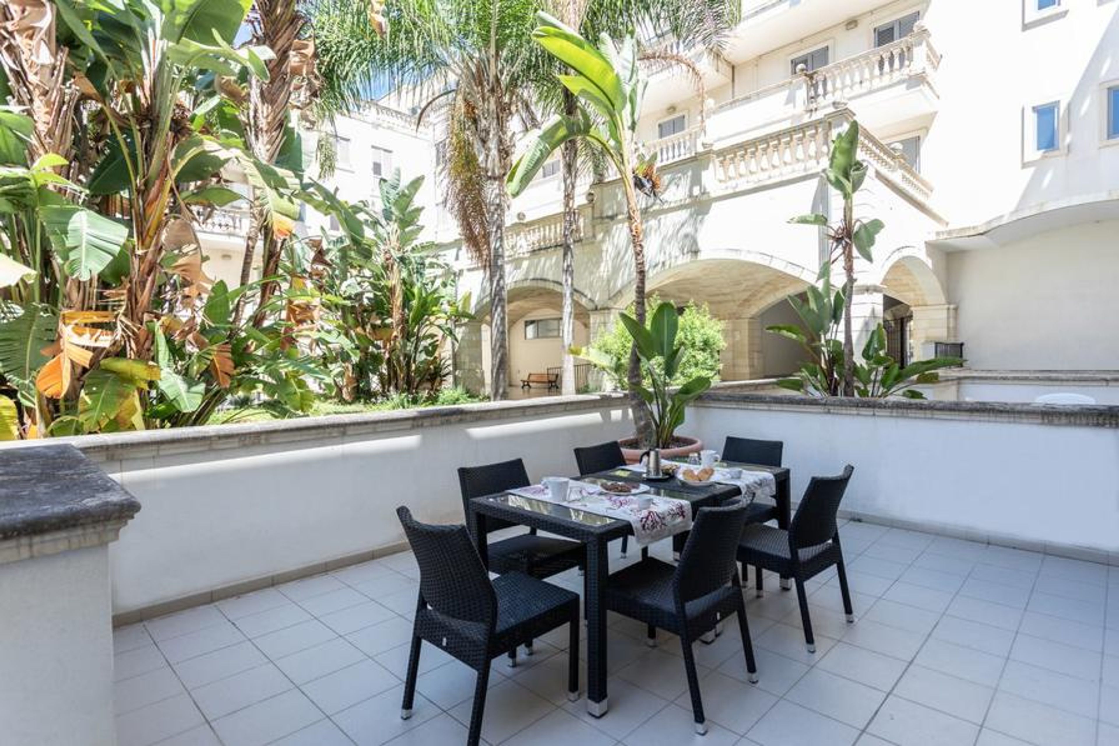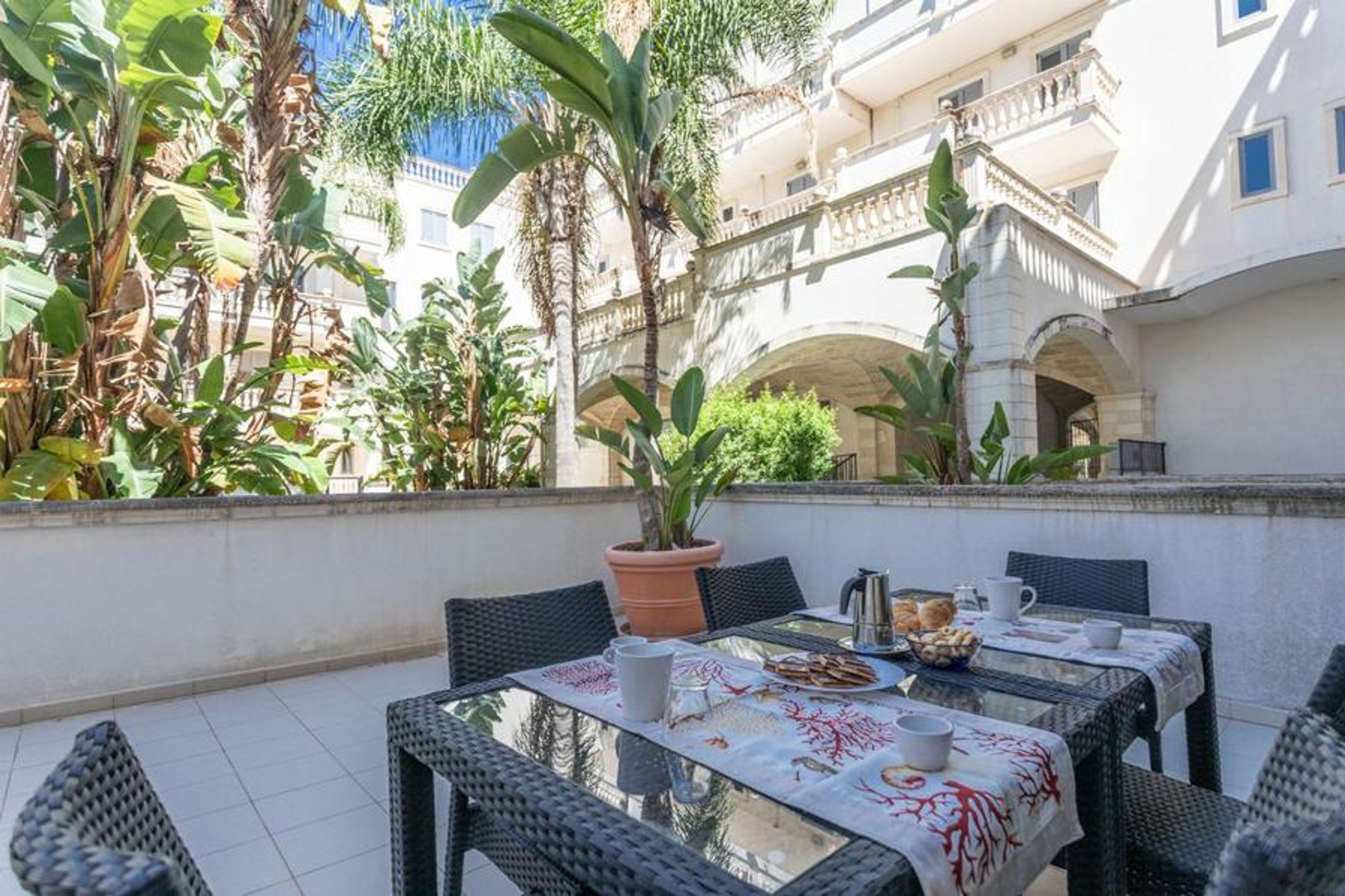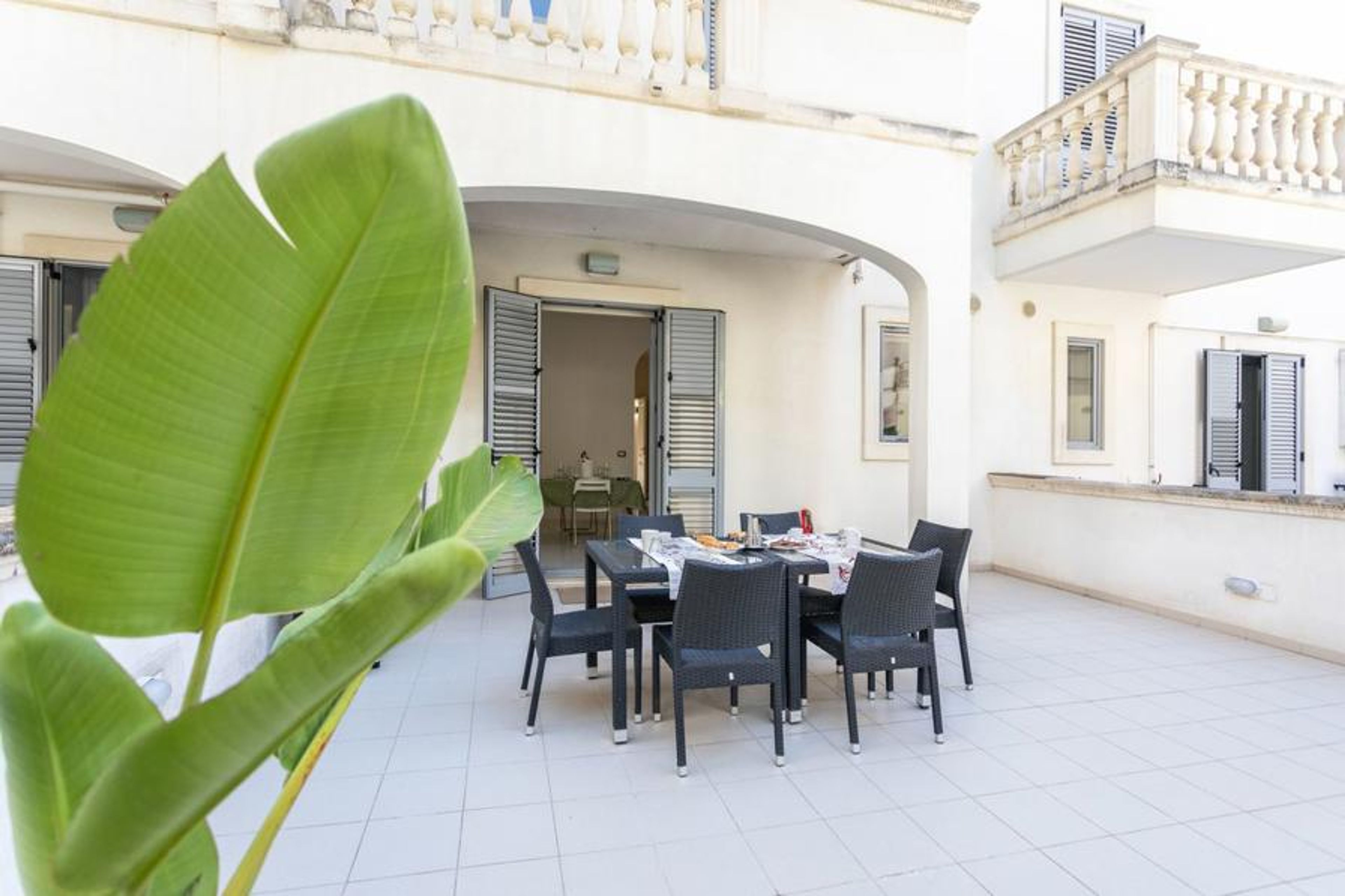 Quadrilocale Corso Italia 29 - Salento Reservation is located on the ground floor and is an excellent choice for those looking for comfortable and well-positioned accommodation in Gallipoli. The apartment is situated in the heart of the city, just a few steps from the historic center and the most beautiful beaches of Salento, making it perfect for those who want to explore the city without giving up the sea. The apartment, served by both an elevator and stairs, is spread over two floors. On the ground floor, there is a living room with a dining table and chairs, a comfortable sofa, a kitchenette, a bathroom with a shower, and an outdoor space both at the front and rear, equipped with garden furniture. On the first floor, there are three double bedrooms and two bathrooms, one with a shower and one with a bathtub. The apartment also features a reserved parking space on the -2 floor with direct access to the apartment, a dishwasher, an electric stove, a washing machine, air conditioning in all rooms, and free Wi-Fi internet access. Located in the upper part of Gallipoli, the refined and elegant Corso Italia residential complex overlooks one of the city's main and central streets, from which it takes its name, with an arcade featuring star-vaulted ceilings and columns made of Leccese stone and carparo. The strategic location of the residence allows easy access to the main exits of the fast road that leads to the most beautiful beaches along the coast, such as Samsara , Zen , Punta della Suina , and many others.