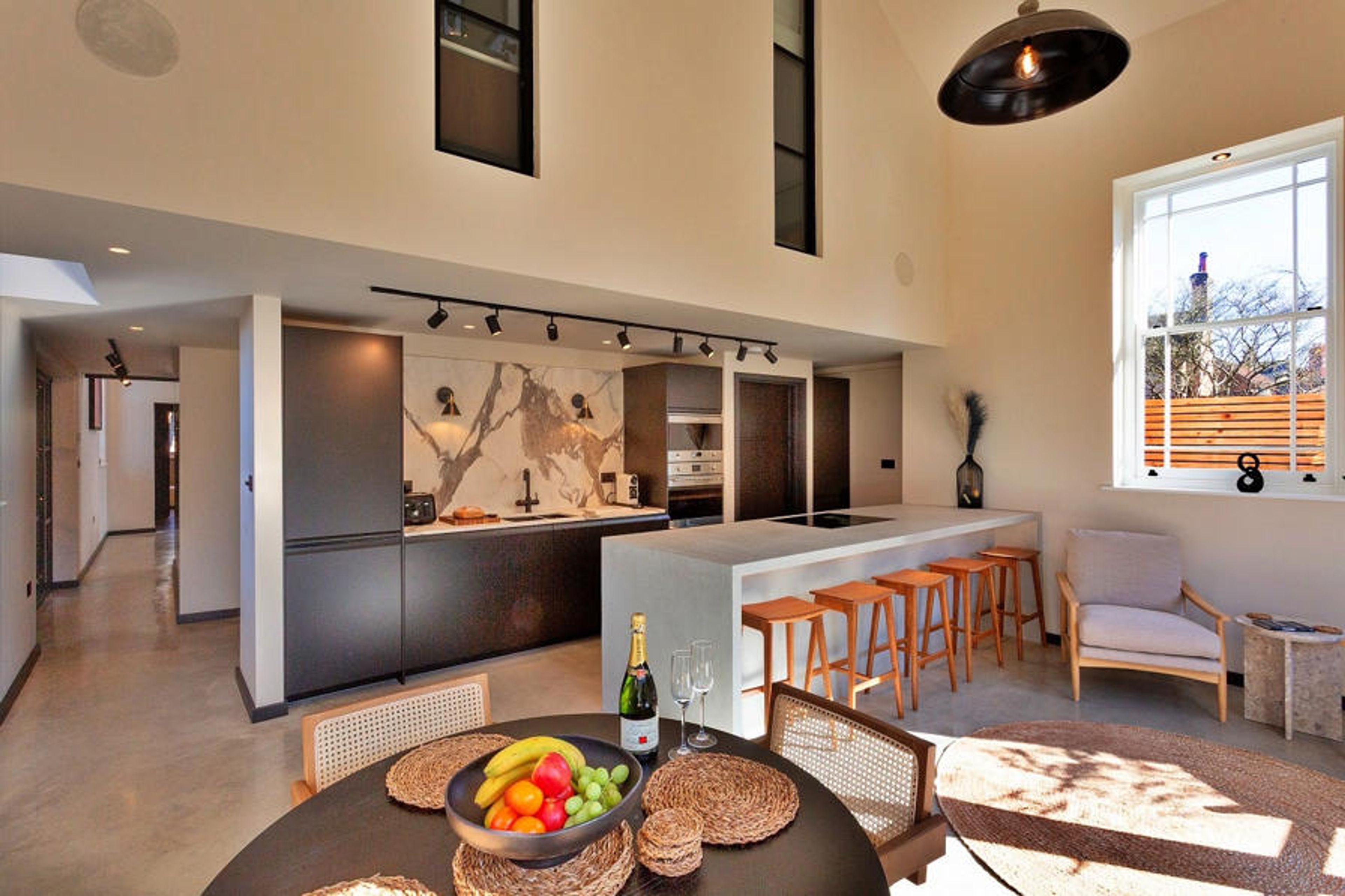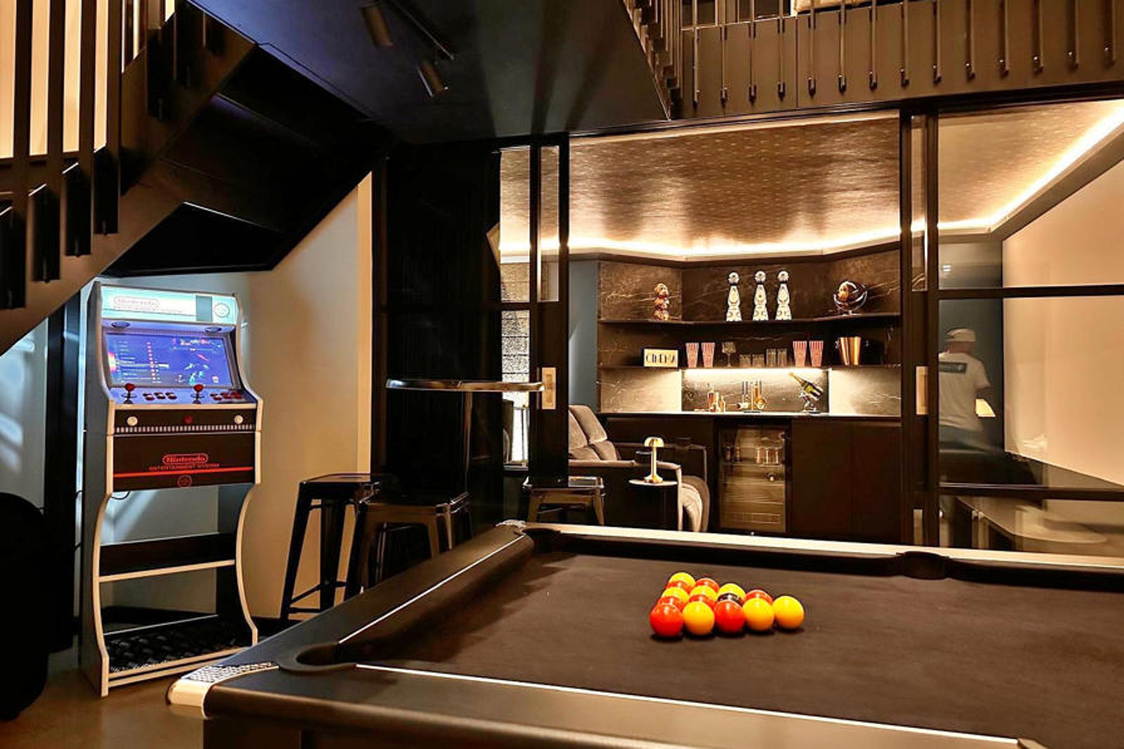 The open-plan layout features a fully equipped kitchen and dining space with high ceilings, contemporary finishes, and stylish furnishings that create a warm and inviting atmosphere. Guests can enjoy a cinema room for movie nights, a games room with an 80s-style arcade machine and pool table for endless fun, and a cosy snug room on the mezzanine—perfect for unwinding with a book or glass of wine.