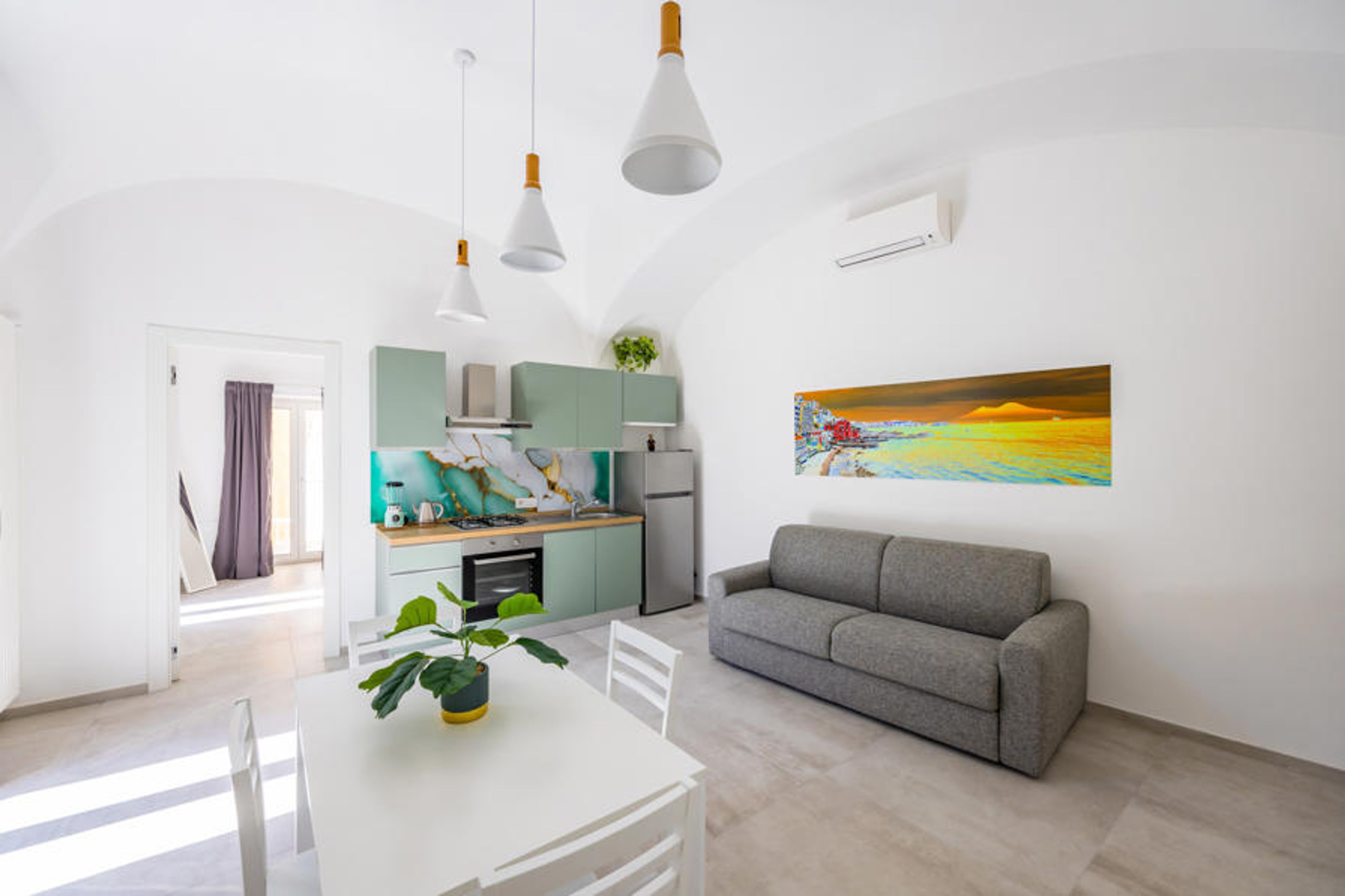 Maison Margherita (60 square meters) includes one bedroom, one bathroom and a cozy living room with kitchen.