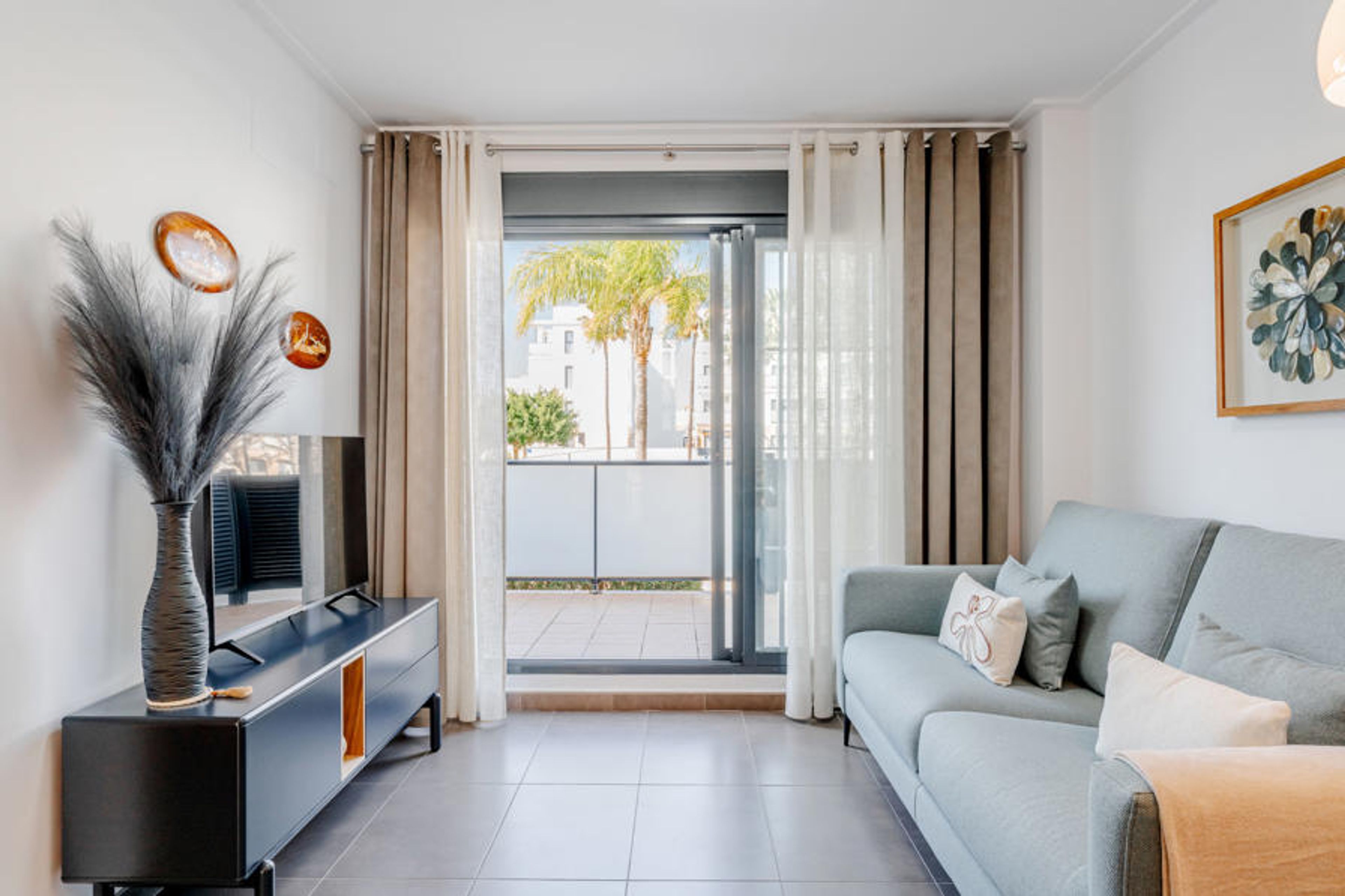 "Las Dunas Oliva Nova", 3-room apartment 60 m2. Spacious, very comfortable and stylish furnishings: living/dining room with satellite TV, air conditioning and forced-air heating. Exit to the terrace, pergola. 1 room with 1 french bed (160 cm, length 200 cm), shower/WC, air conditioning and forced-air heating. Exit to the terrace. 1 room with 1 double bed (2 x 80 cm, length 190 cm), air conditioning and forced-air heating. Open kitchen (oven, dishwasher, 2 ceramic glass hob hotplates, toaster, microwave, freezer, electric coffee machine, Capsules for coffee machine (Nespresso) extra). Shower/WC. Large terrace 20 m2, south facing position, large terrace 18 m2, north facing position. Terrace furniture, covered balcony, sitting area. View of the swimming pool and the garden. Facilities: washing machine, iron, hair dryer. Internet (WiFi, free). Garage space n 134. Please note: There is a padel court available. CV-VUT0059233-V