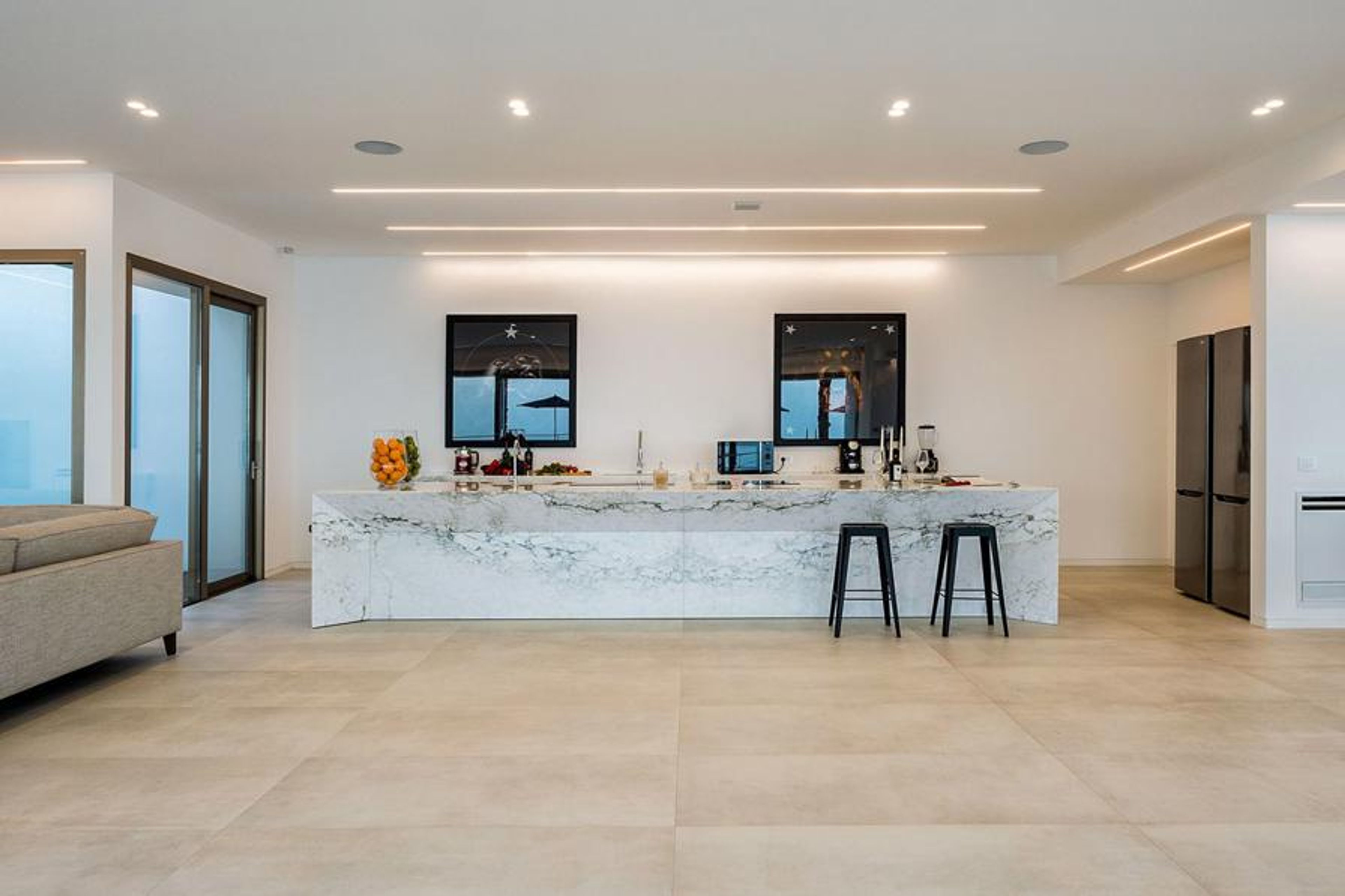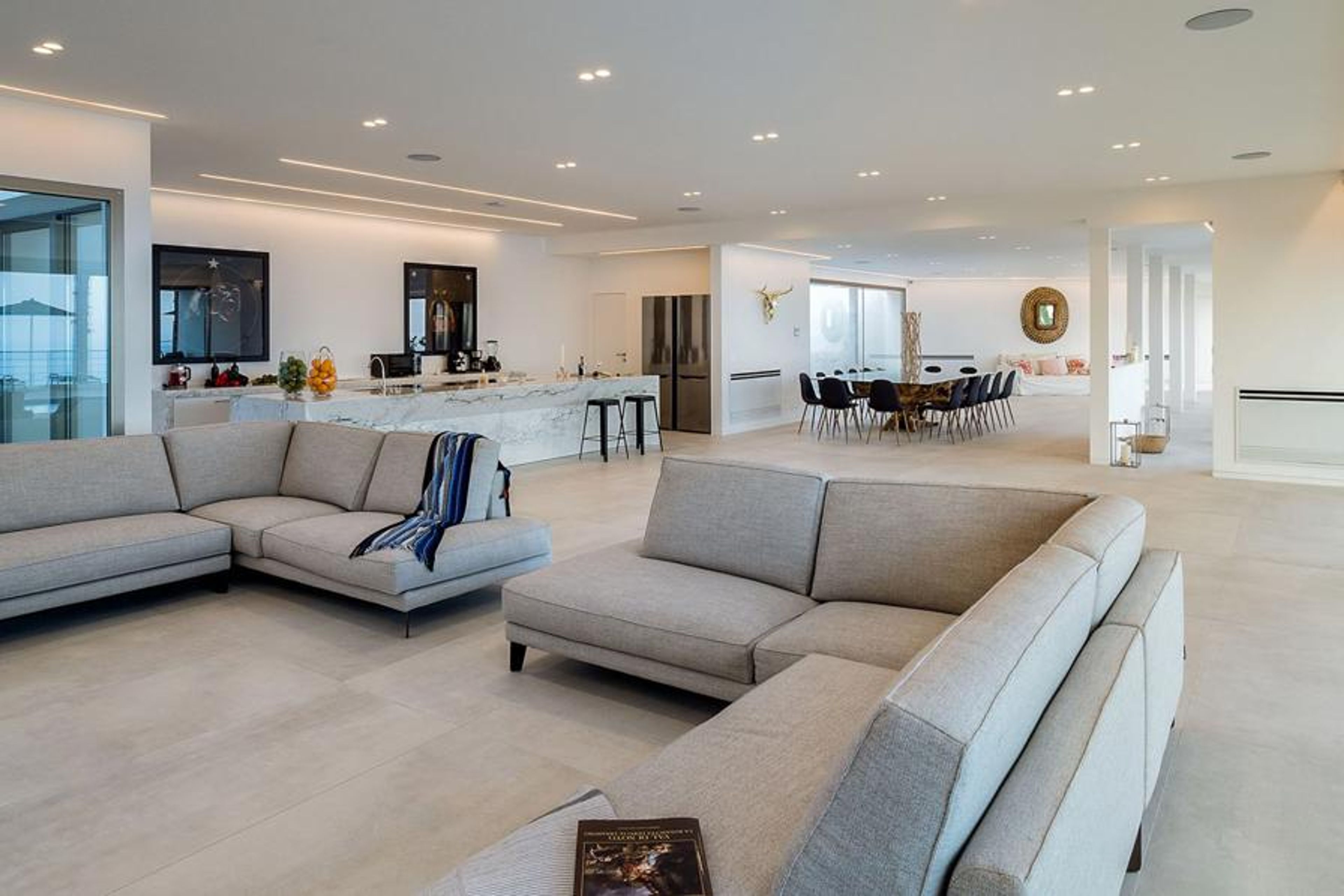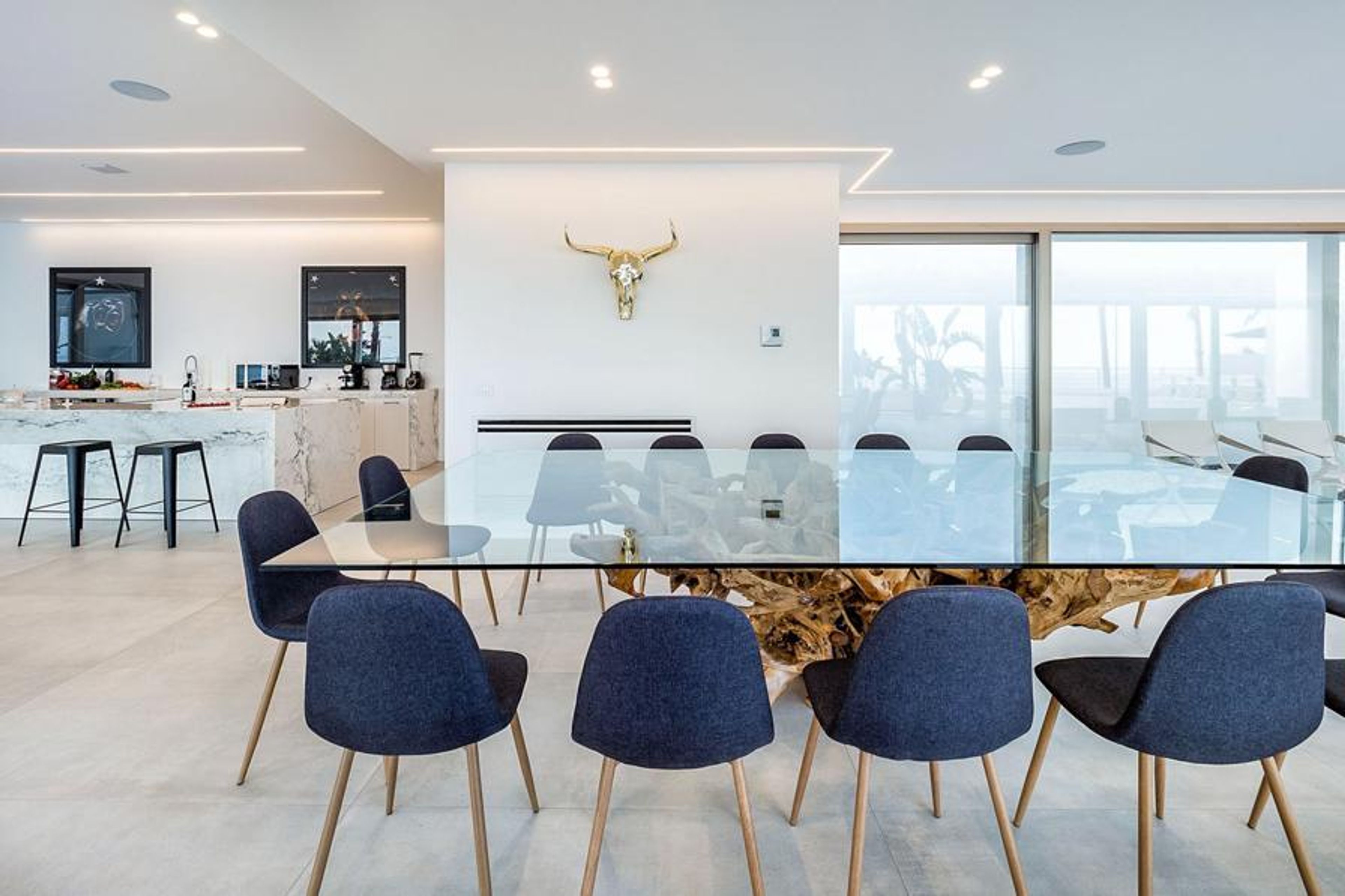 Spread across three levels and over 500 square metres, the villa's interiors are sleek and contemporary, furnished with high-quality designer pieces. The ground floor features a large open-plan living space with a TV area, dining space, modern kitchen, guest bathroom, and three en-suite double bedrooms. The first floor hosts two further en-suite bedrooms, including a King-sized master. Two additional double bedrooms with en-suite showers on the lower level offer privacy and comfort.
