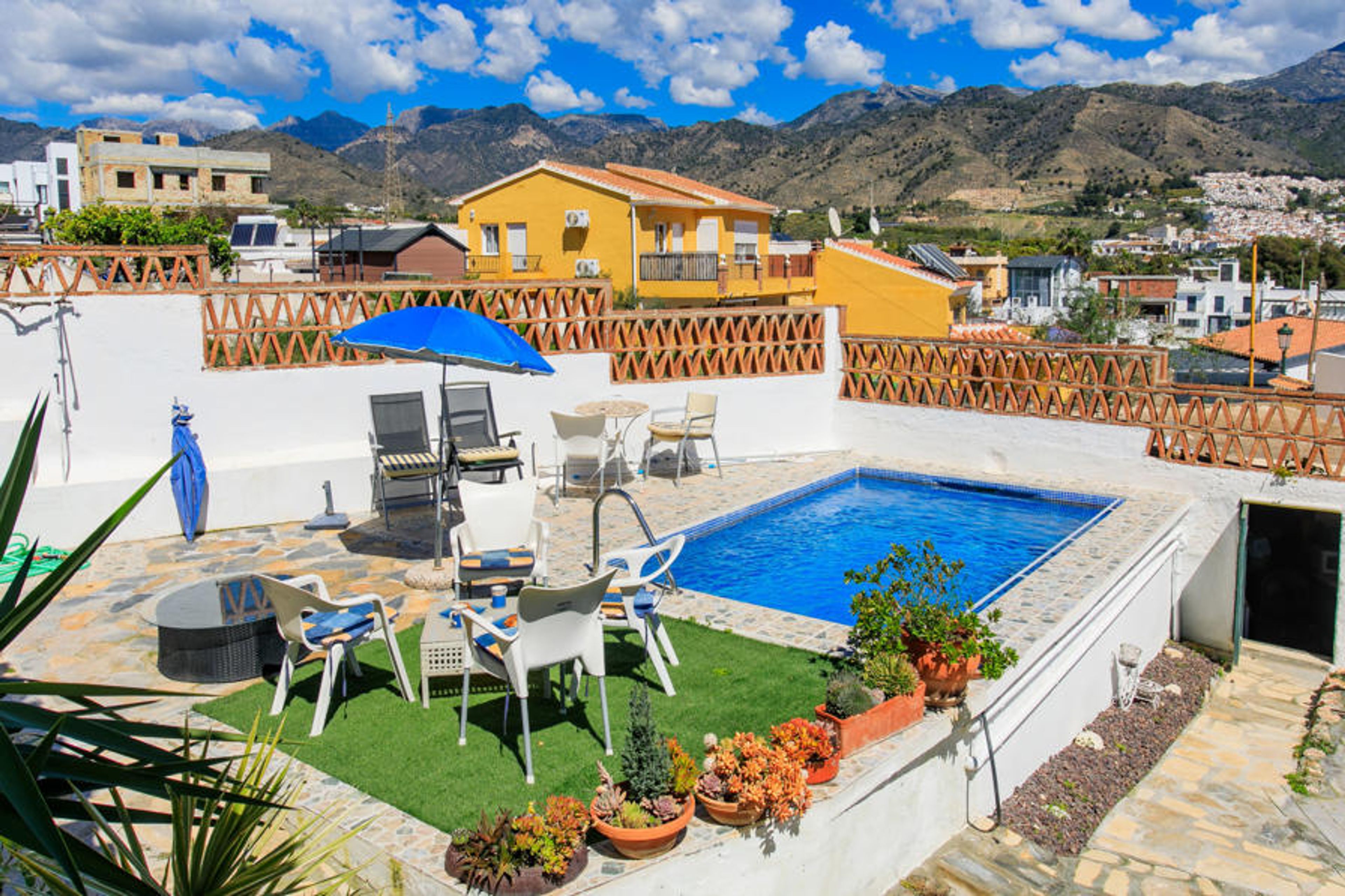 Beautiful, simple farmhouse "Celia Luise", detached. In the resort 1 km from the centre of Nerja, in a quiet, sunny position. Private: swimming pool (8 x 2 m, depth 100 - 175 cm, seasonal availability: 01.Jan. - 31.Dec.). Patio, pergola, garden furniture, barbecue, parking. Shop 500 m, shopping centre 2.3 km, bakery 100 m, bus stop 150 m, sandy beach "Burriana" 2.5 km, diving center 2.5 km. Sports harbour 17 km, golf course (18 hole) 20 km, sailing school 17 km, tennis 2 km, walking paths from the house 3 km. Nearby attractions: Cuevas de Nerja, Frigiliana, Acantilados de Maro, Museo de Nerja, Water park Aqua Velis, La Alhambra. Well-known ski regions can easily be reached: Sierra Nevada. Hiking paths: Sierra Tejeda, Sierra Almijara, Las Alpujarras. The owner does not accept any youth groups. Please note: Loading and unloading of baggage is possible at the holiday house.
