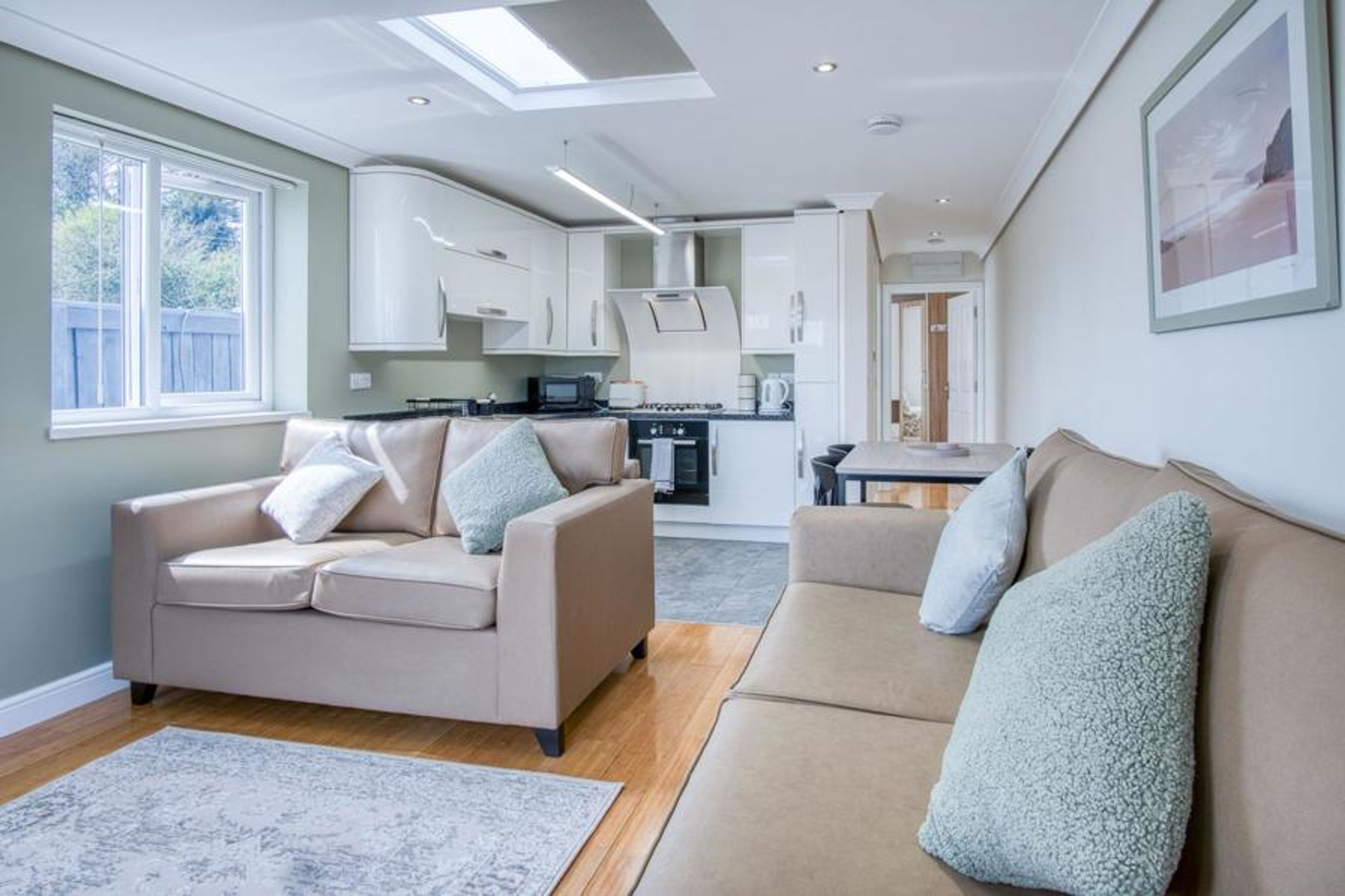 Nestled in the picturesque Ridgeway Park, Ridgeway Hideaway is a delightful one-bedroom holiday home designed for relaxation and comfort. You enter Ridgeway Hideway by a ramp making this property suitable for limited mobility. Upon entering you’ll be greeted by a warm and inviting open-plan living area that seamlessly combines the living, dining, and kitchen spaces. Unwind on the two cosy sofas while enjoying your favourite shows on the TV, or gather around the intimate dining table, perfect for romantic meals or cosy dinners.